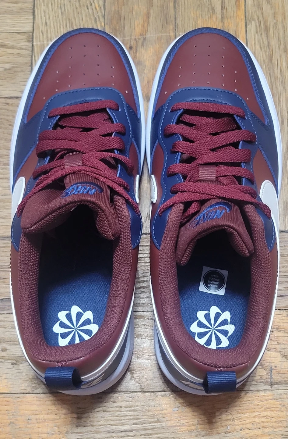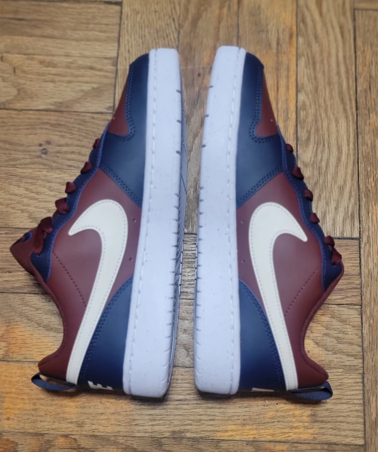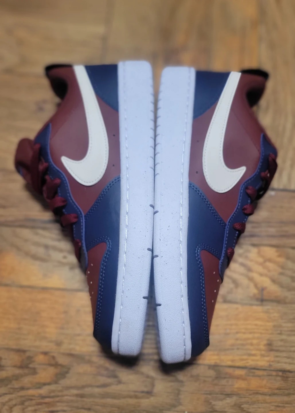 Nike Court Vision Low sneakers in a maroon, navy, and cream colorway. Features a perforated toe box and signature Nike swoosh. Made in Vietnam. Size US 7Y.