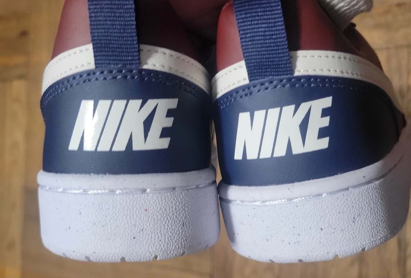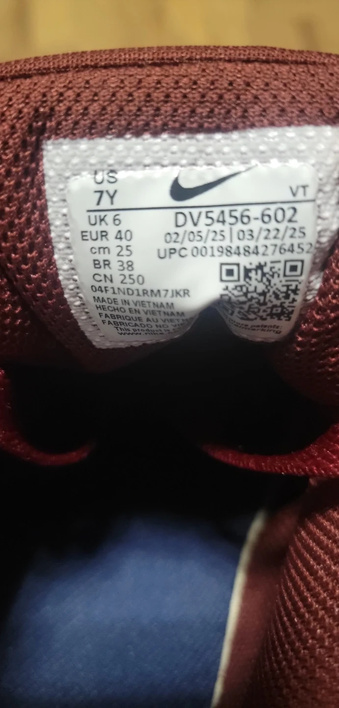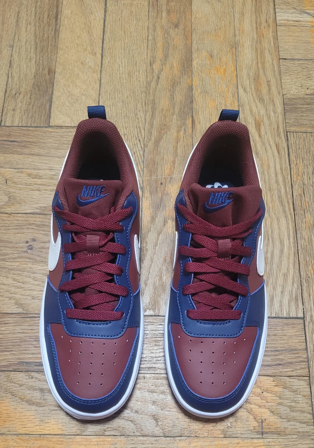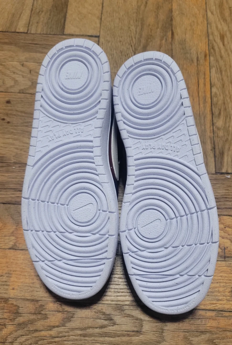 Nike Court Vision Low sneakers in a maroon, navy, and cream colorway. Features a perforated toe box and signature Nike swoosh. Made in Vietnam. Size US 7Y.
