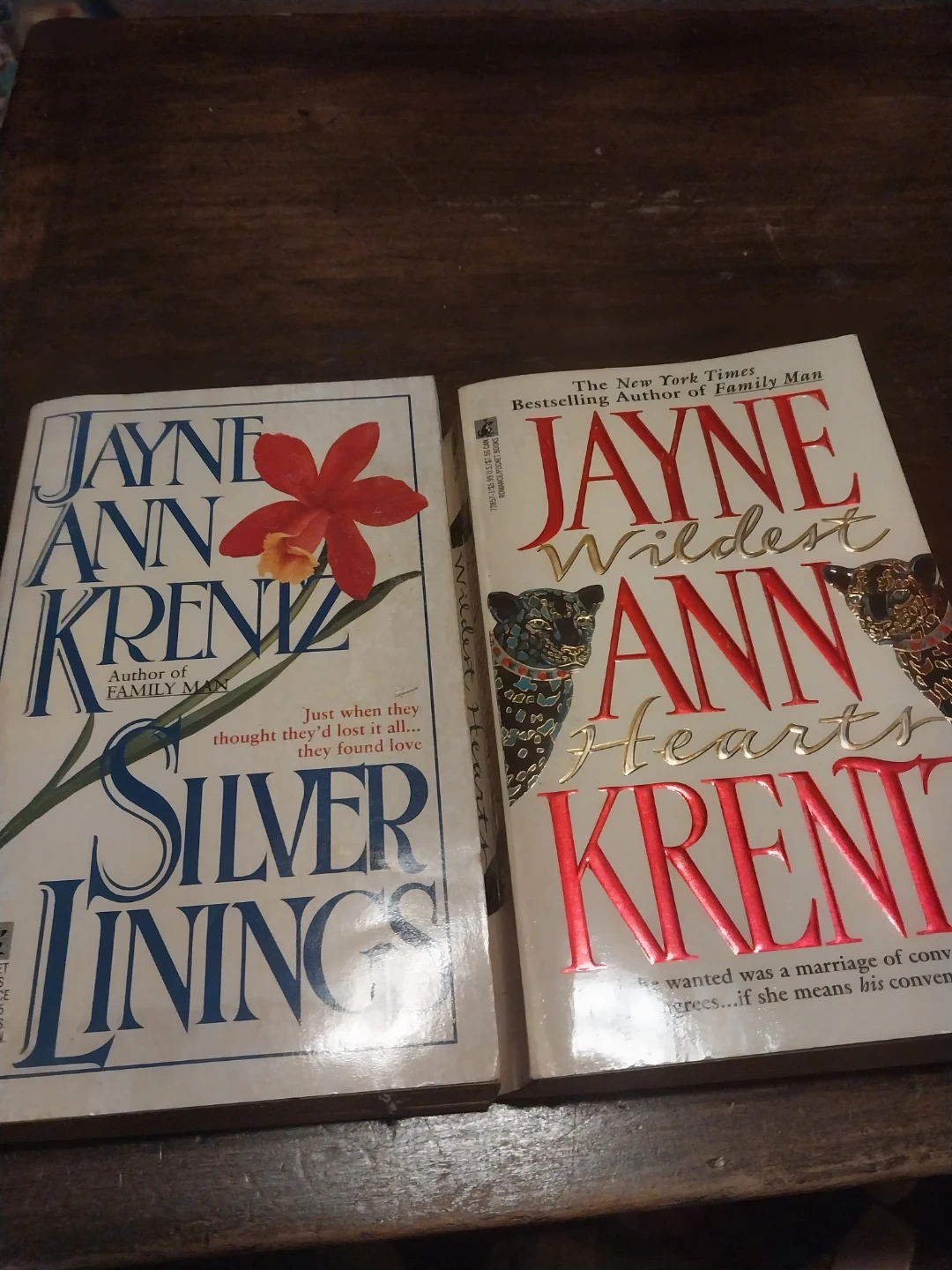 Two romance novels by Jayne Ann Krentz. 'Silver Linings' is by the author of 'Family Man'. 'Wildest Hearts' is from the New York Times bestselling author. Both are paperback books.