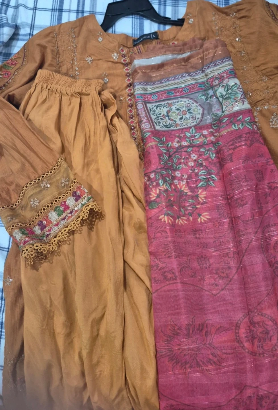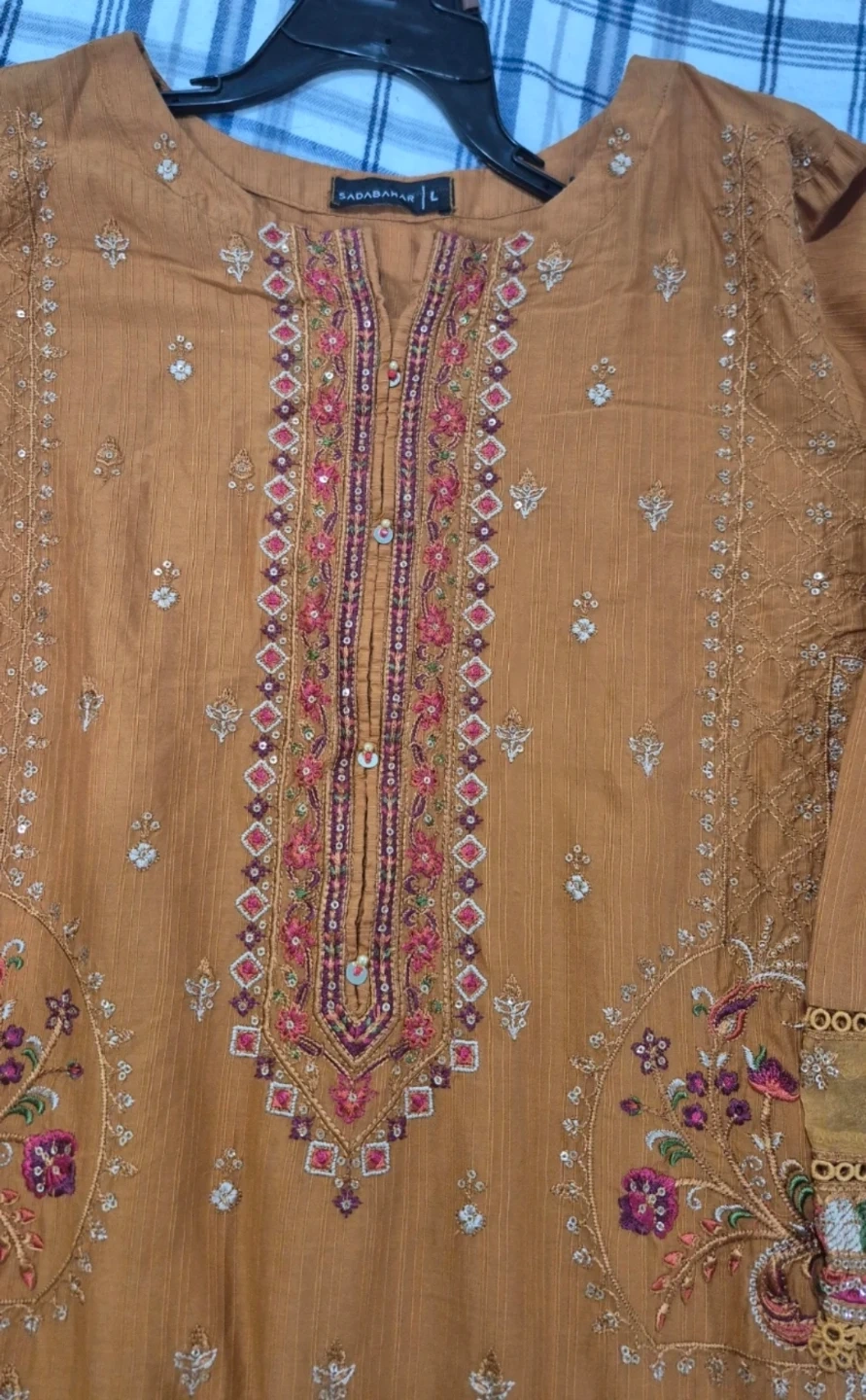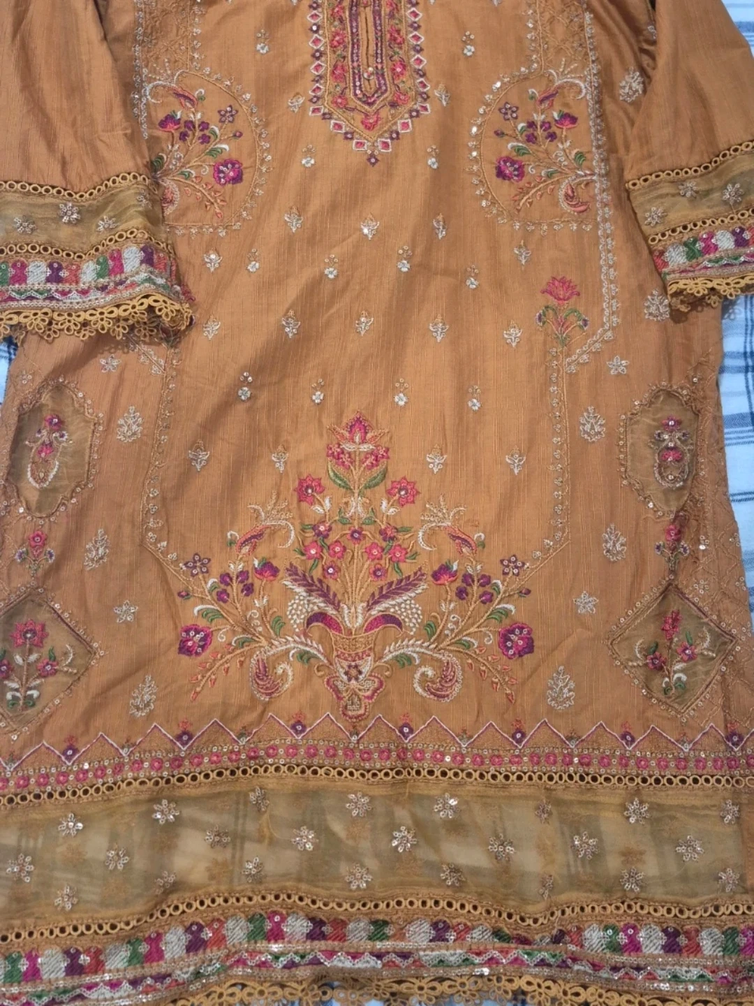 Brown embroidered kurti with matching pants. This outfit features intricate floral embroidery and decorative lace trim on the sleeves and hem.