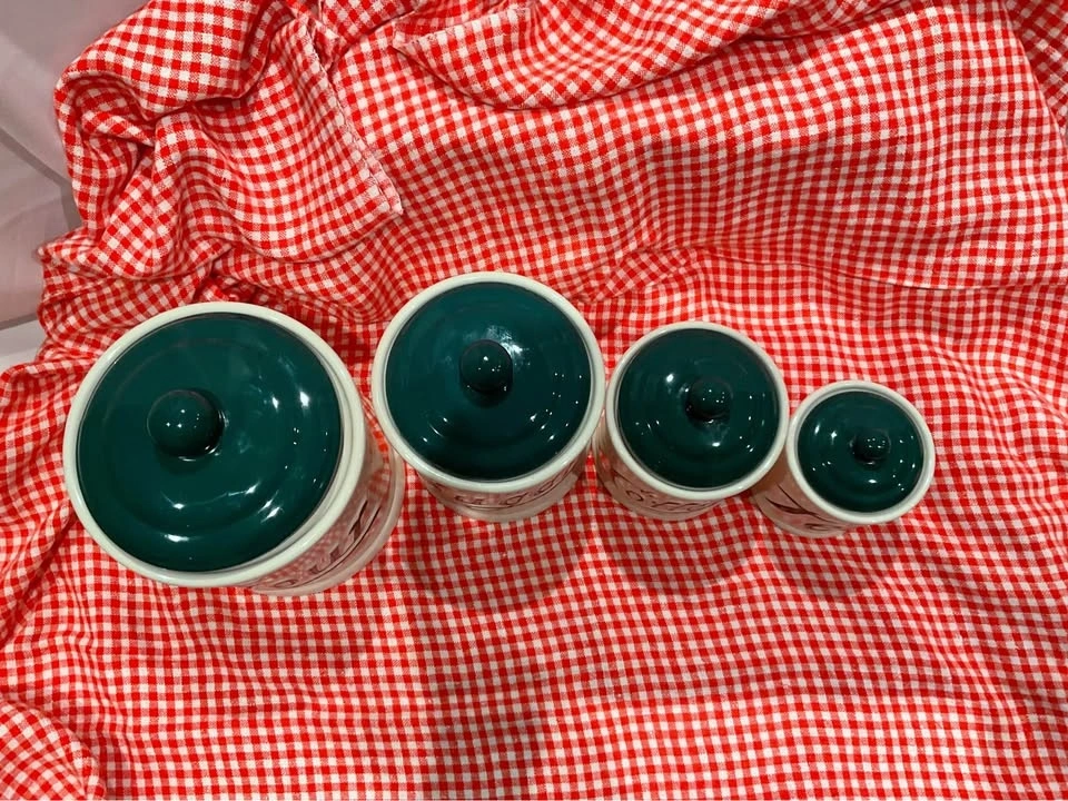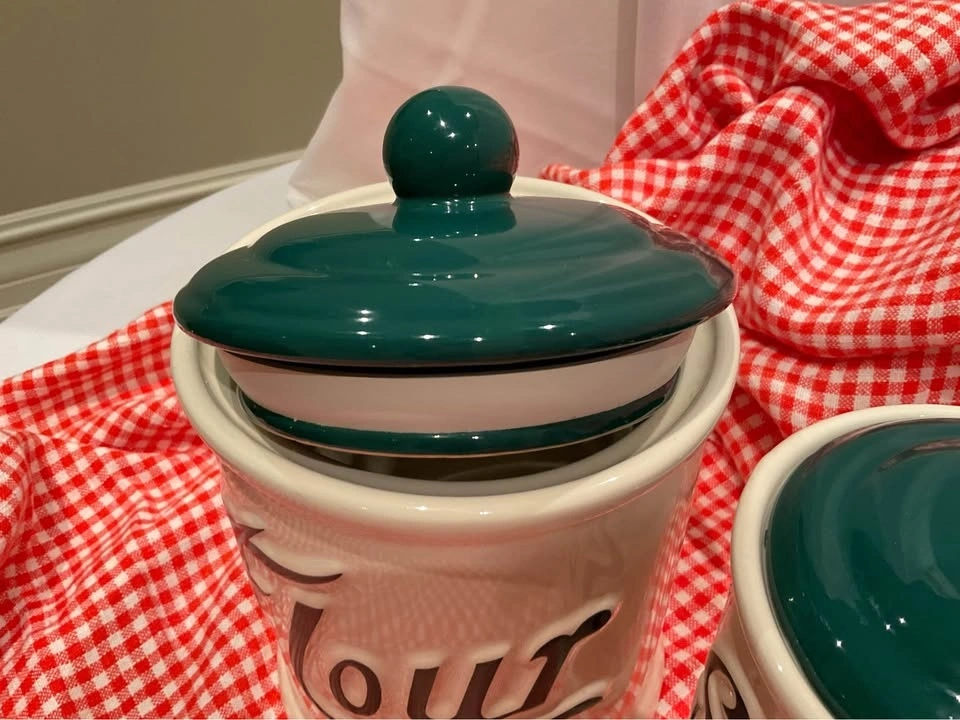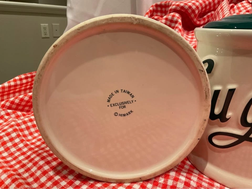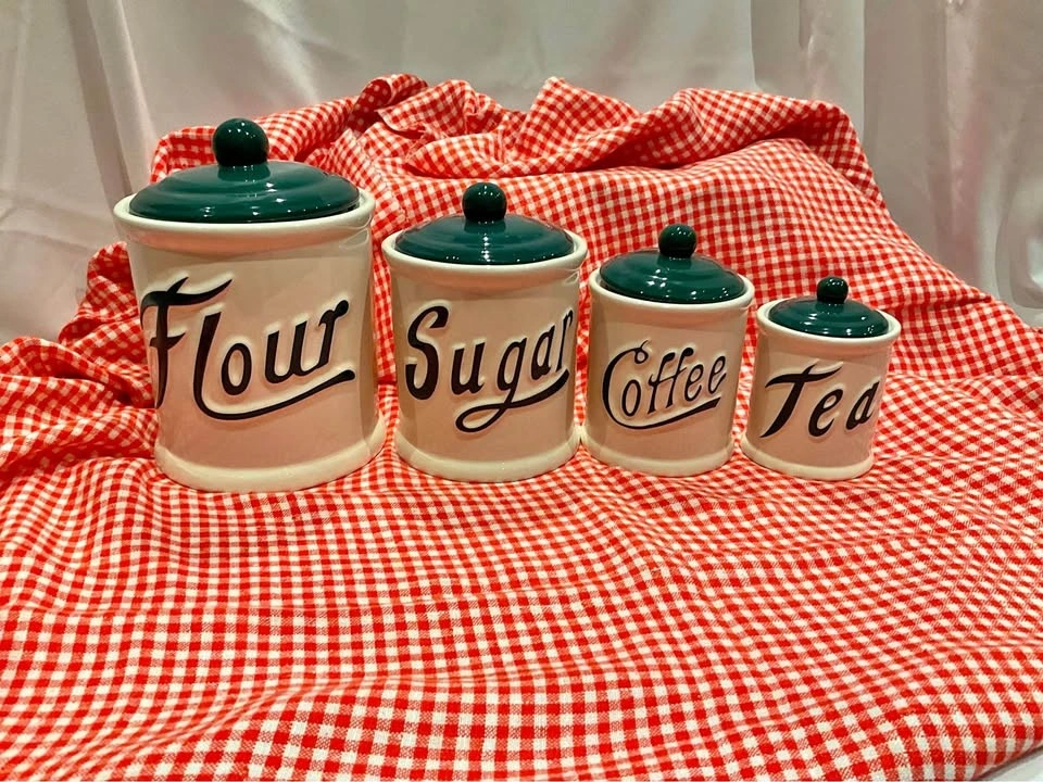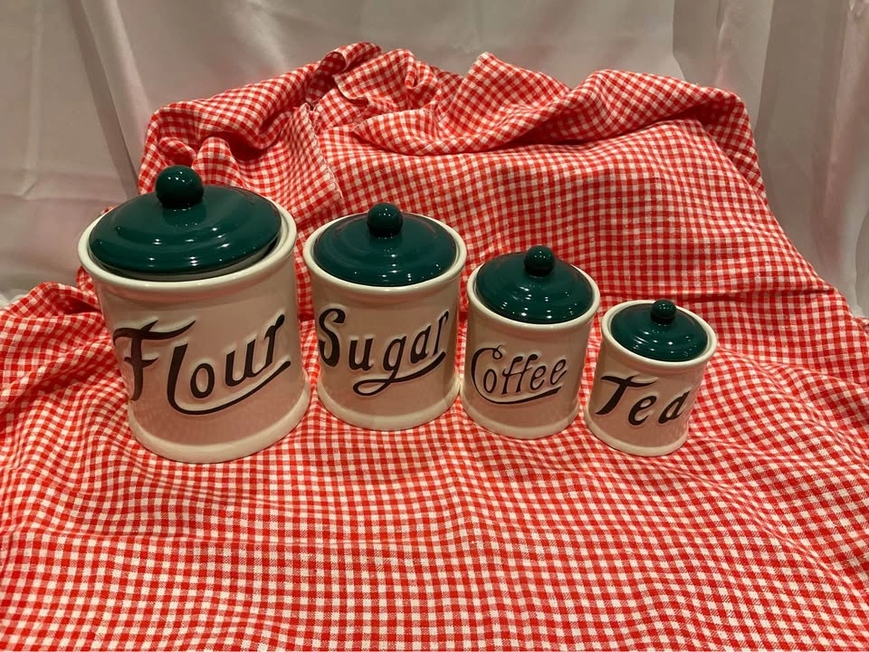 RARE set of all 4 vintage Himark Kitchen Canisters, made in Japan. Includes Flour (10" x 6 1/2"), Sugar (9" x 5 1/2"), Coffee (7" x 4 1/2"), and Tea (6" x 3 1/2"). In pristine condition with NO CHIPS OR CRACKS. From a smoke & pet-free home. Located in Richmond Hill near Bathurst & King Rd.
