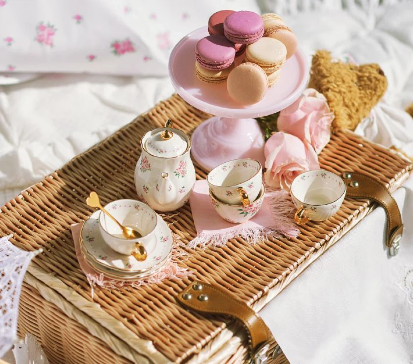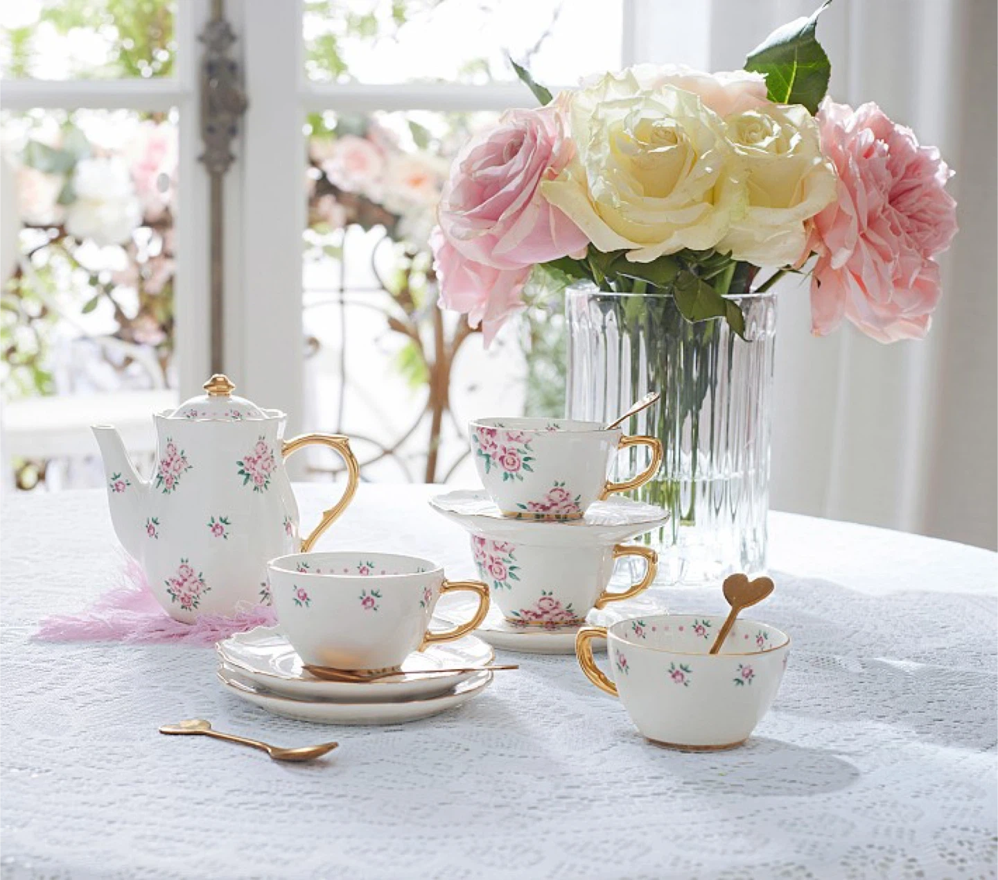 ✨ 4 teacups, 4 saucers, 4 spoons and 1 lidded teapot.