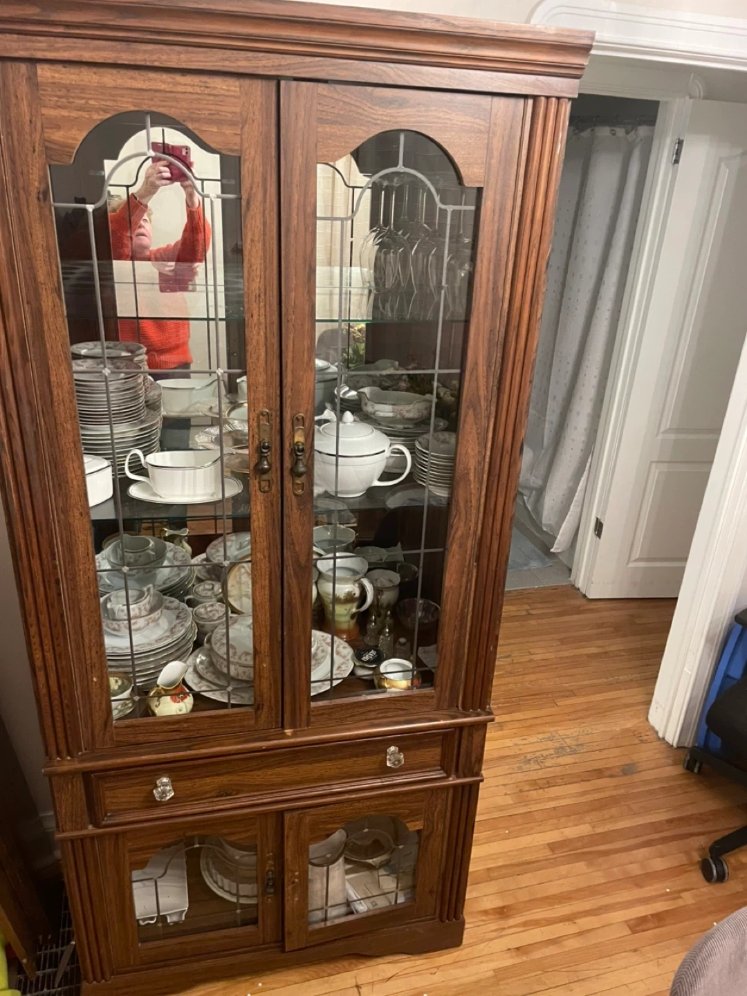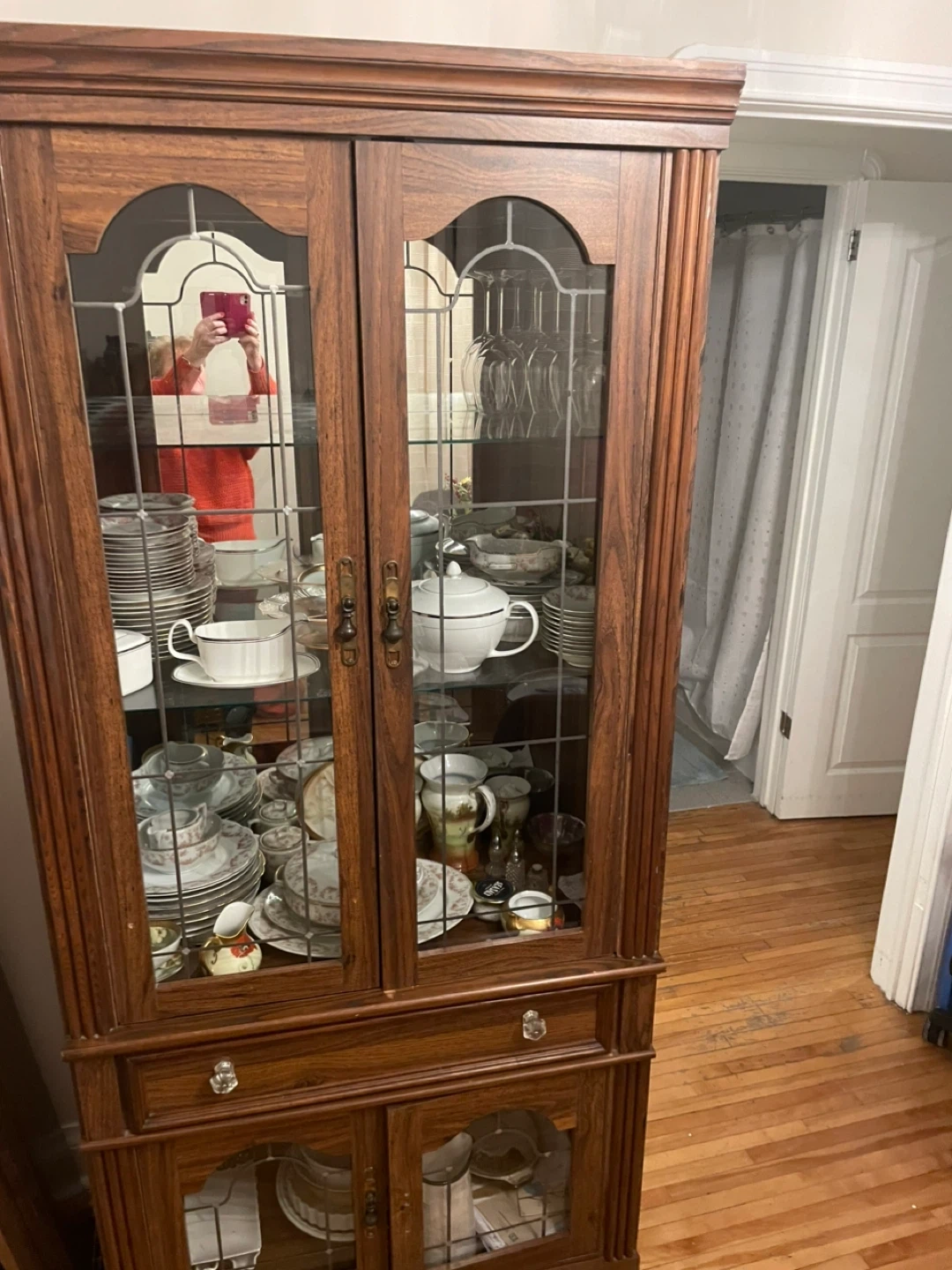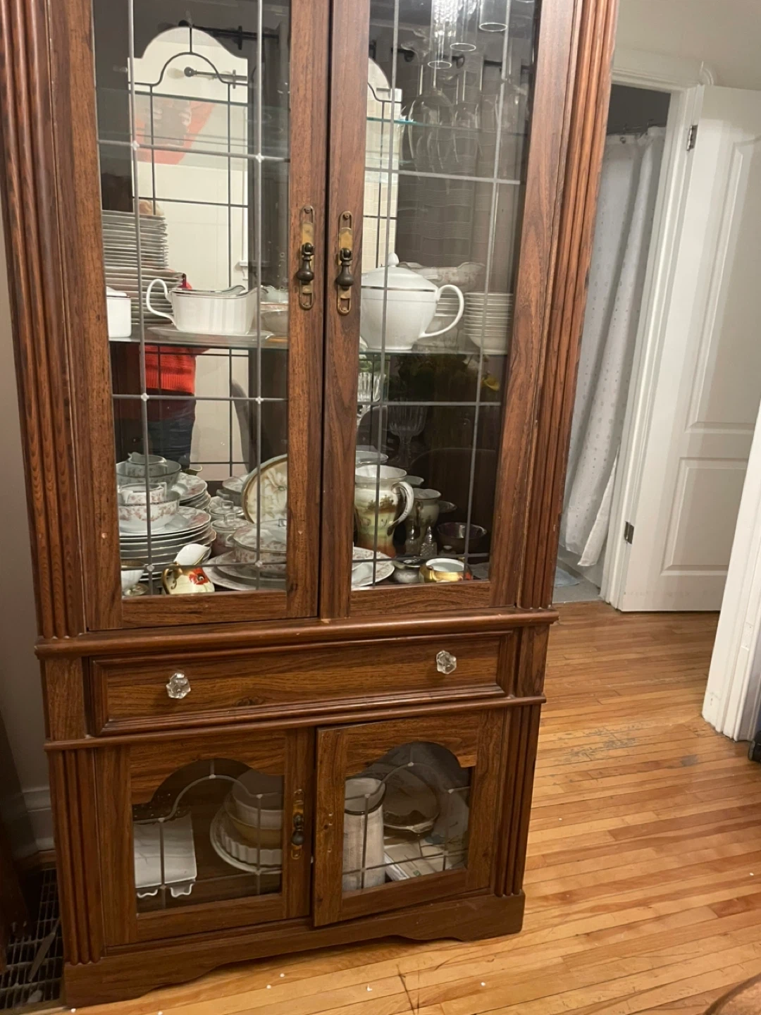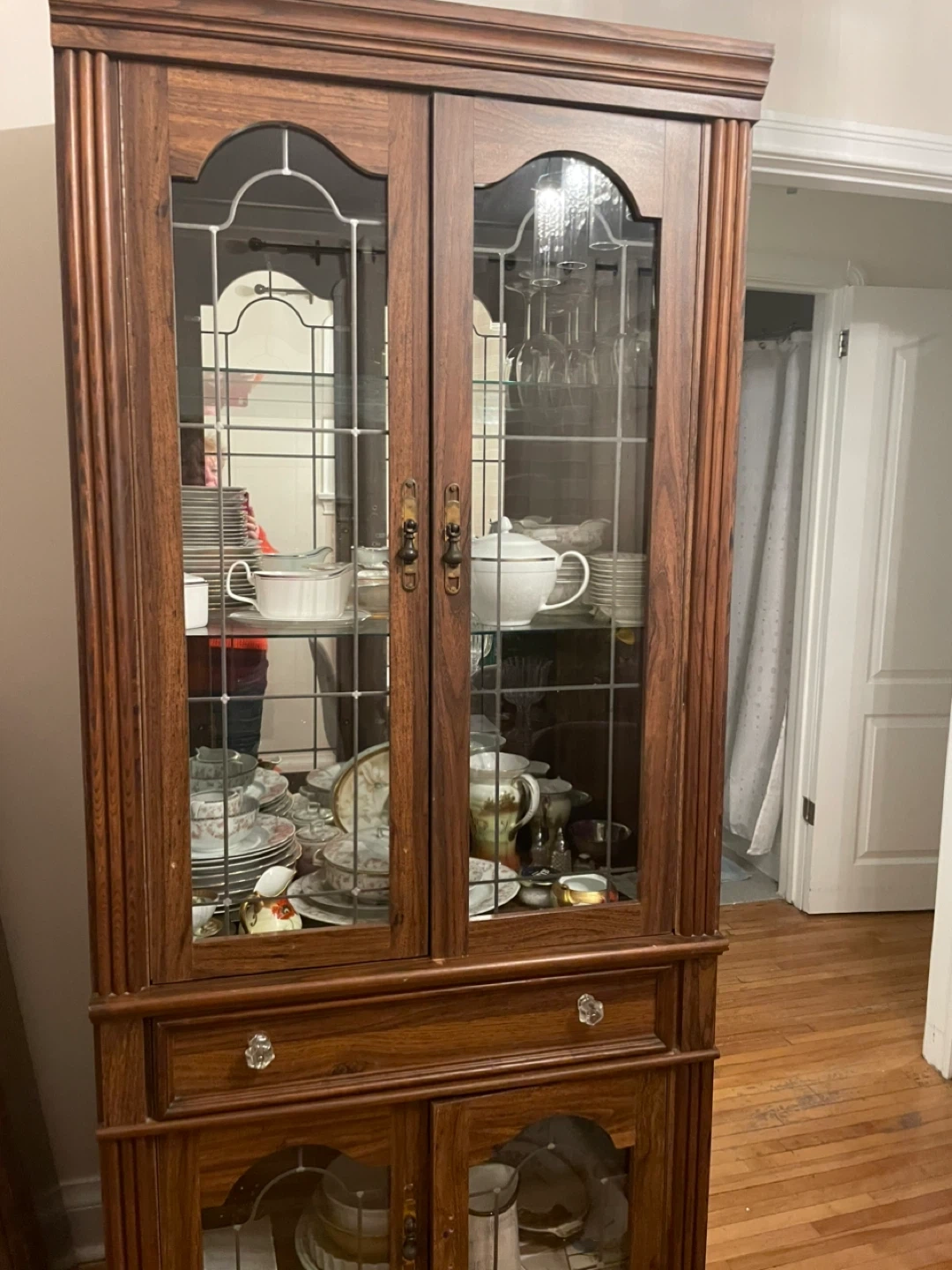 Beautiful wooden china cabinet with glass paneled doors. It features multiple shelves for displaying dishes and glassware, along with drawers and lower cabinets for storage. This piece is perfect for a dining room or living area.