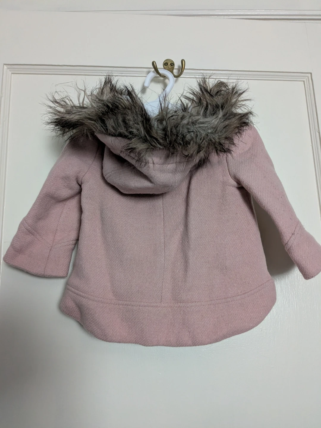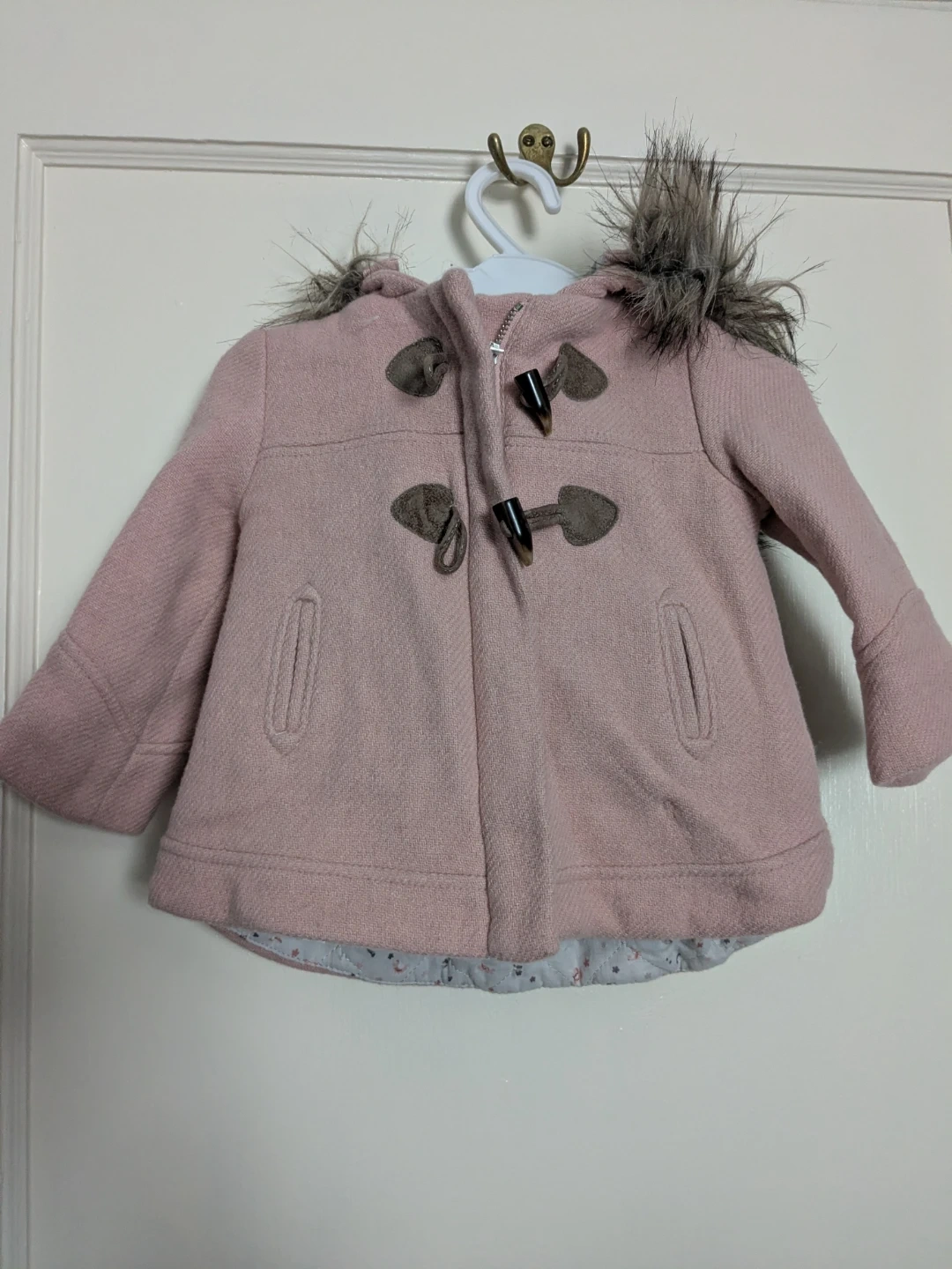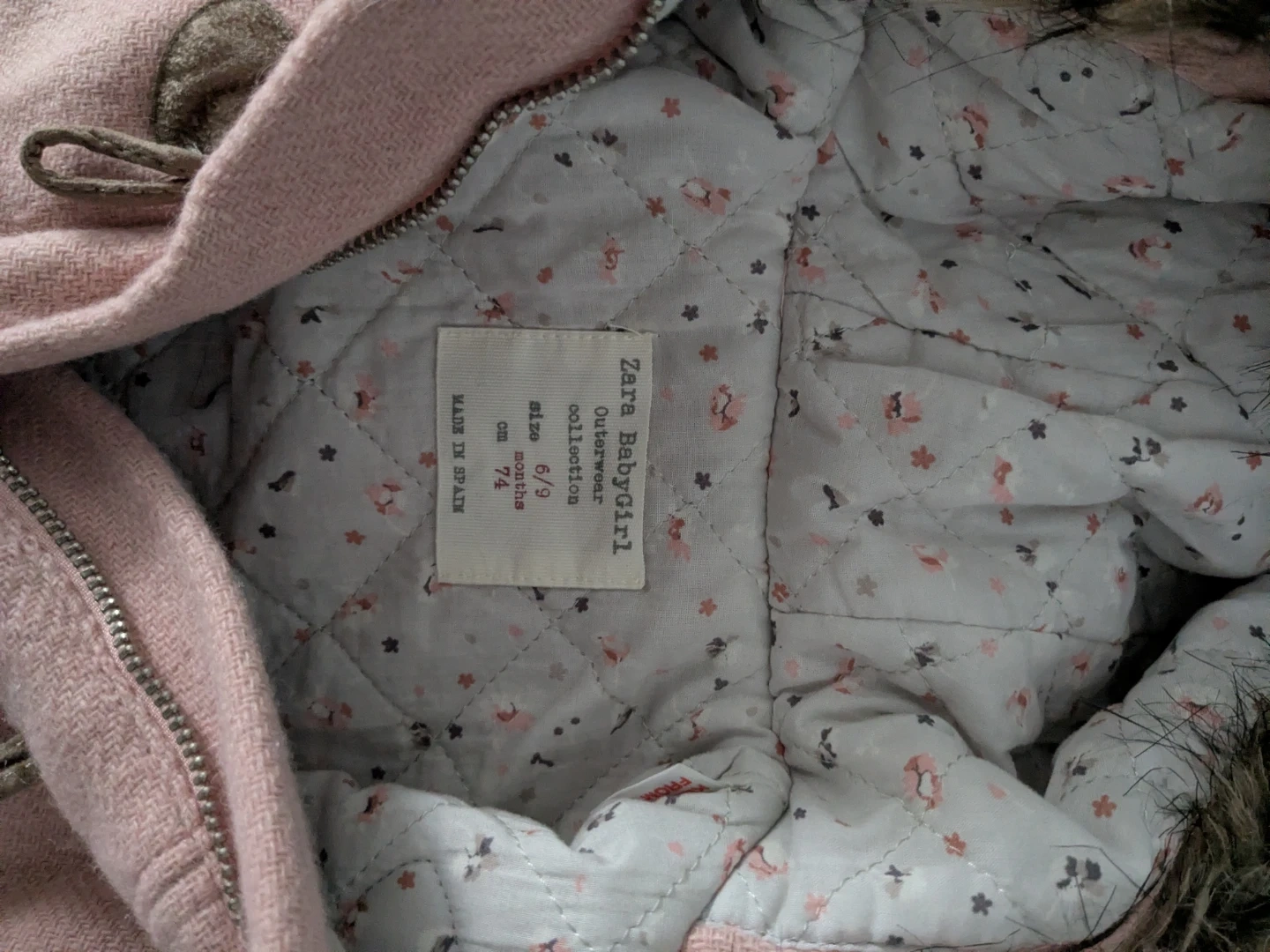 This is an adorable Zara Babygirl pink coat, perfect for keeping your little one warm! It's a size 6/9 months (74 cm). The coat features a cute faux fur trim on the hood and toggle closures. It’s in great condition and ready for a new home!