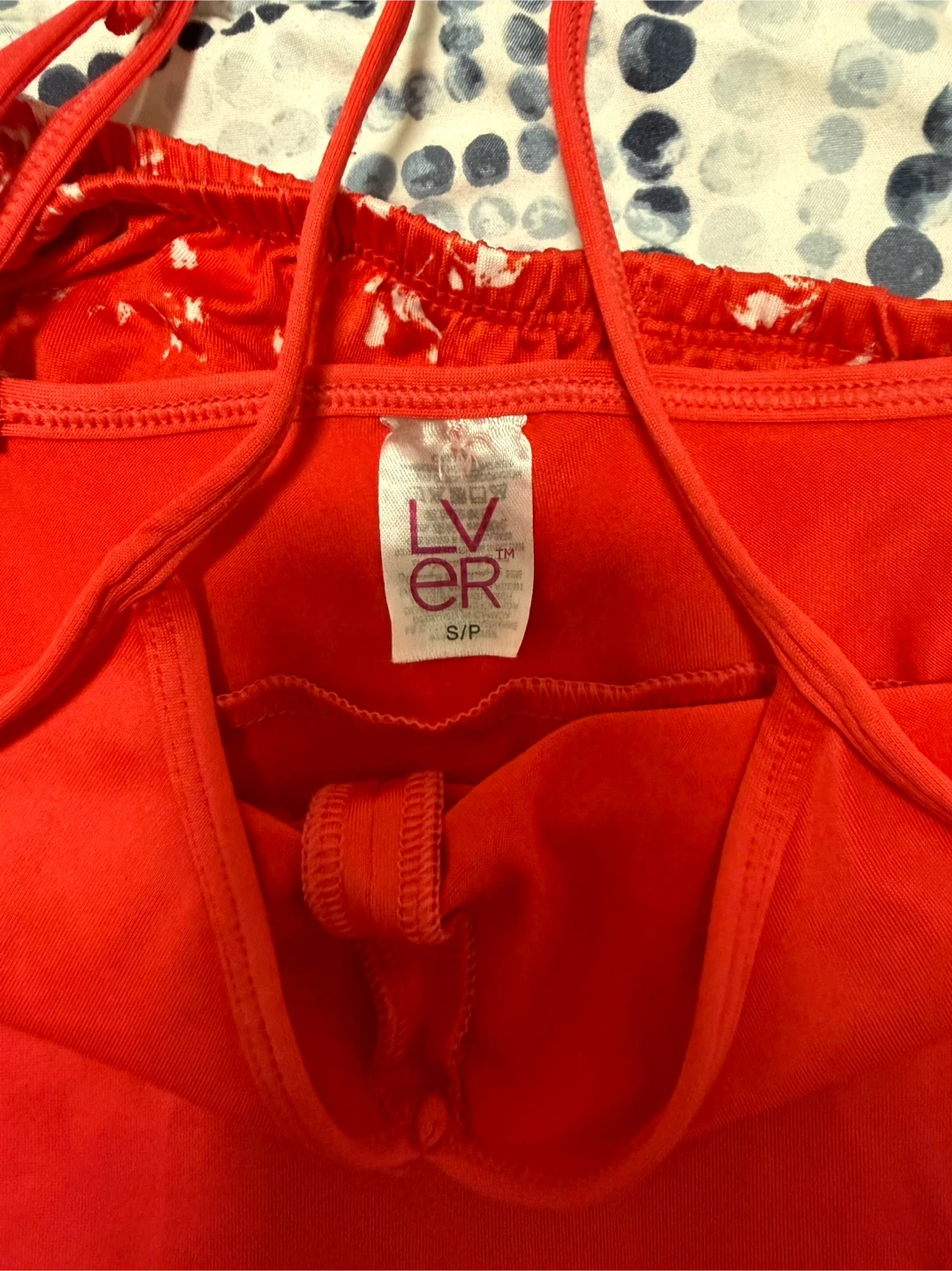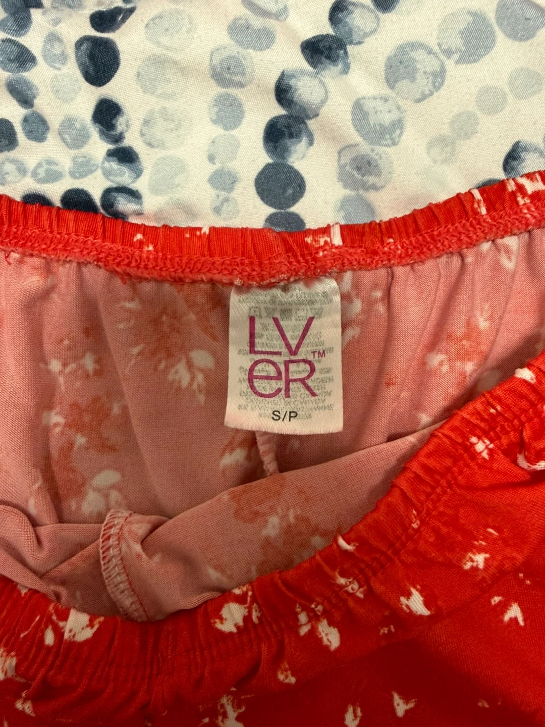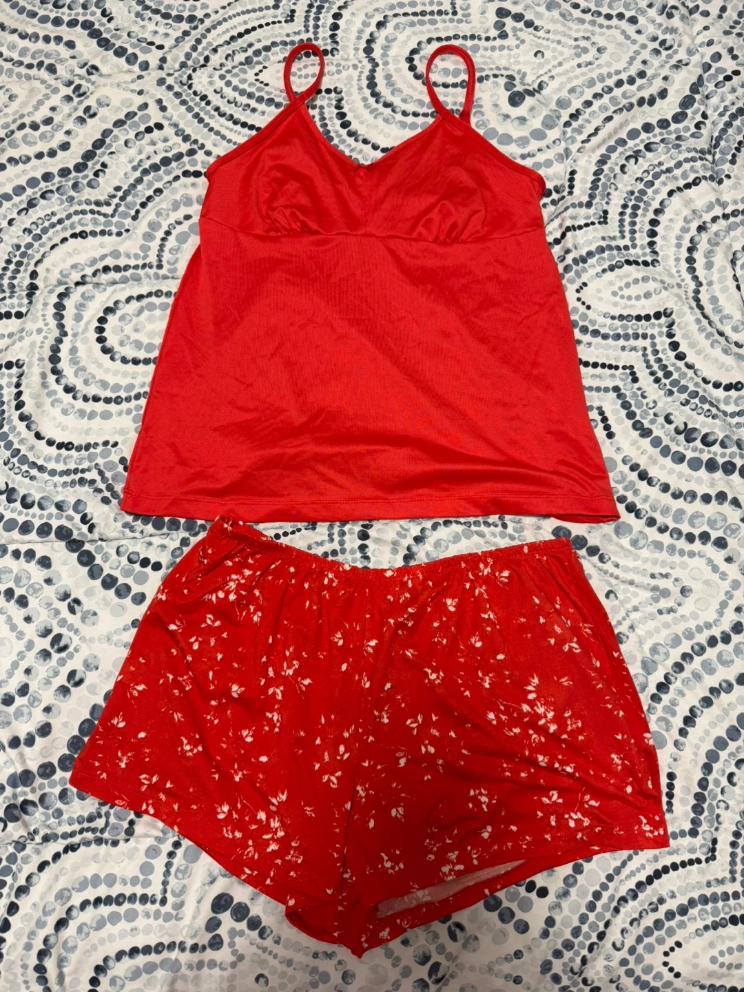 This LVER pajama set is red with a floral pattern. It's a size S/P. The camisole has thin straps and a V-neckline.