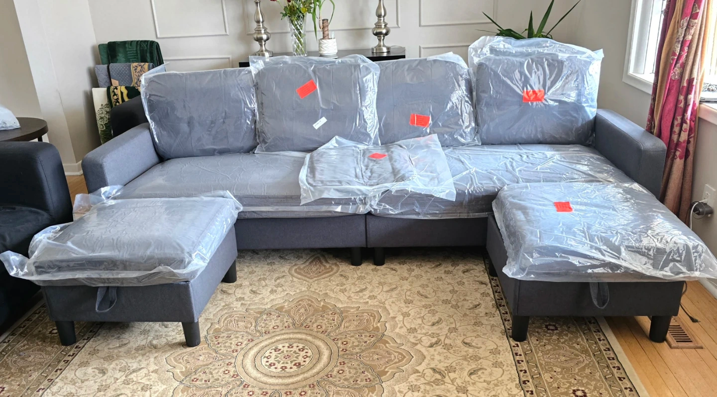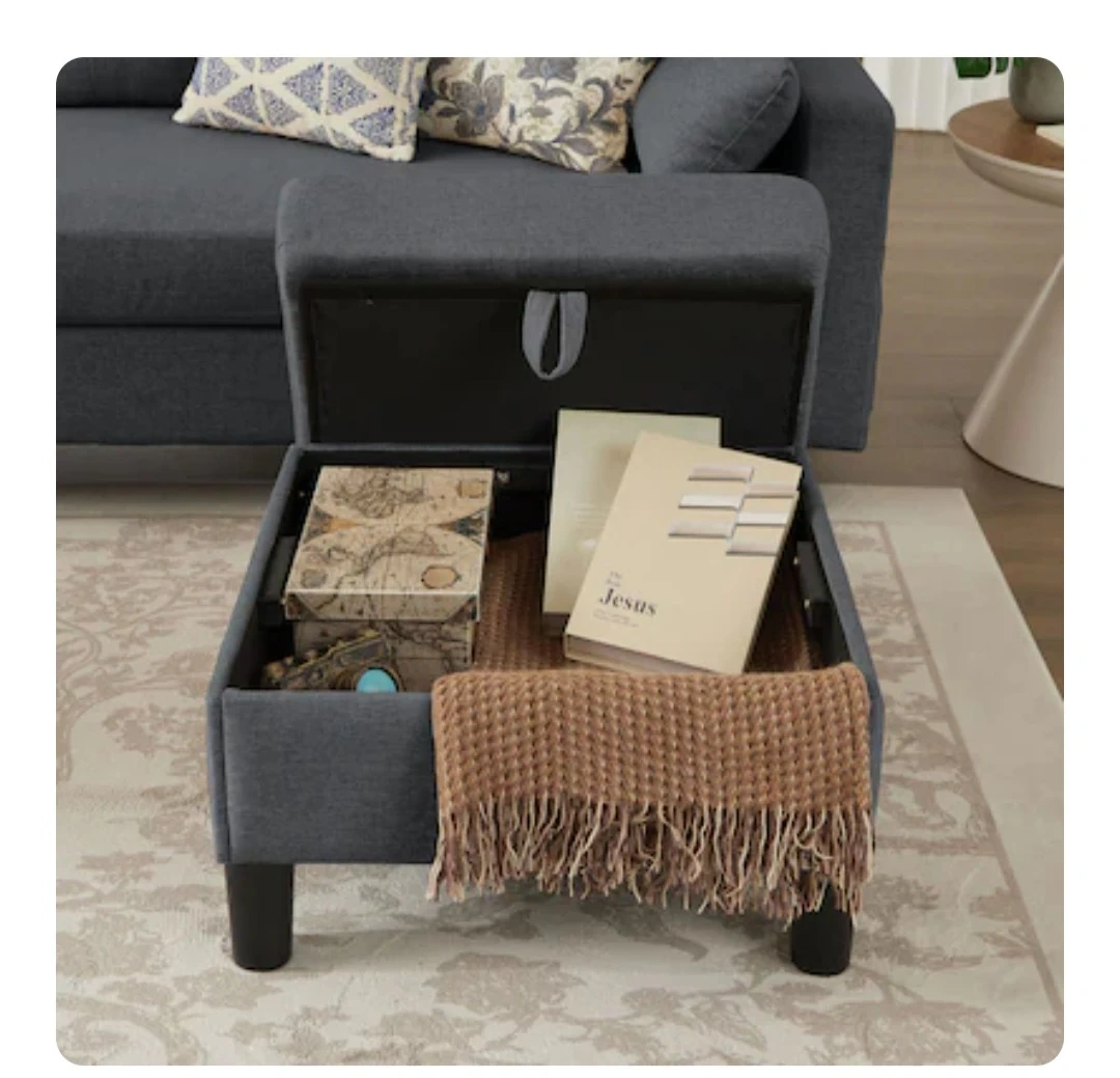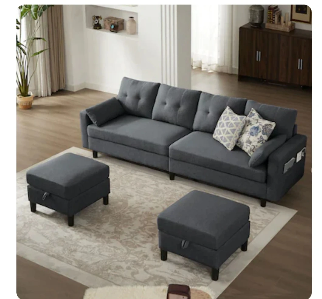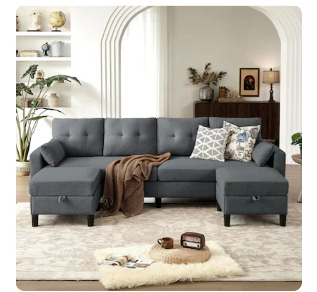 This spacious U-shaped sectional sofa comes in a dark grey fabric. It features tufted back cushions and includes two storage ottomans for extra space. The sofa also has convenient side pockets on the arms, perfect for stashing magazines or remotes. The ottomans lift open for hidden storage, great for blankets or toys.