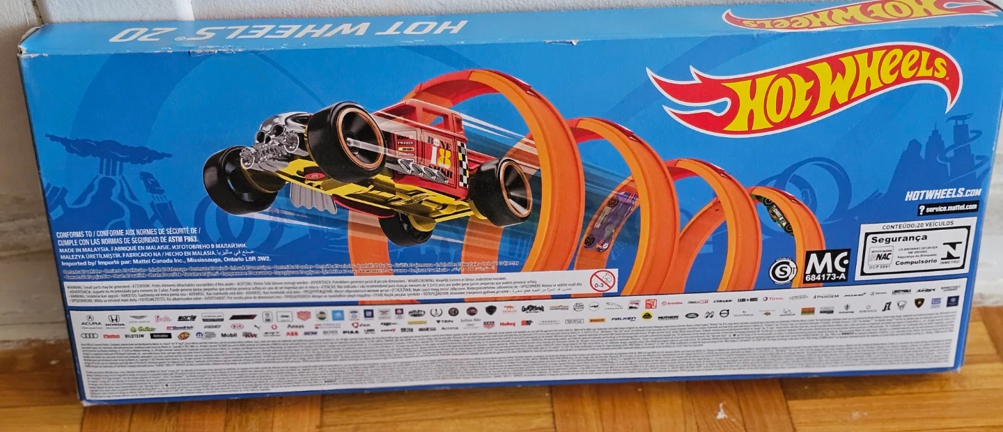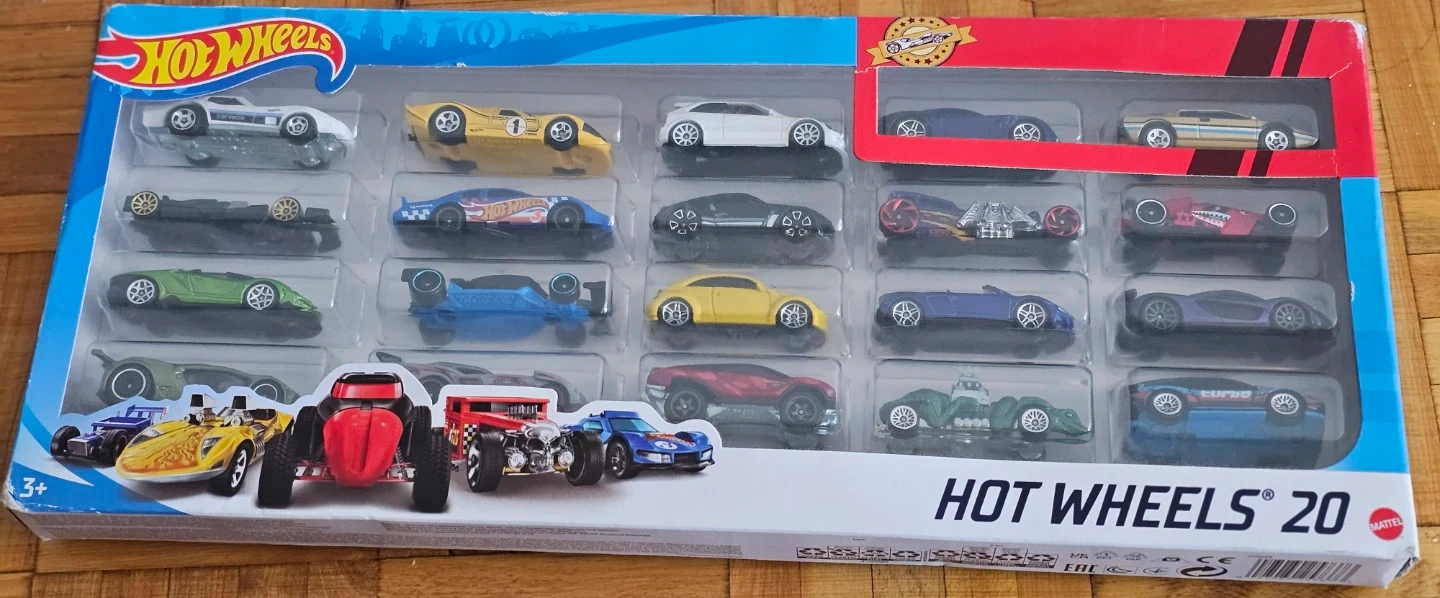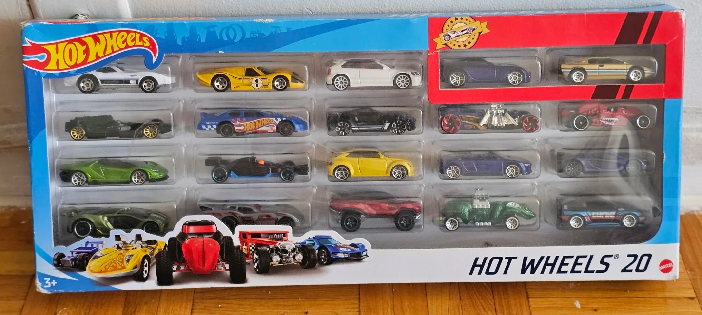 This is a Hot Wheels 20 car pack featuring a variety of vehicles. It's great for collectors or for kids to play with. Includes cars like a yellow sports car and a green dragster.