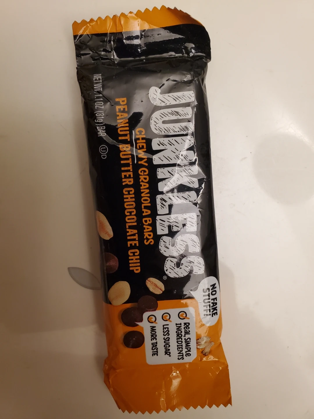 This is one Junkless Chewy Granola Bar. It's a peanut butter chocolate chip flavor. It has real, simple ingredients and less sugar. Maybe past due.