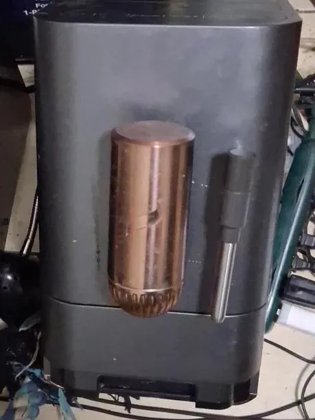 Gray espresso machine with a copper portafilter. It has a silver steam wand attachment. This is a compact appliance.