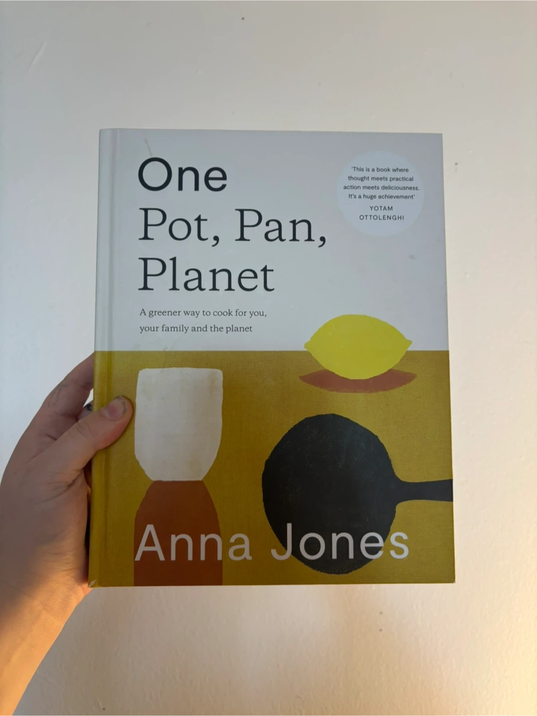 This is the 'One Pot, Pan, Planet' cookbook by Anna Jones. It's a collection of over 200 simple recipes that limit prep and ingredients for all-in-one dinners. The book suggests ideas for using up vegetables that most often get thrown away.