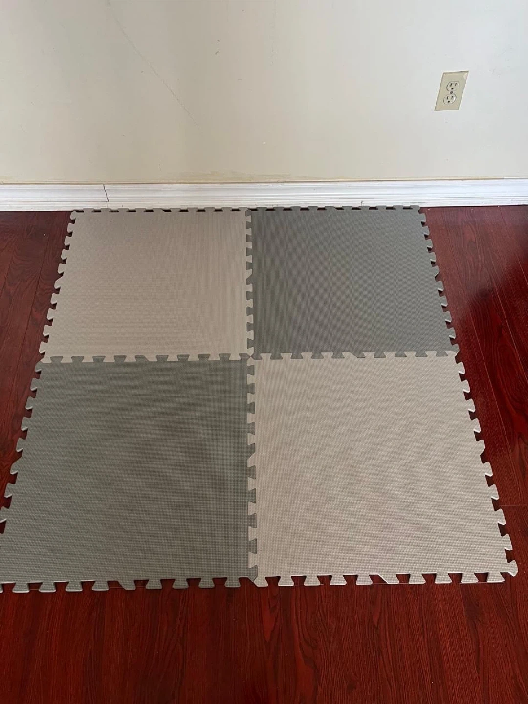 Four interlocking foam floor tiles in grey and tan. These tiles provide a soft surface and can be used in various spaces. They're easy to assemble and create a cushioned area.