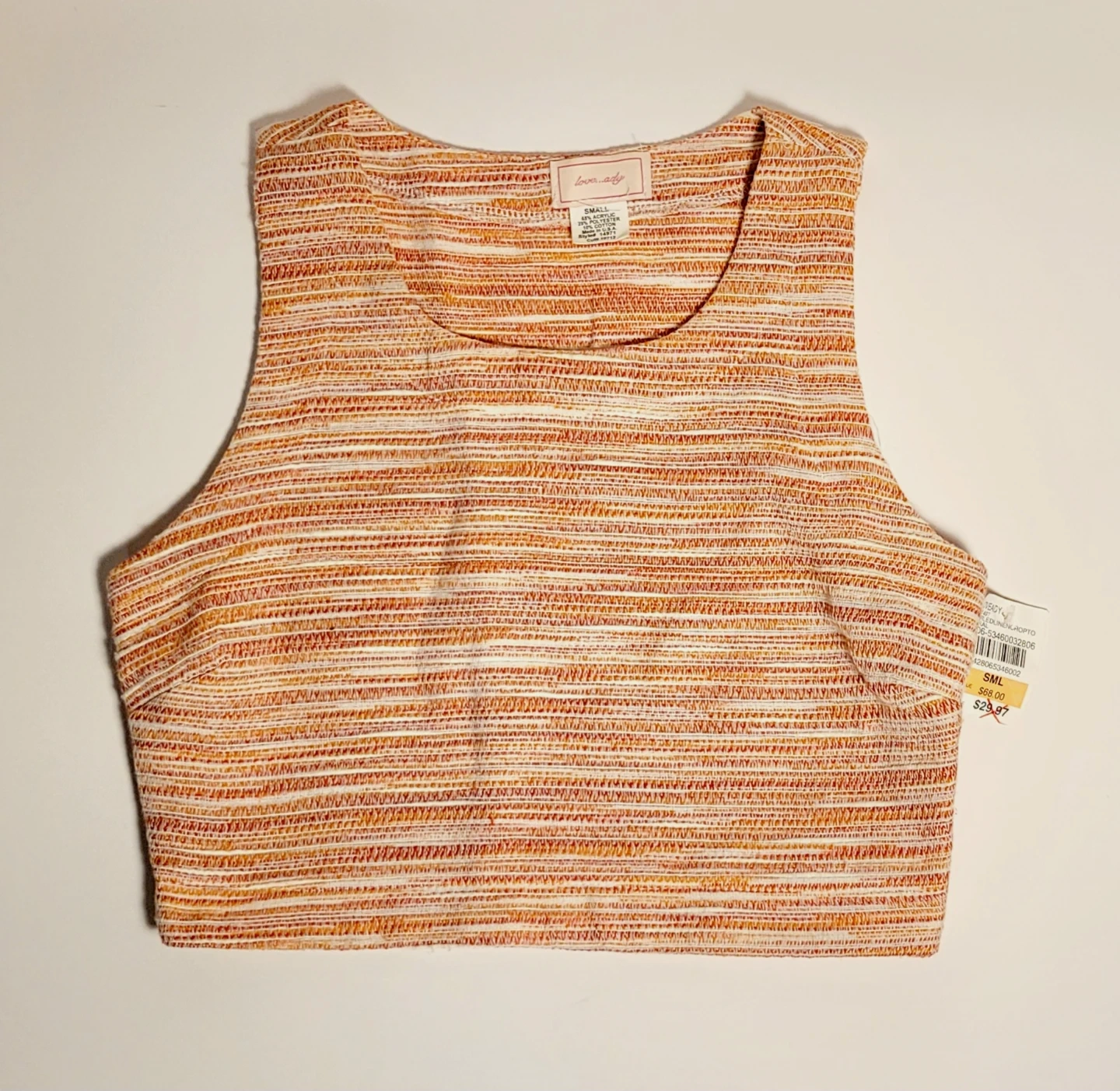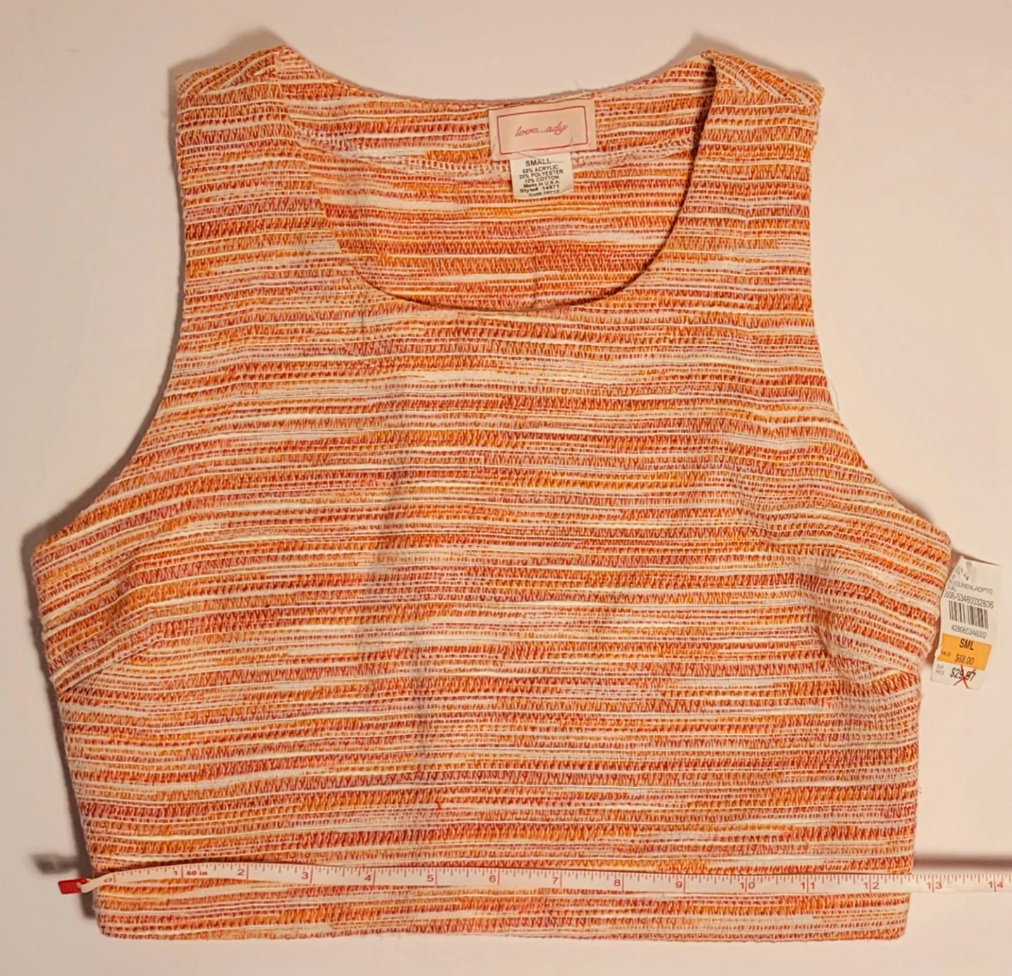 This new with tags cropped tank top features a horizontal striped pattern in red, orange, white, and pink. It's made of a blend of acrylic, polyester, and cotton. Size small on the tag, fits like an XS with a 25" ribcage.