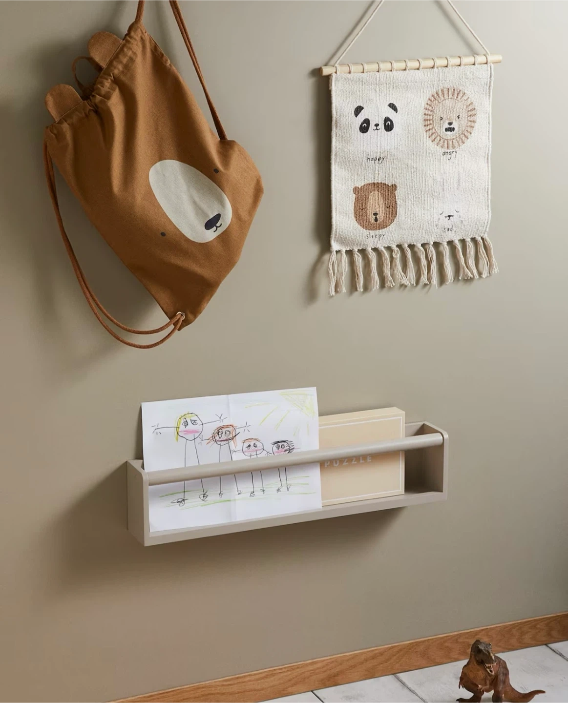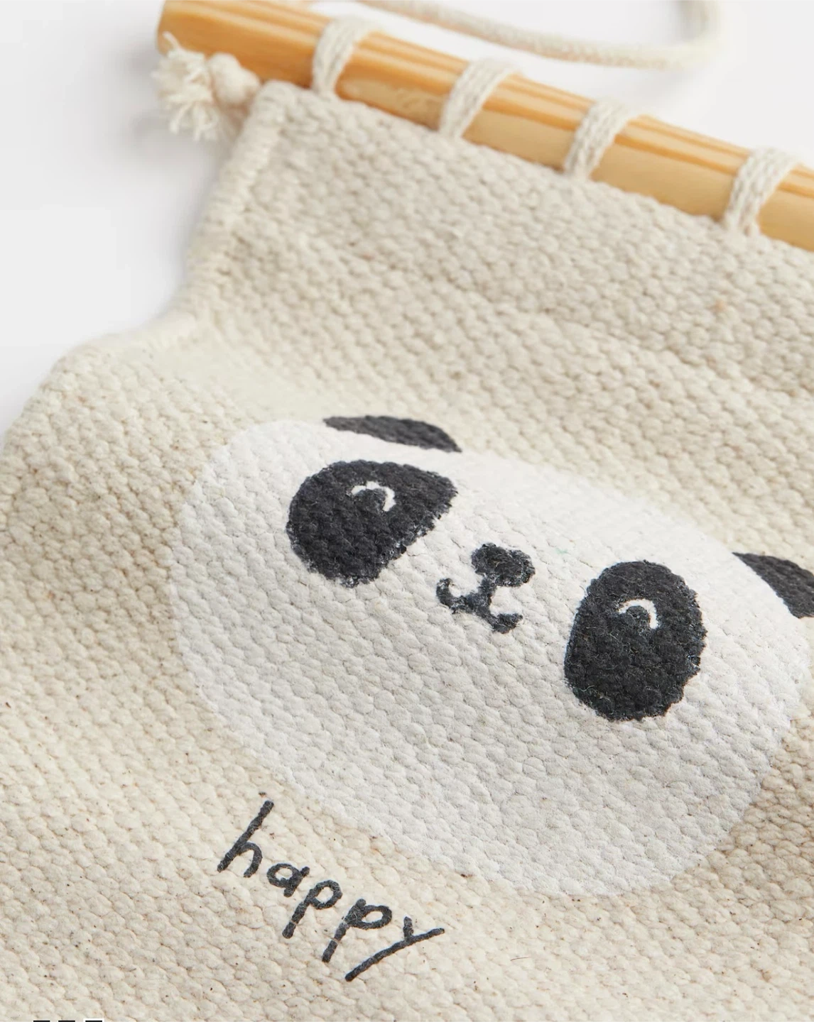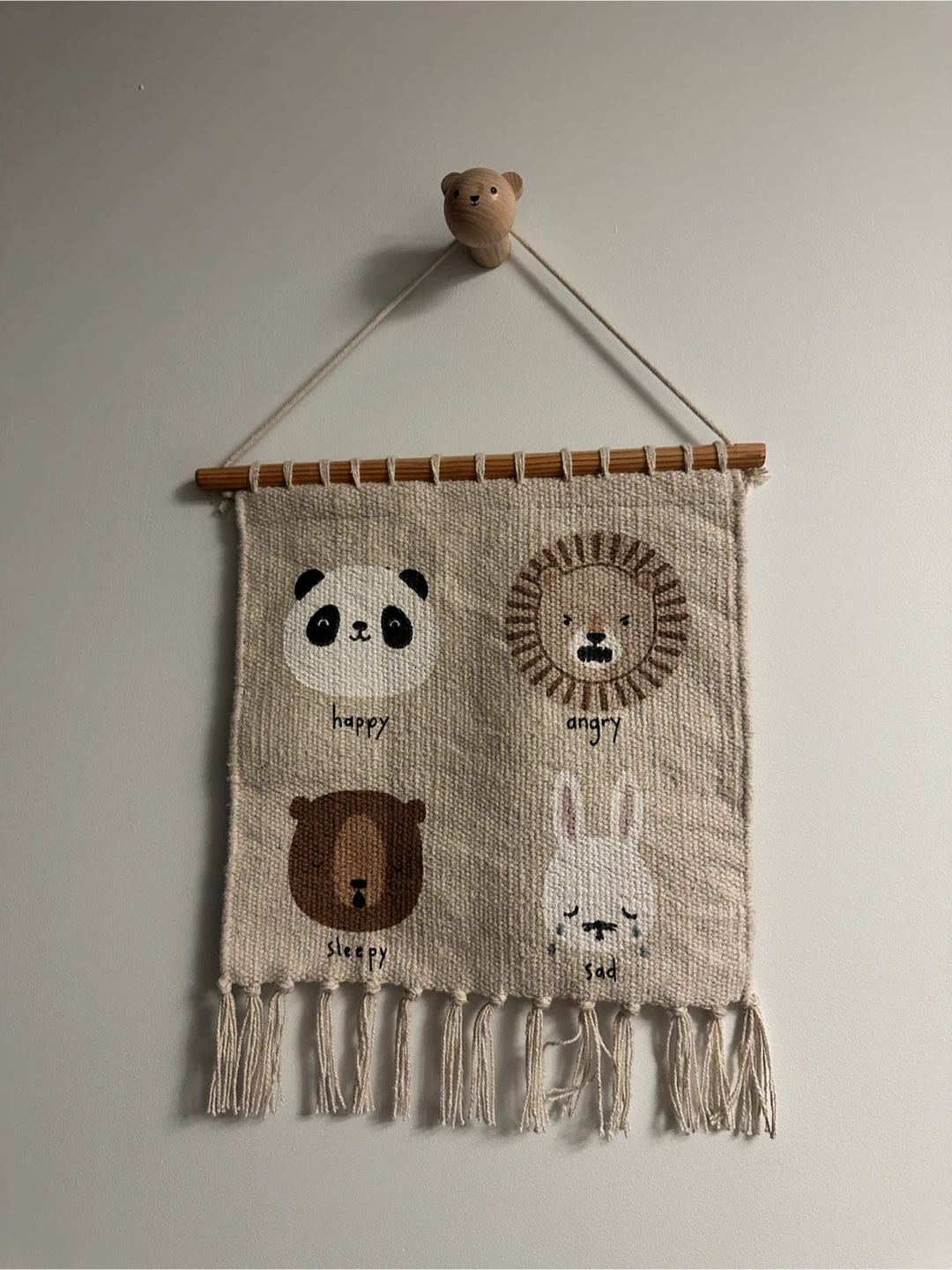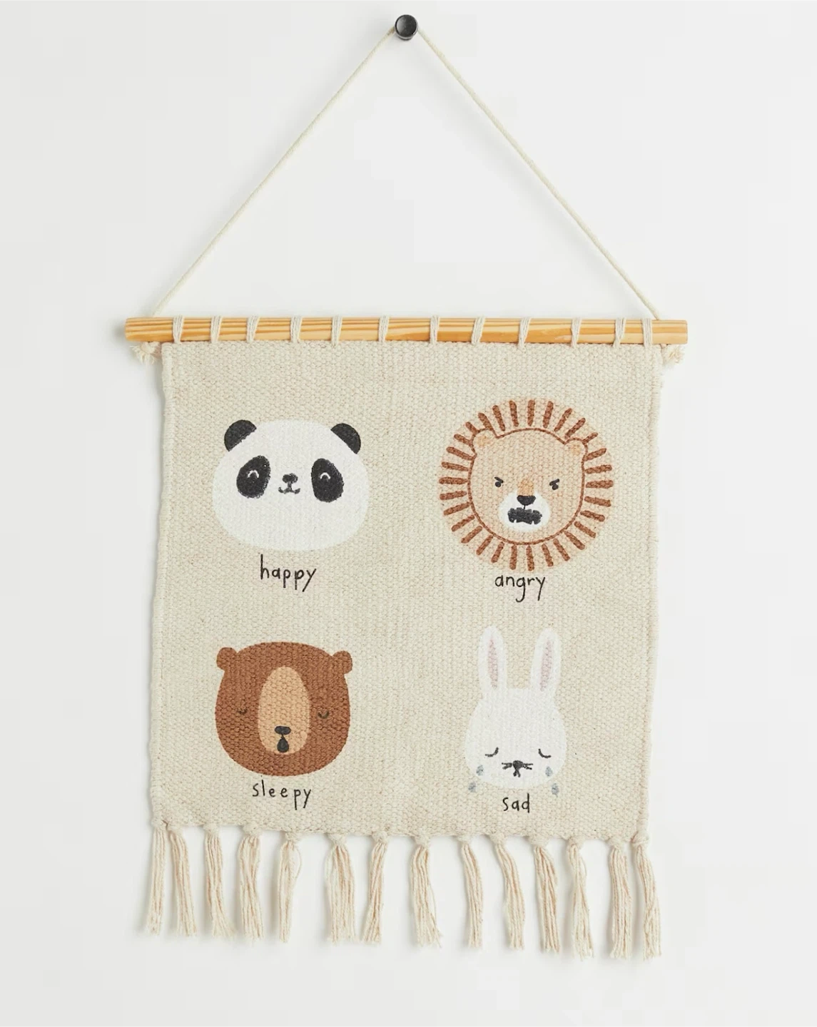 Wall decoration in woven cotton fabric. Printed motif at front and tassels at lower edge. Pine frame with a fabric cord for hanging. Width approximately 11 1/2. Length approximately 19 3/4. Comes with bear hanging screw.