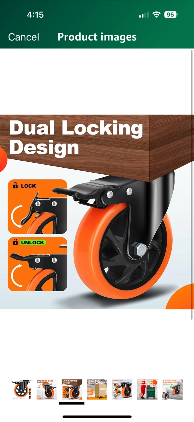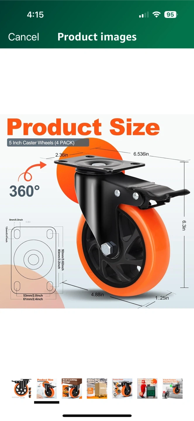 10Selling a set of four heavy-duty 5-inch caster wheels by QNCZ. These casters are designed for heavy loads, supporting up to 700 lbs per wheel and 2600 lbs total. They feature a dual locking design and heavy-duty double ball bearings for smooth and silent mobility. The wheels are non-marking and wear-resistant, ensuring they won't damage your floors. Each caster allows for 360-degree rotation, making it easy to maneuver heavy items.