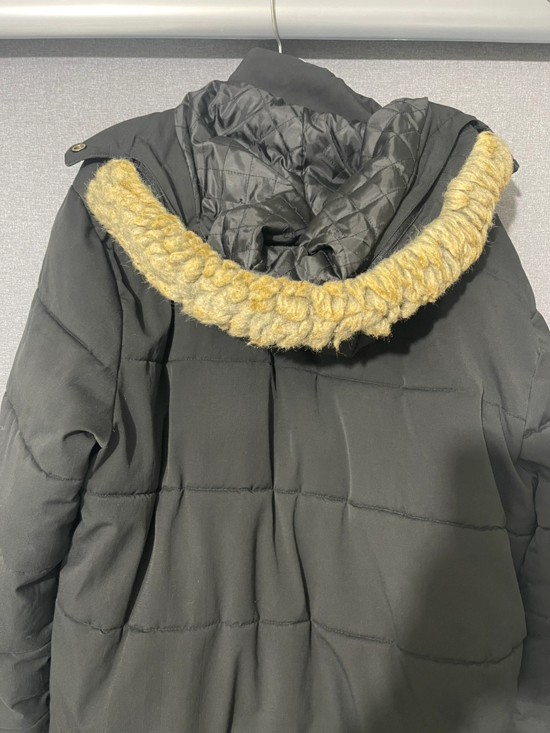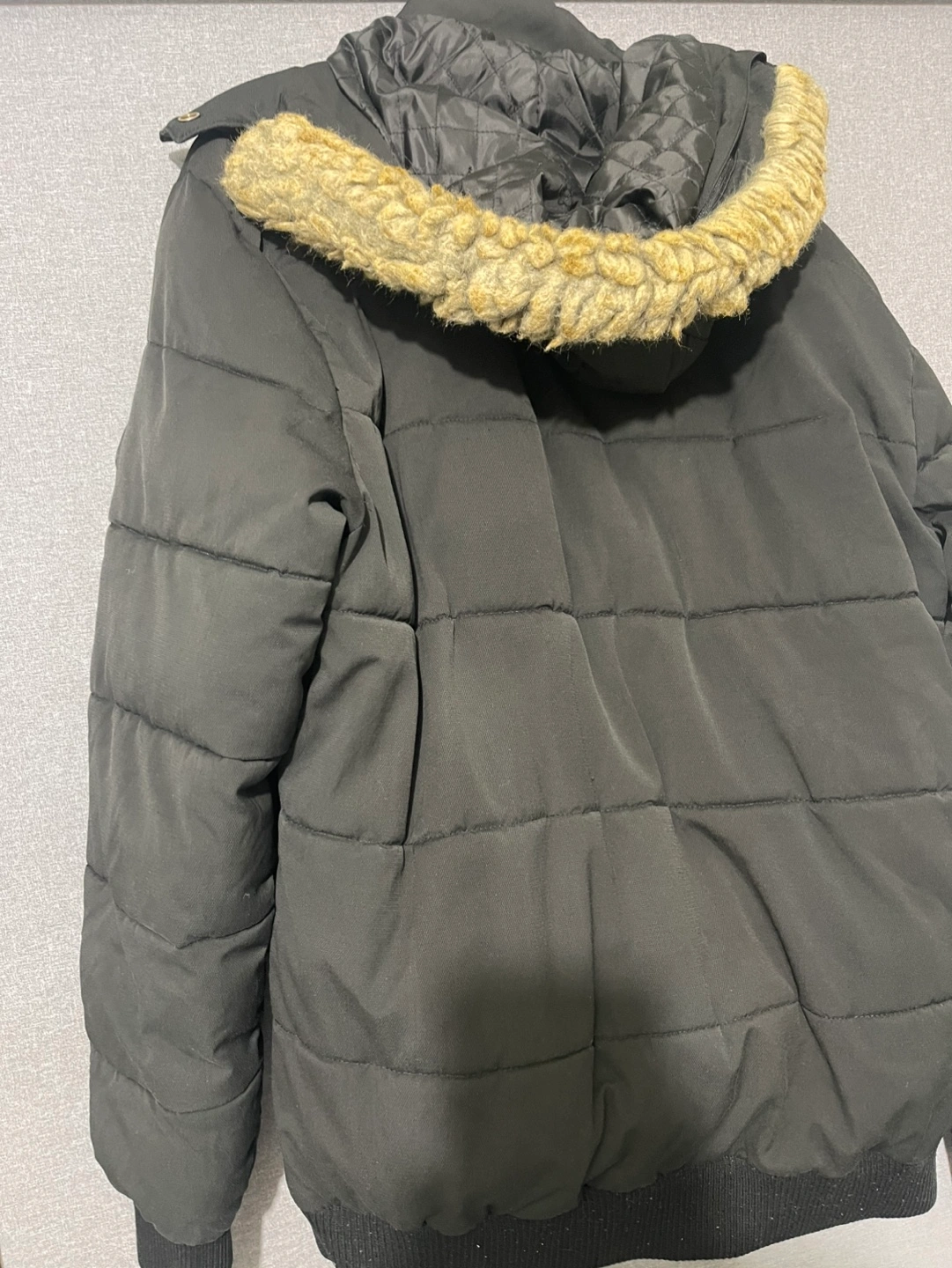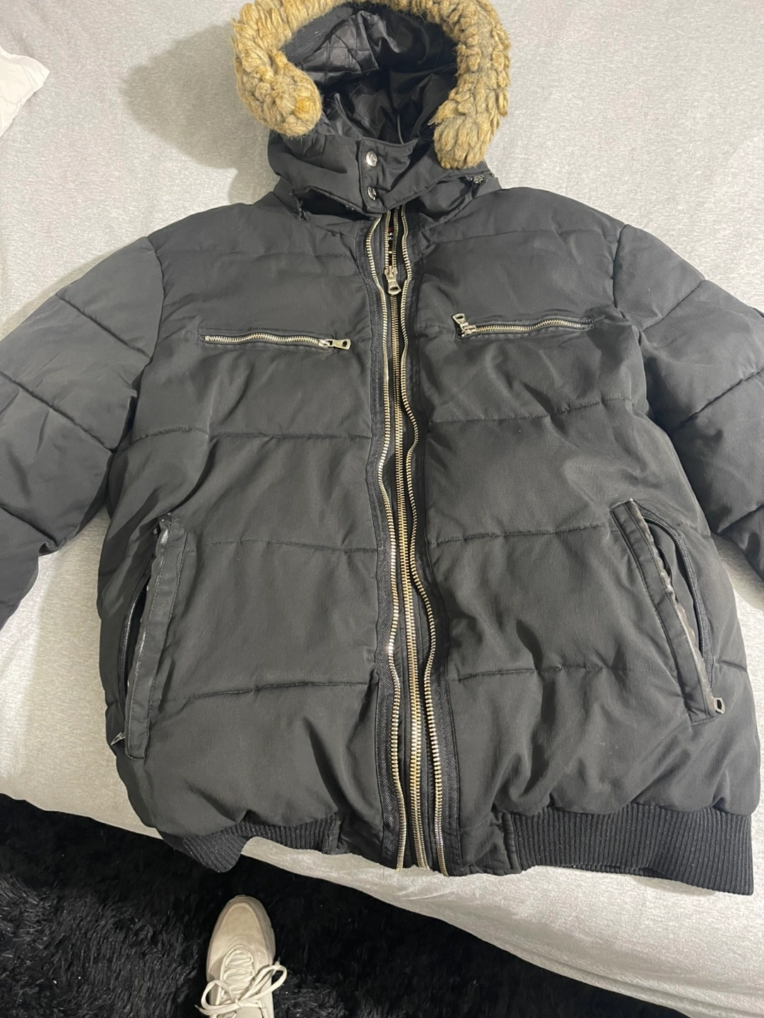 Black puffer jacket. Features a faux fur lined hood, zipper closure, and multiple pockets. Size 2XL. Good for cold weather.