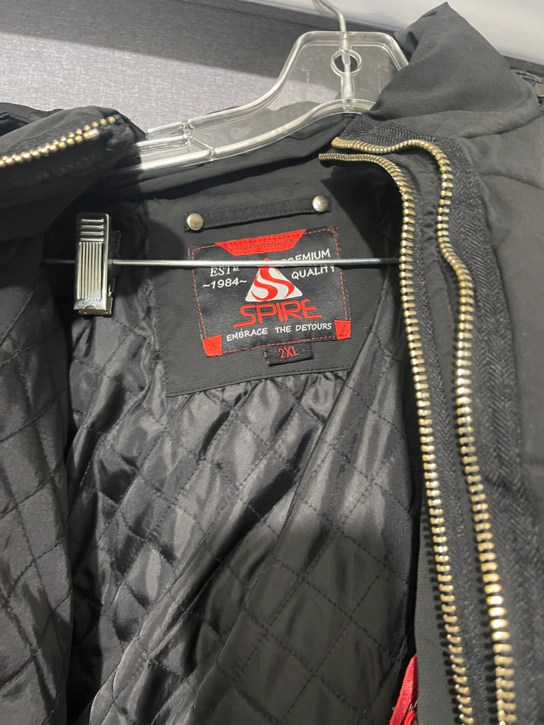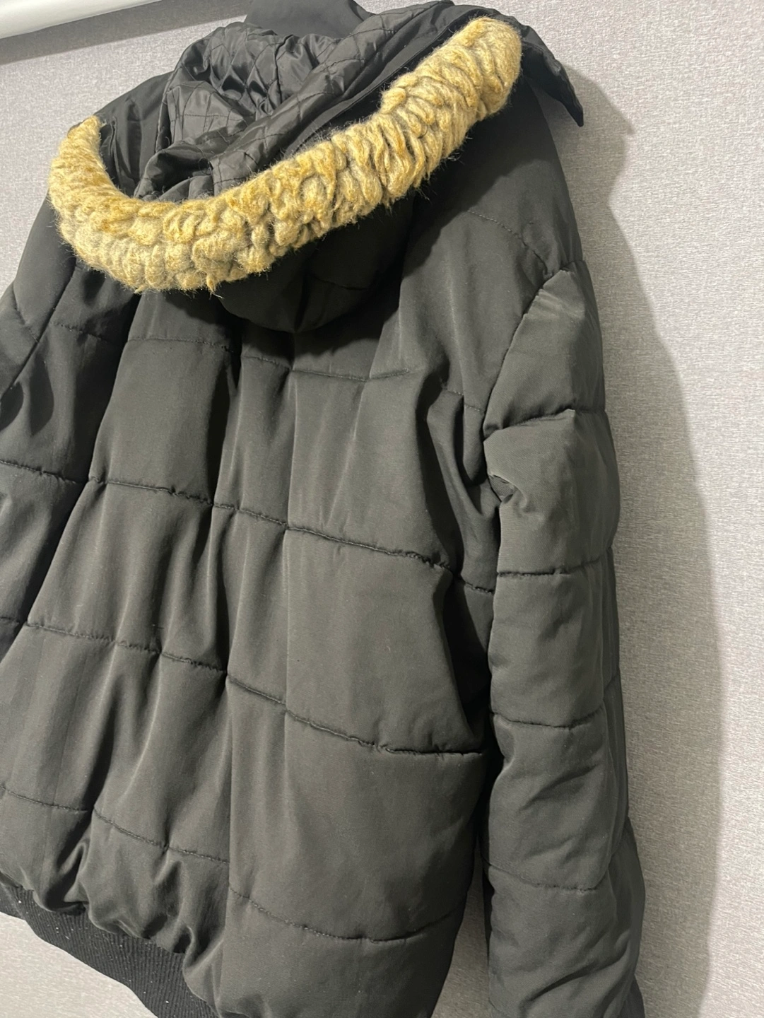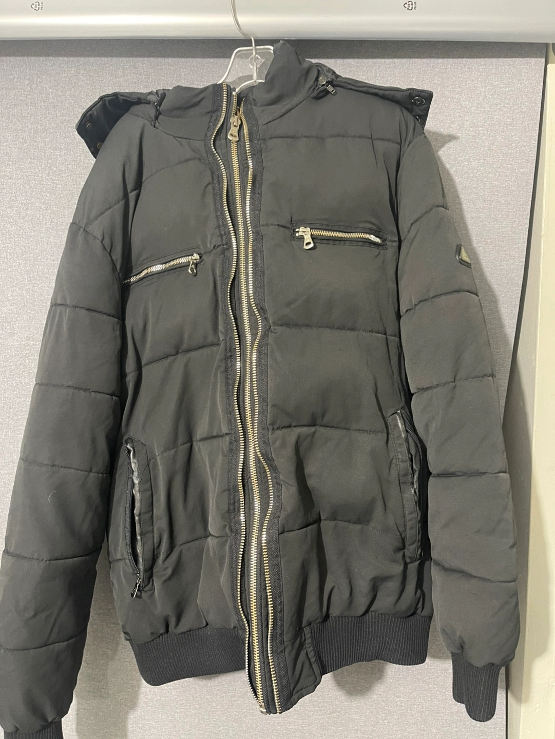 Black puffer jacket. Features a faux fur lined hood, zipper closure, and multiple pockets. Size 2XL. Good for cold weather.