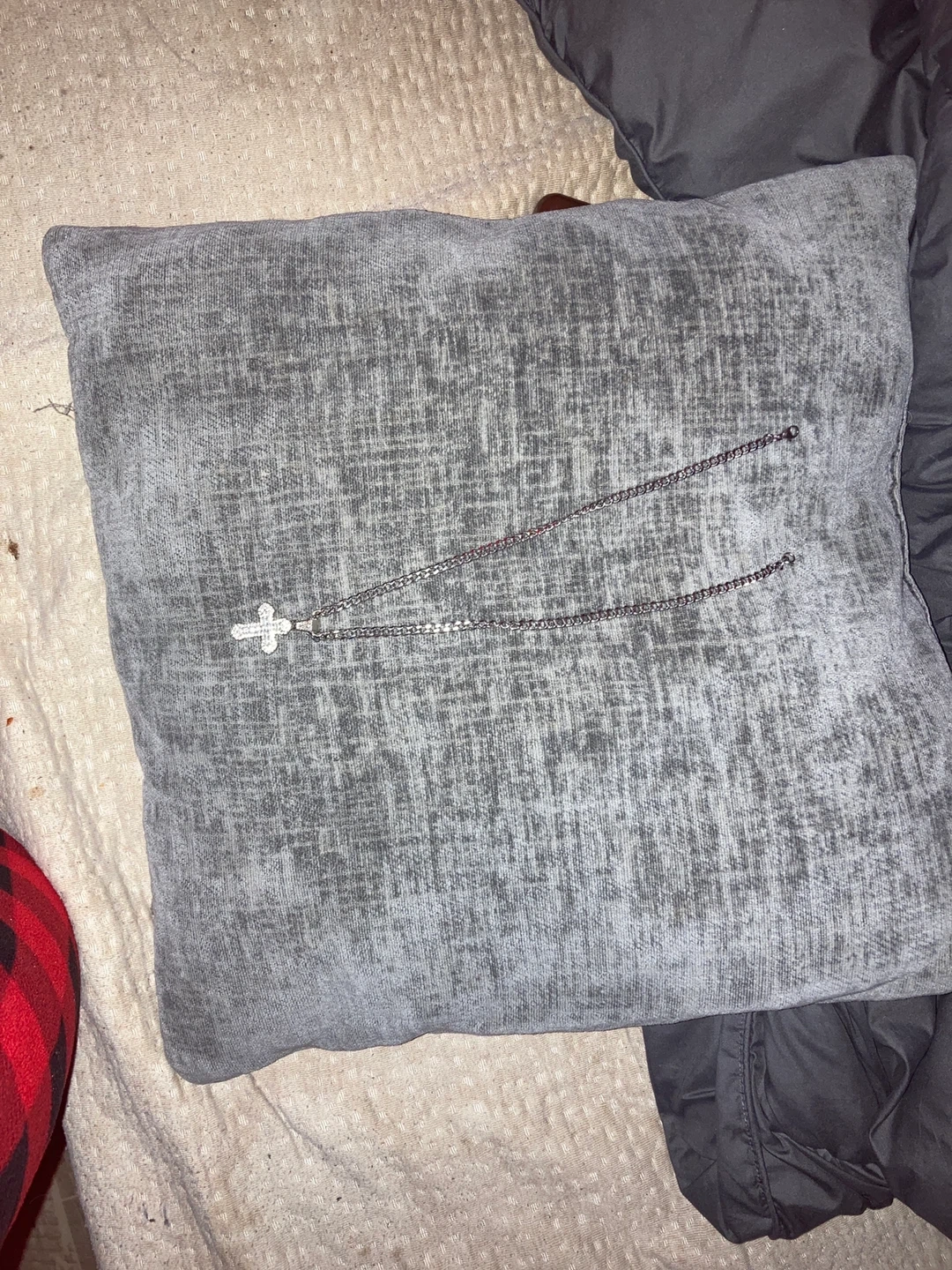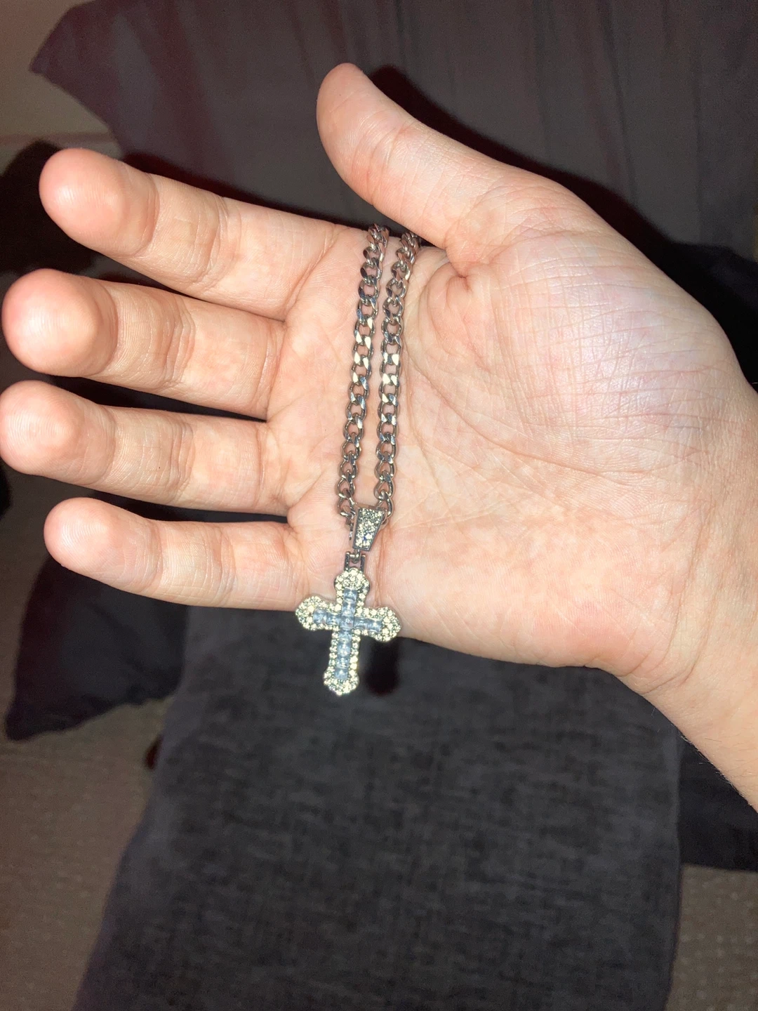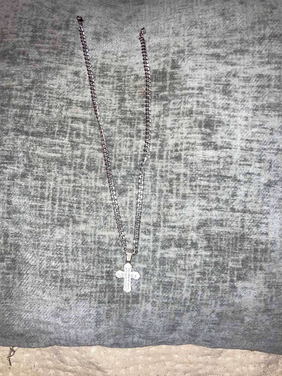 Silver chain necklace with a sparkling cross pendant. It's a stylish accessory. The chain has a curb link design. It's suitable for everyday wear.