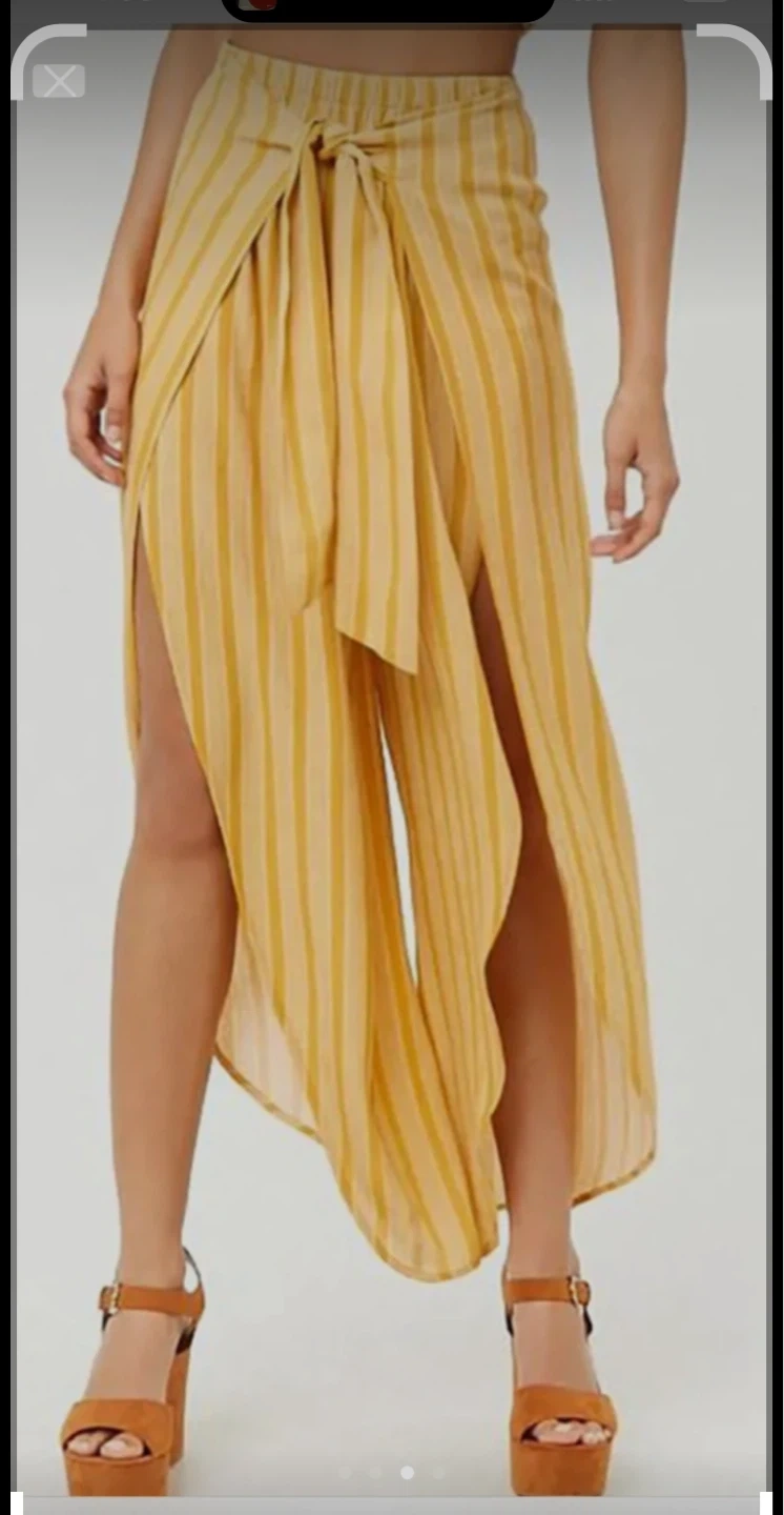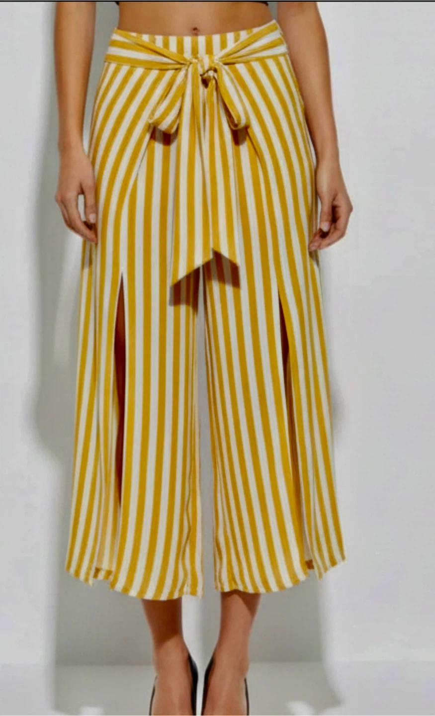 These stylish culottes feature a yellow and white stripe pattern. They have a wide-leg design with a tie front and high slits. Lightweight fabric.
