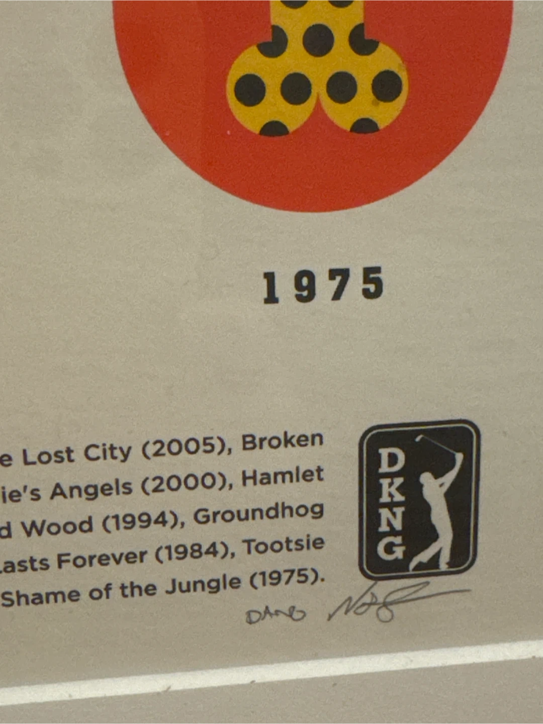Signed by the DKNG studio, Poster featuring the films of William James Murray. Includes icons representing movies released from 1975 to 2010. Framed and ready to hang.