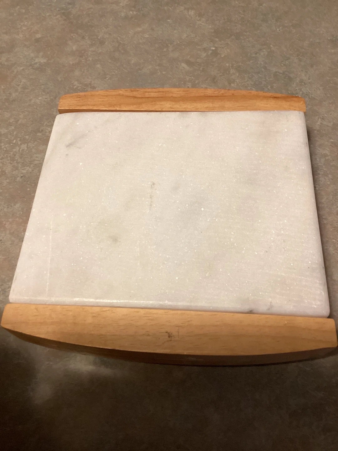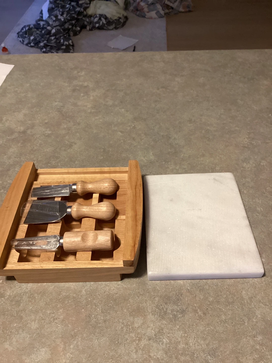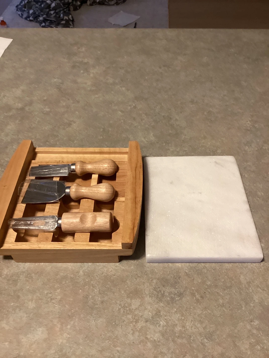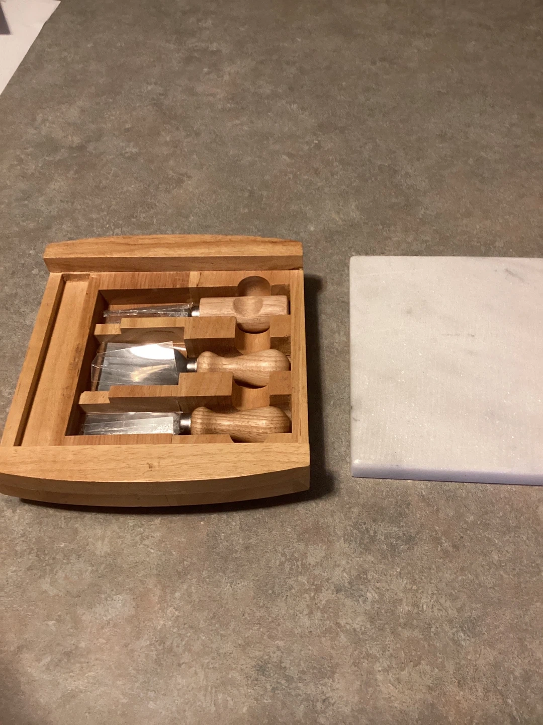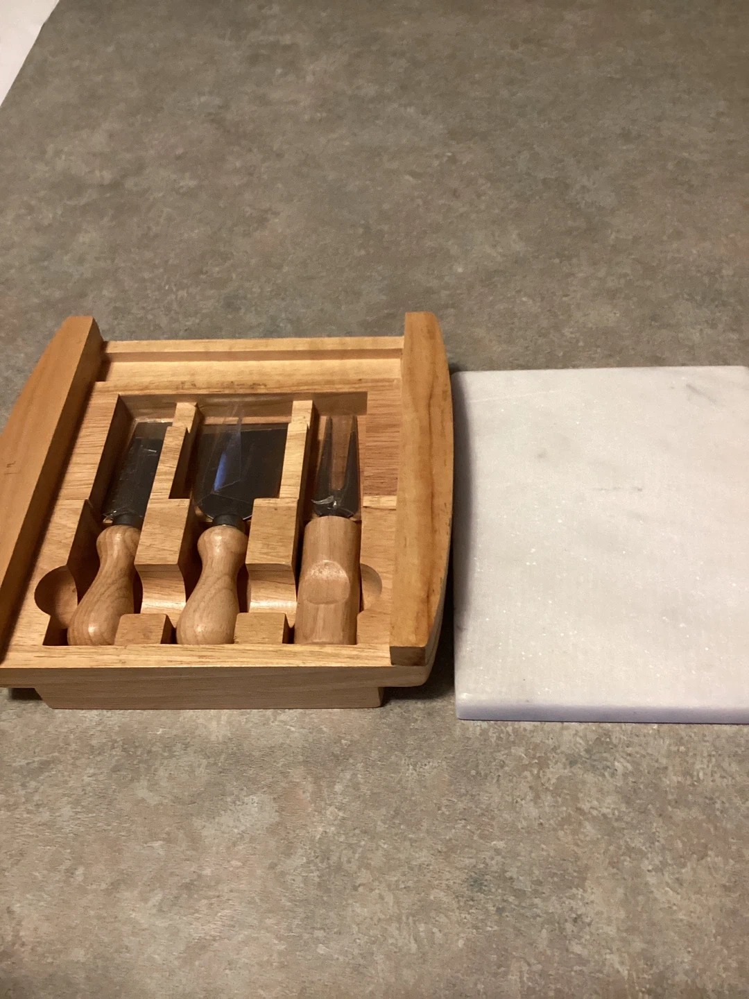 This set includes a marble cheese board with wooden accents and three cheese utensils stored in a wooden caddy. The board is made of white marble with a natural wood frame. I used marble board a little still in good condition It's great for serving cheese and appetizers at gatherings.