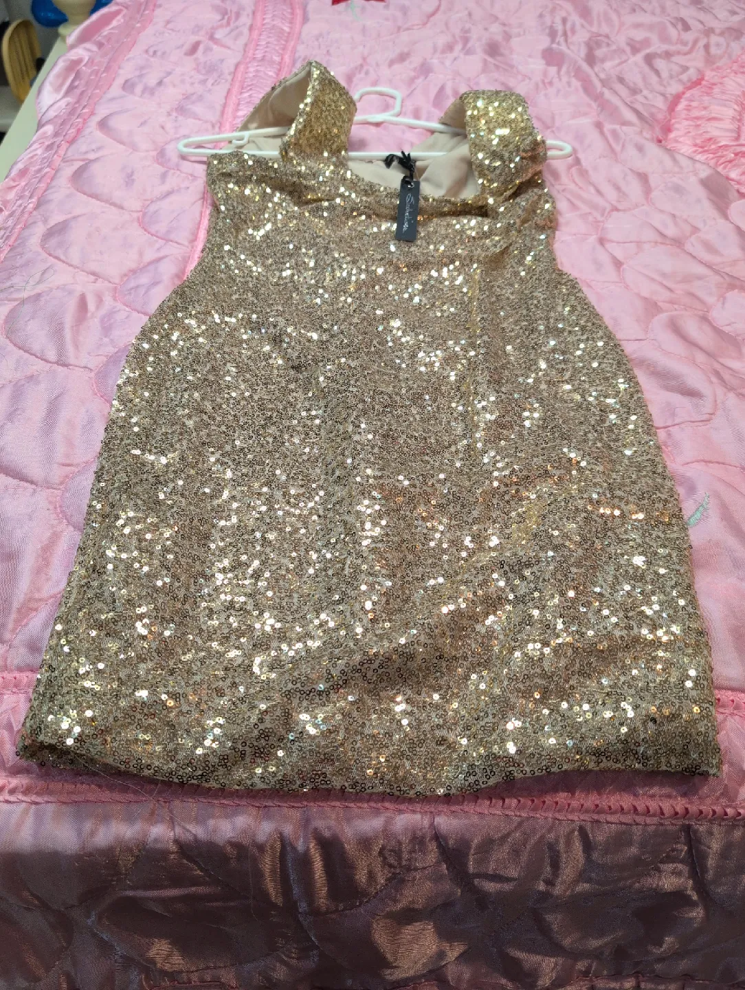 This gold sequin cocktail dress is a real showstopper. It's fully covered in shimmering sequins. Perfect for a night out or a special occasion!