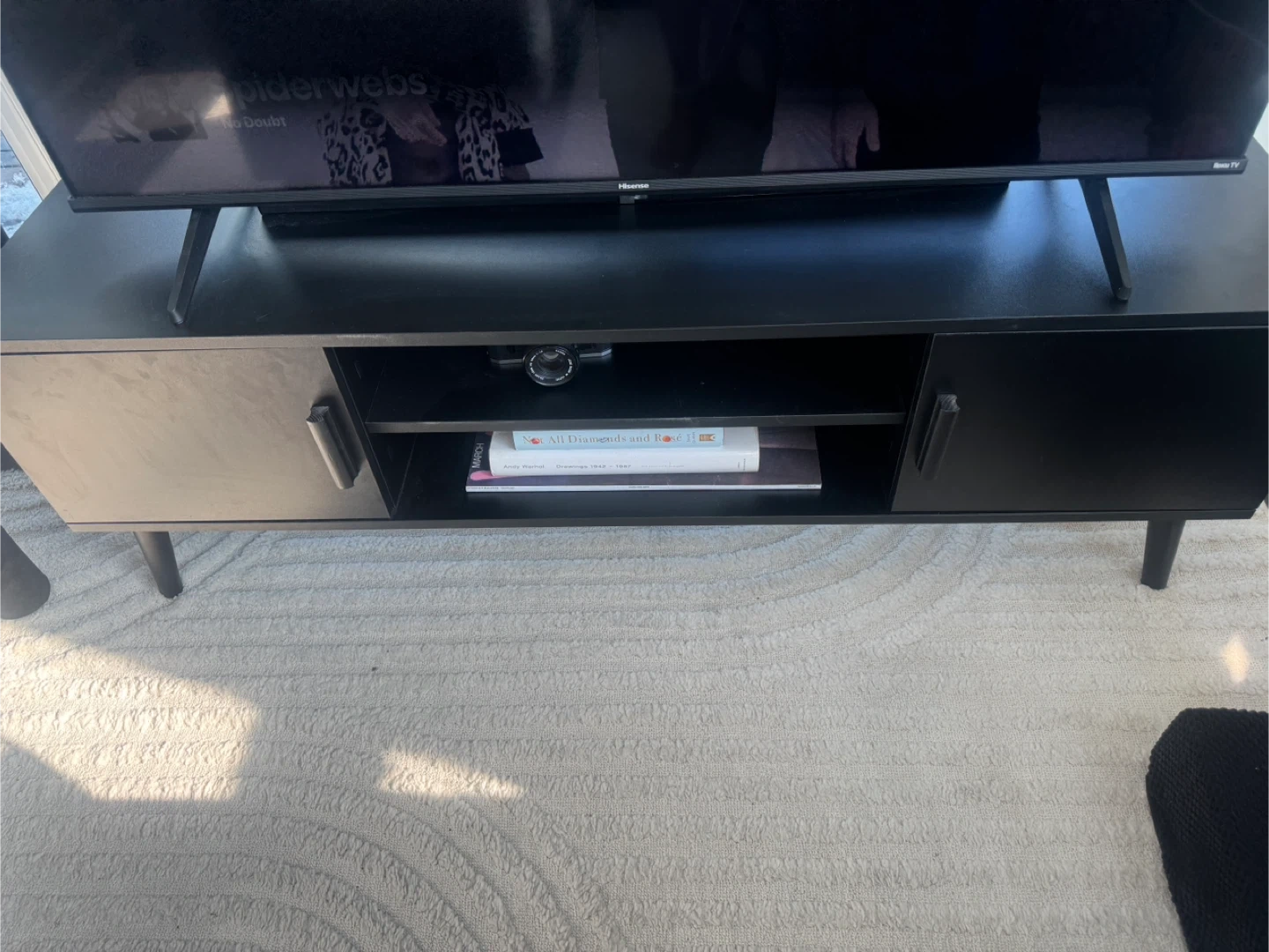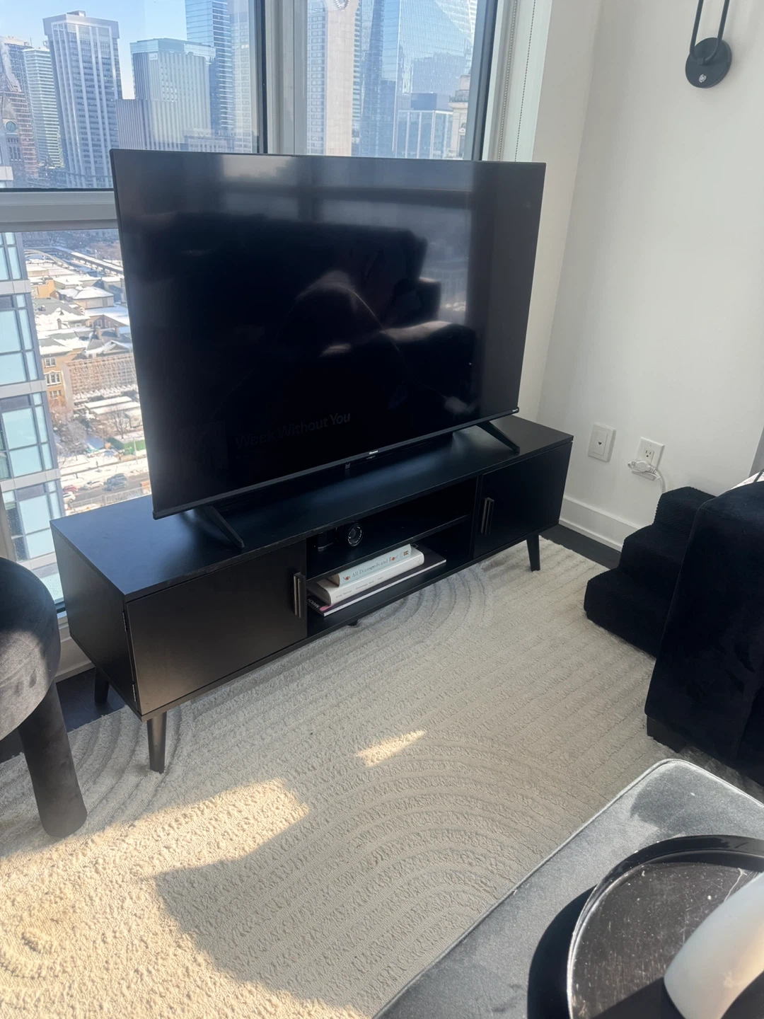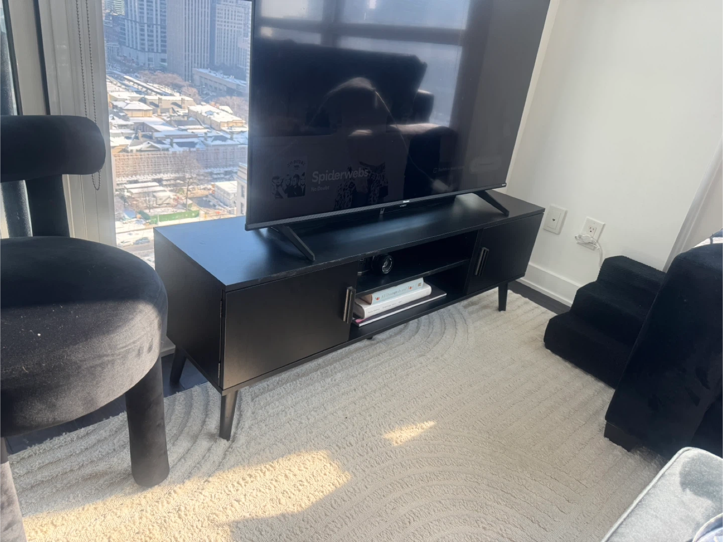 Modern black TV stand / media console in great condition. Fits TVs up to 60”. Clean, minimal look with plenty of storage — two side cabinets + open shelves in the middle for a cable box, gaming console, or decor. Cable cutouts in the back keep cords tidy.