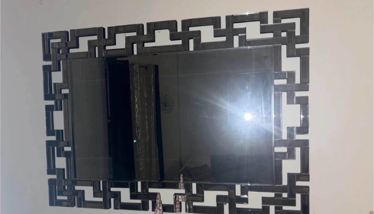 Rectangular wall mirror featuring a unique geometric frame design. It adds a touch of modern elegance to any room. This mirror's reflective surface can help brighten and open up your space.