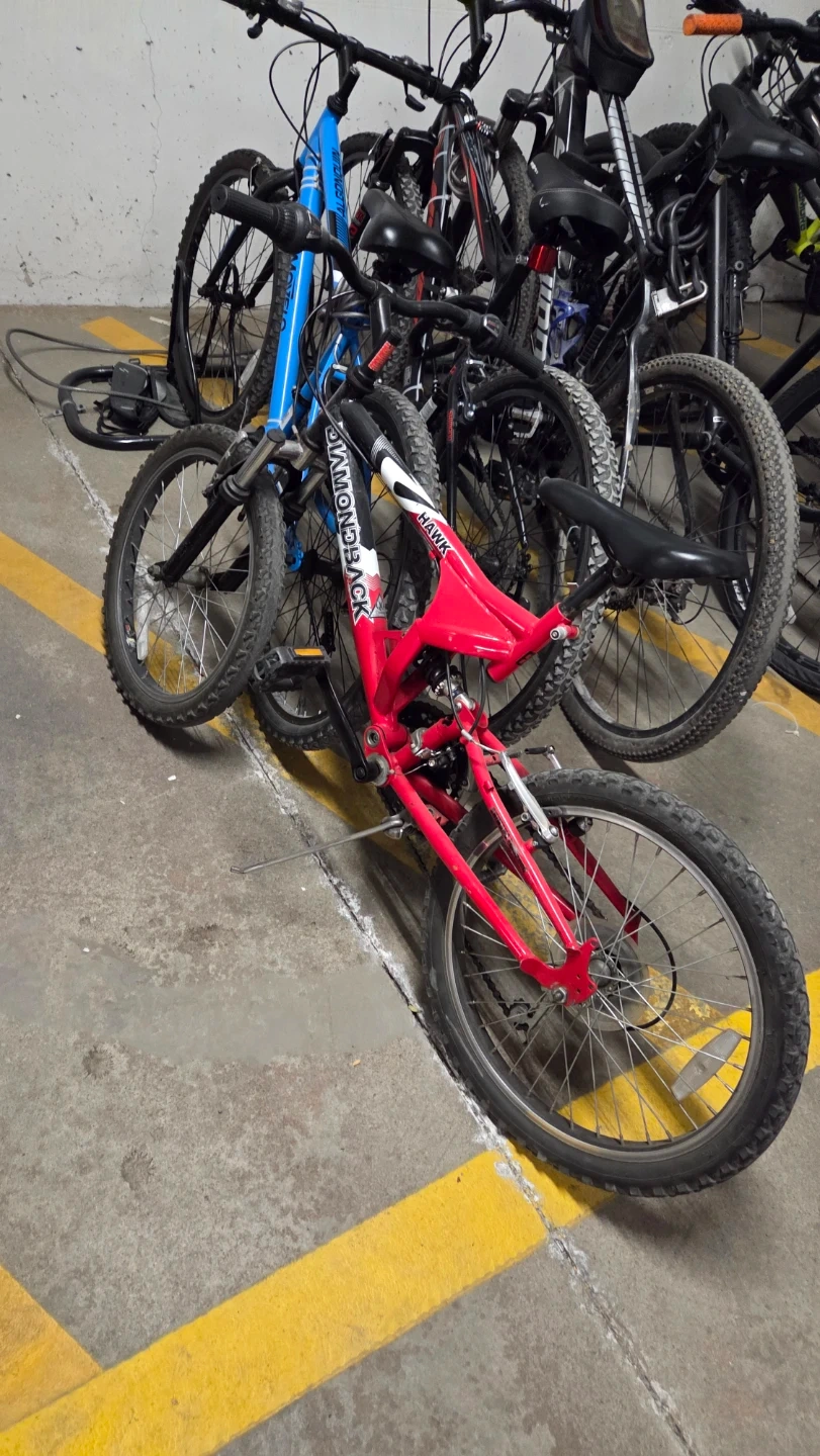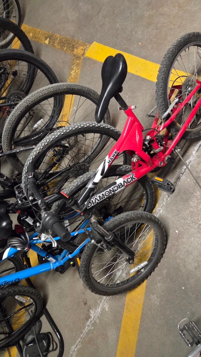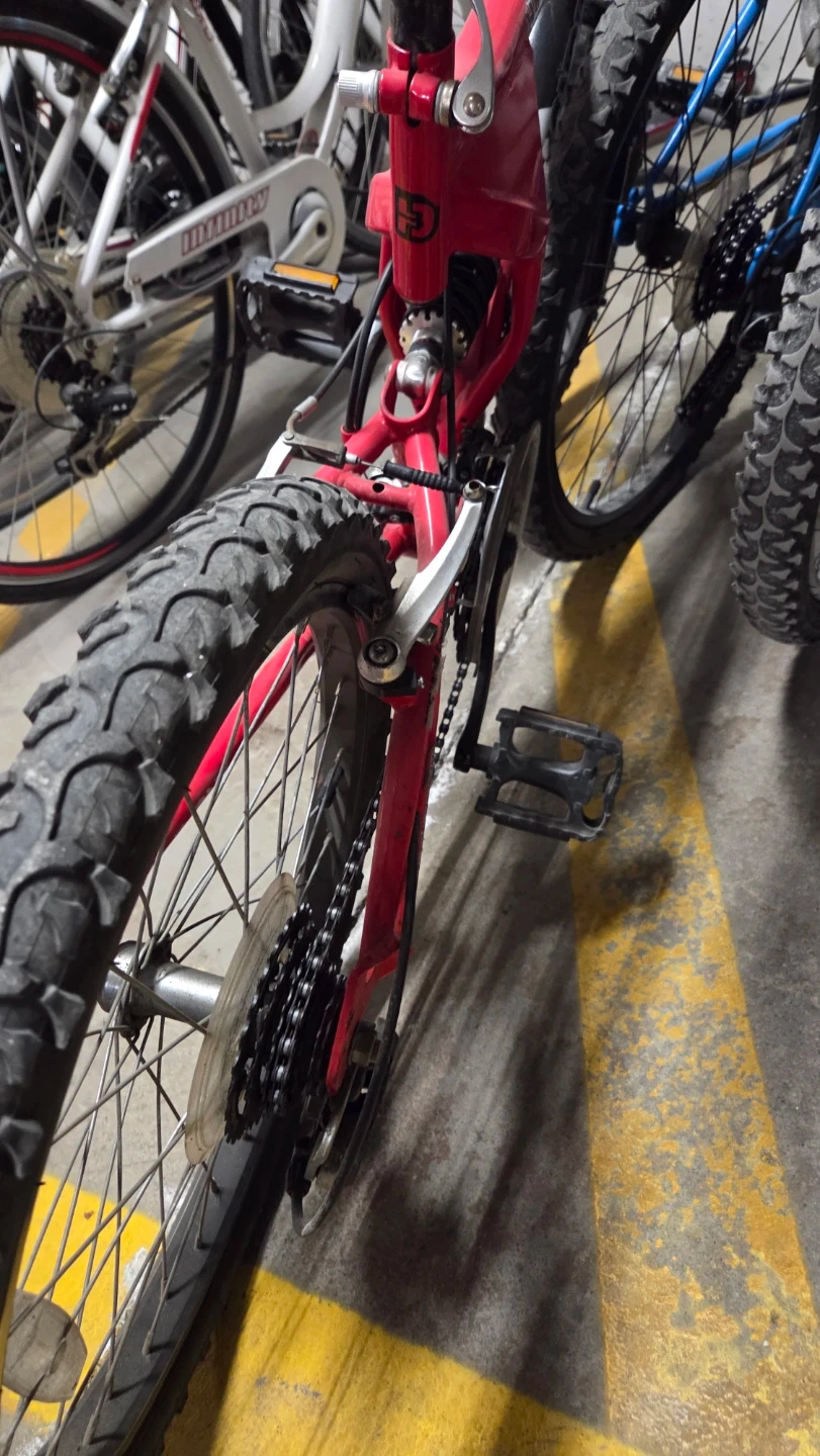 Red Diamondback mountain bike with "Hank" model designation. This bike has knobby tires suitable for varied terrain. It's a good option for recreational trail riding. Front and rear suspension.