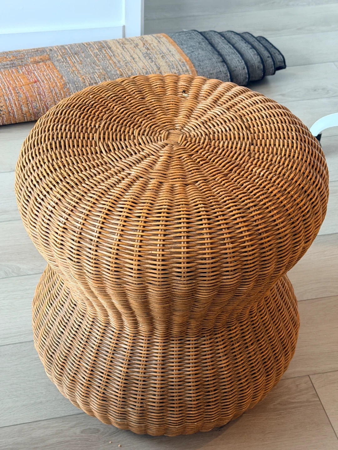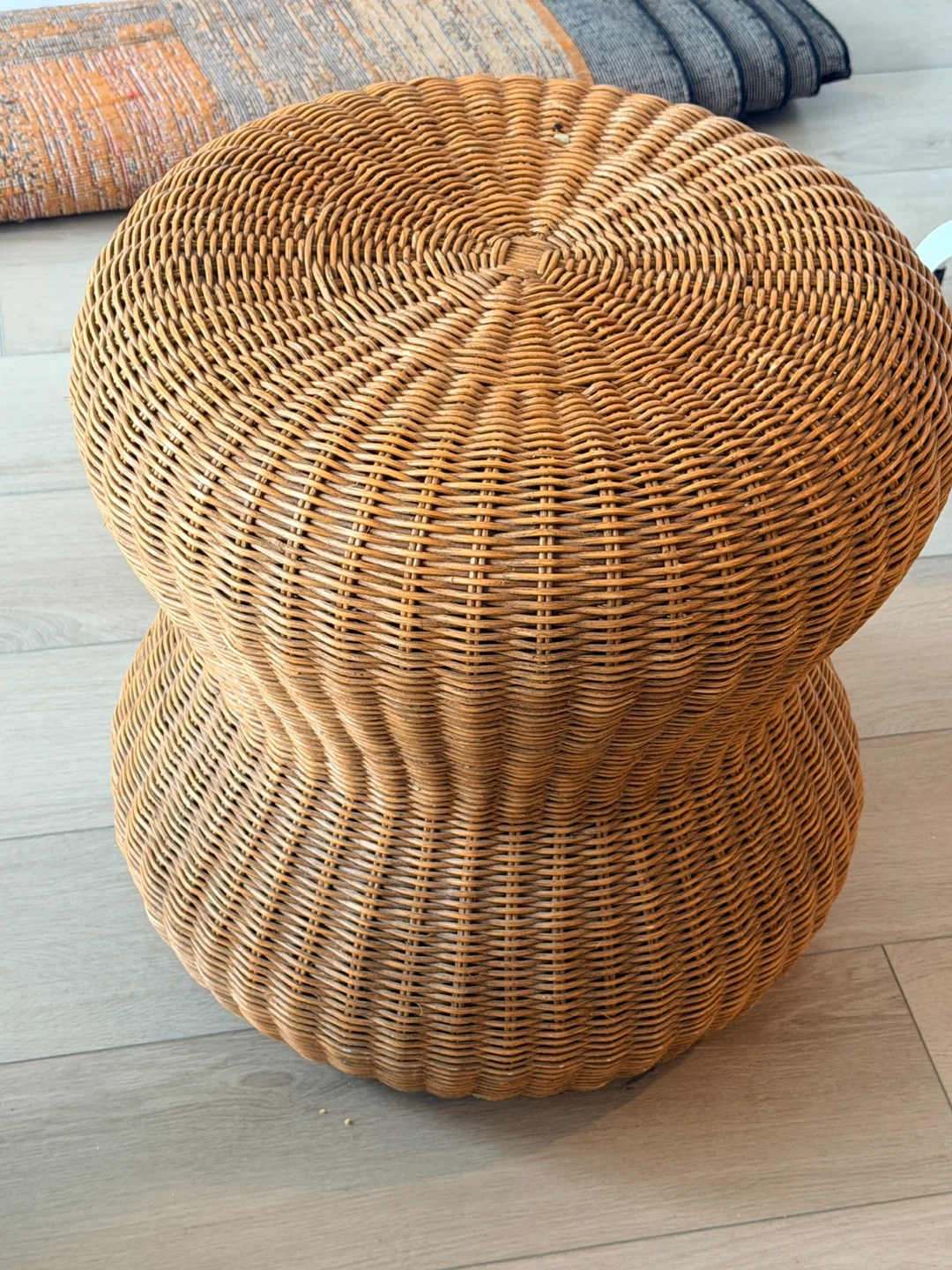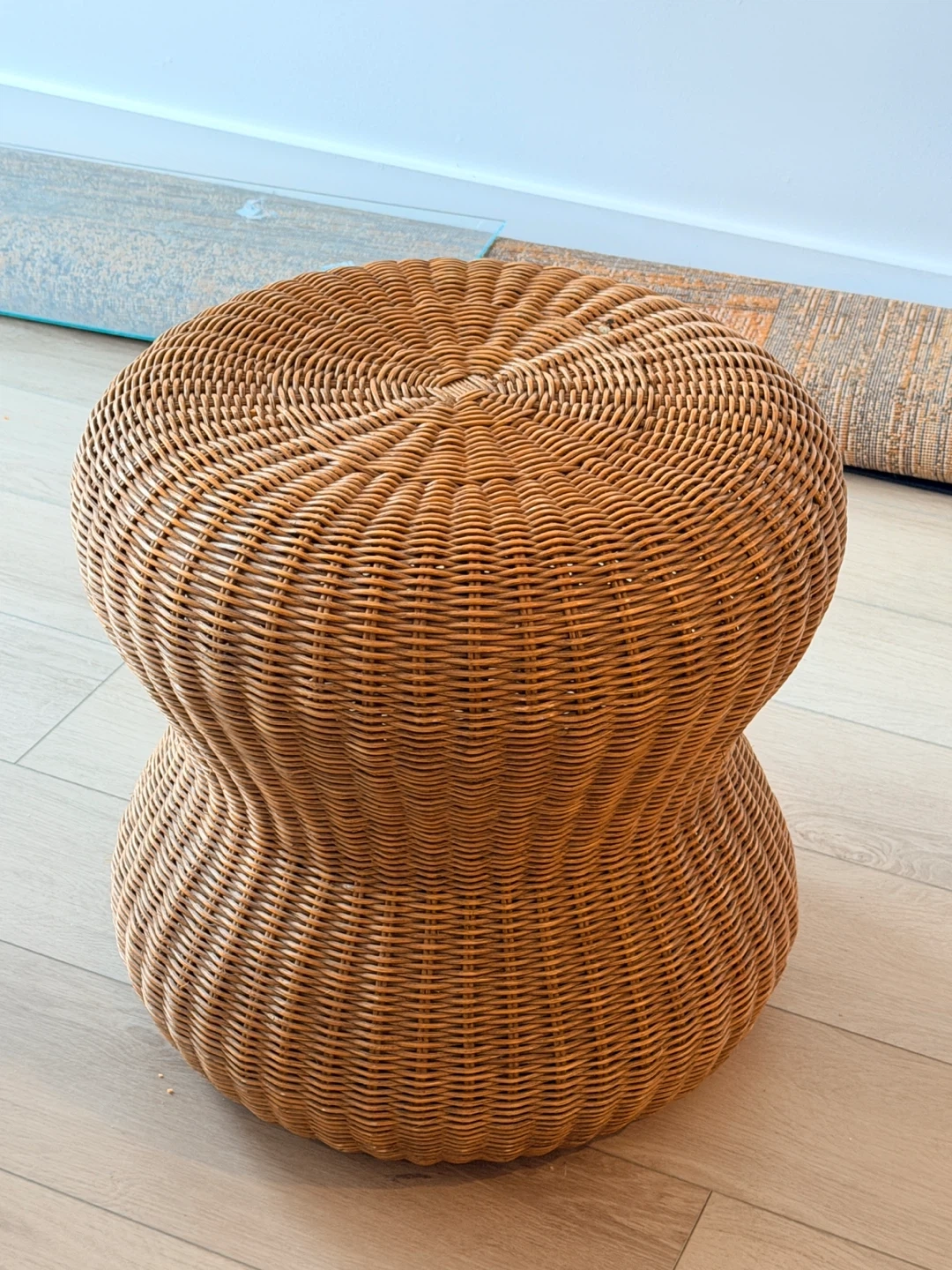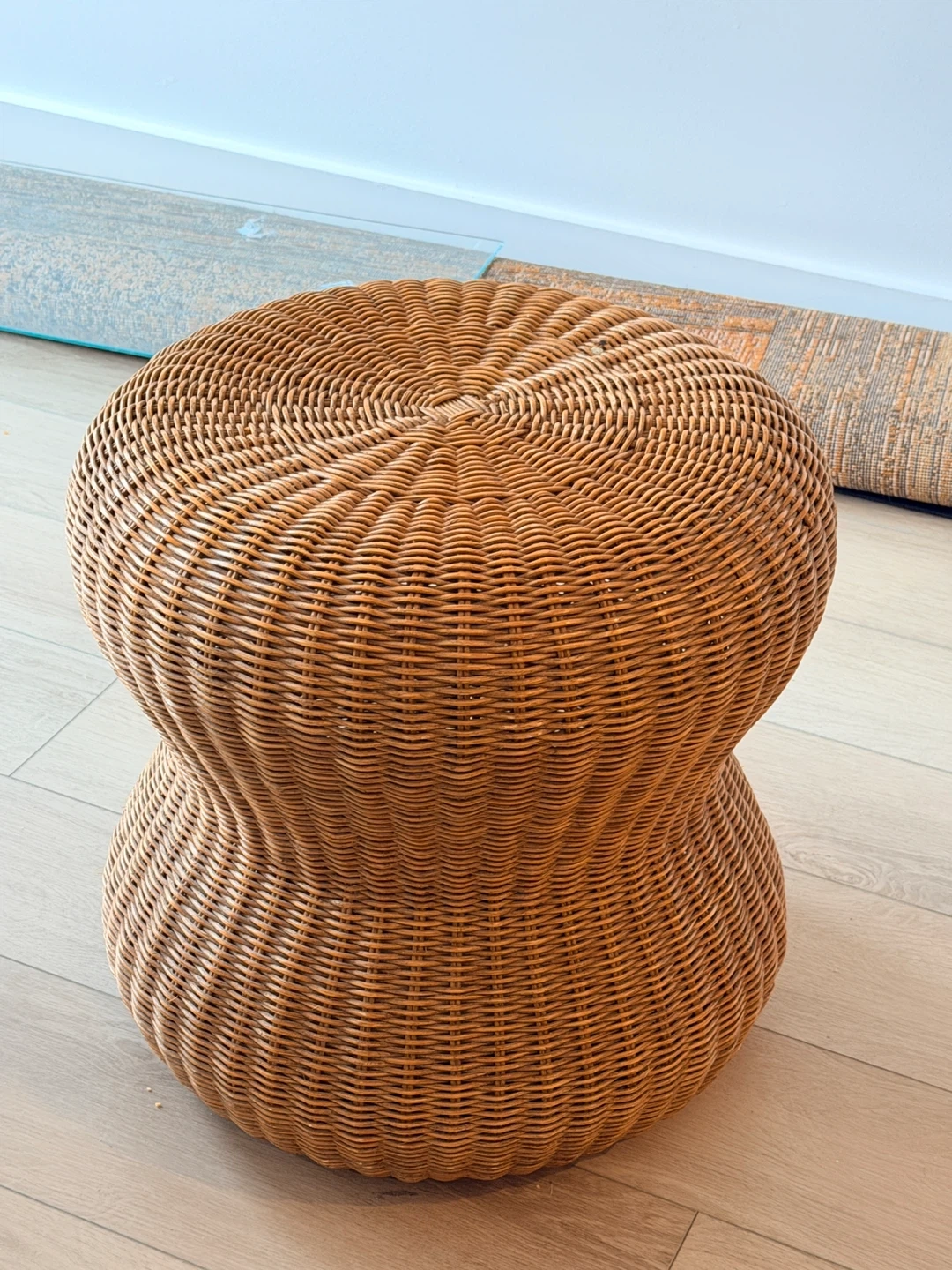This charming stool is crafted from natural wicker and rattan. Its unique hourglass shape and woven texture add a bohemian touch to any room. Perfect for an end table or extra seating!