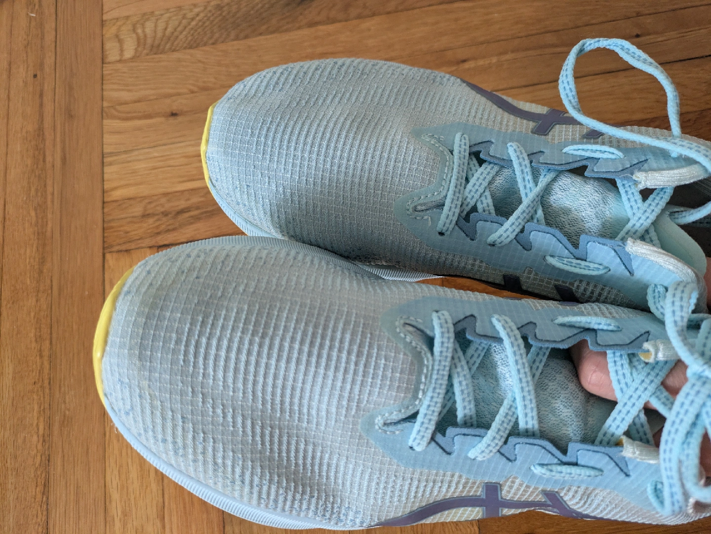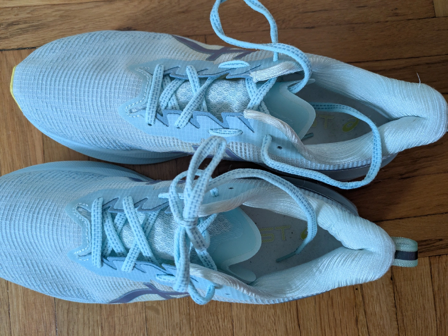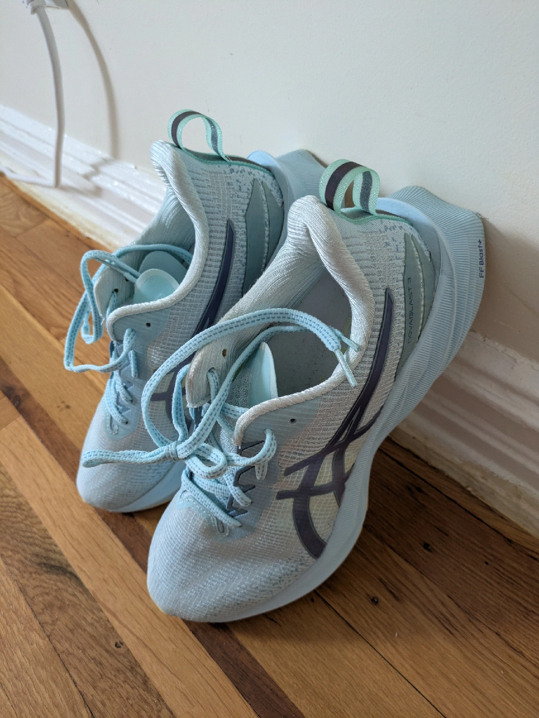 Selling a pair of ASICS Novablast 3 women's running shoes. These shoes feature a lightweight and portable design, perfect for running. The soles show some signs of wear. 27.5 cm on the insole. 10 km passed in them. After barefoot shoes, my foot expanded and I want other shoes. I washed them in Castile soap, cold water. Sell clean!!!