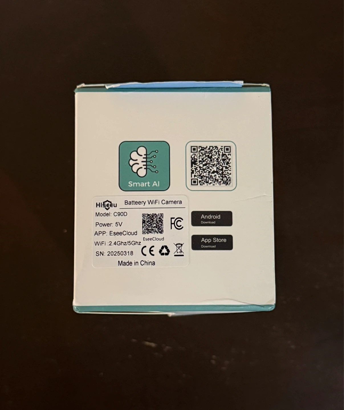 This is a Hisense C90D 4MP wireless camera. It's designed for indoor or outdoor use and is battery powered. It supports WiFi at 2.4GHz/5Ghz and offers full HD camera capabilities, AI analysis, and color night vision. The app used is EseeCloud. Has AI overview and monitoring and other features that makes monitoring and securing your home a breeze.