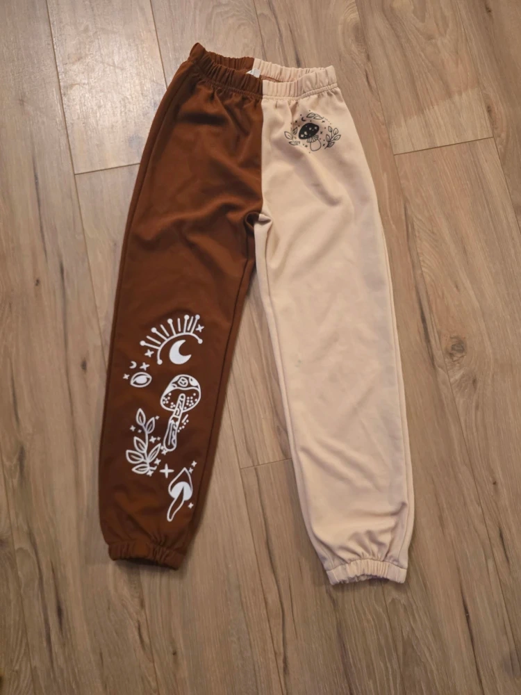 Cute split-colour sweatpants with a mushroom print! One side is brown and the other is beige. Perfect for lounging around the house or running errands.