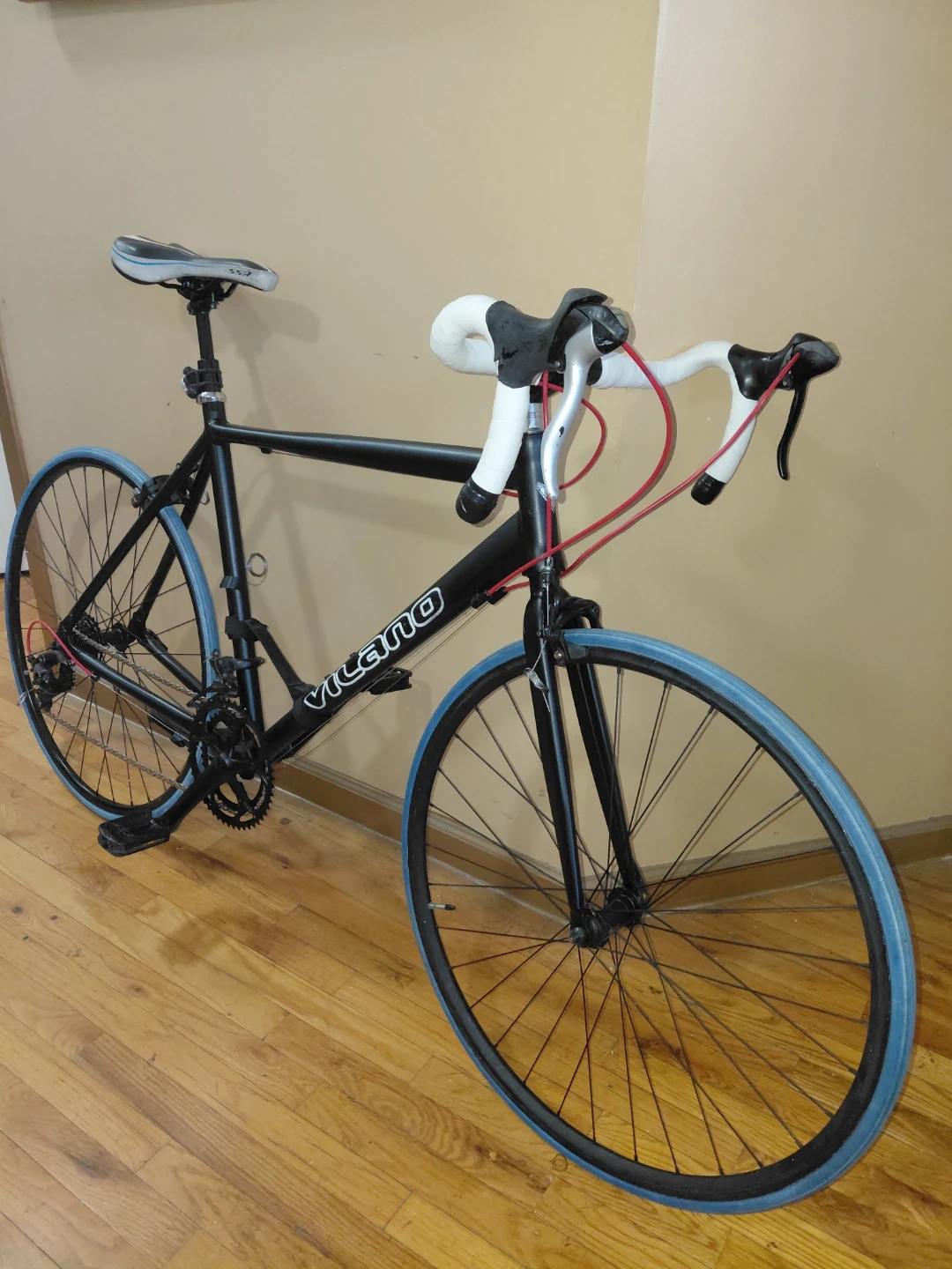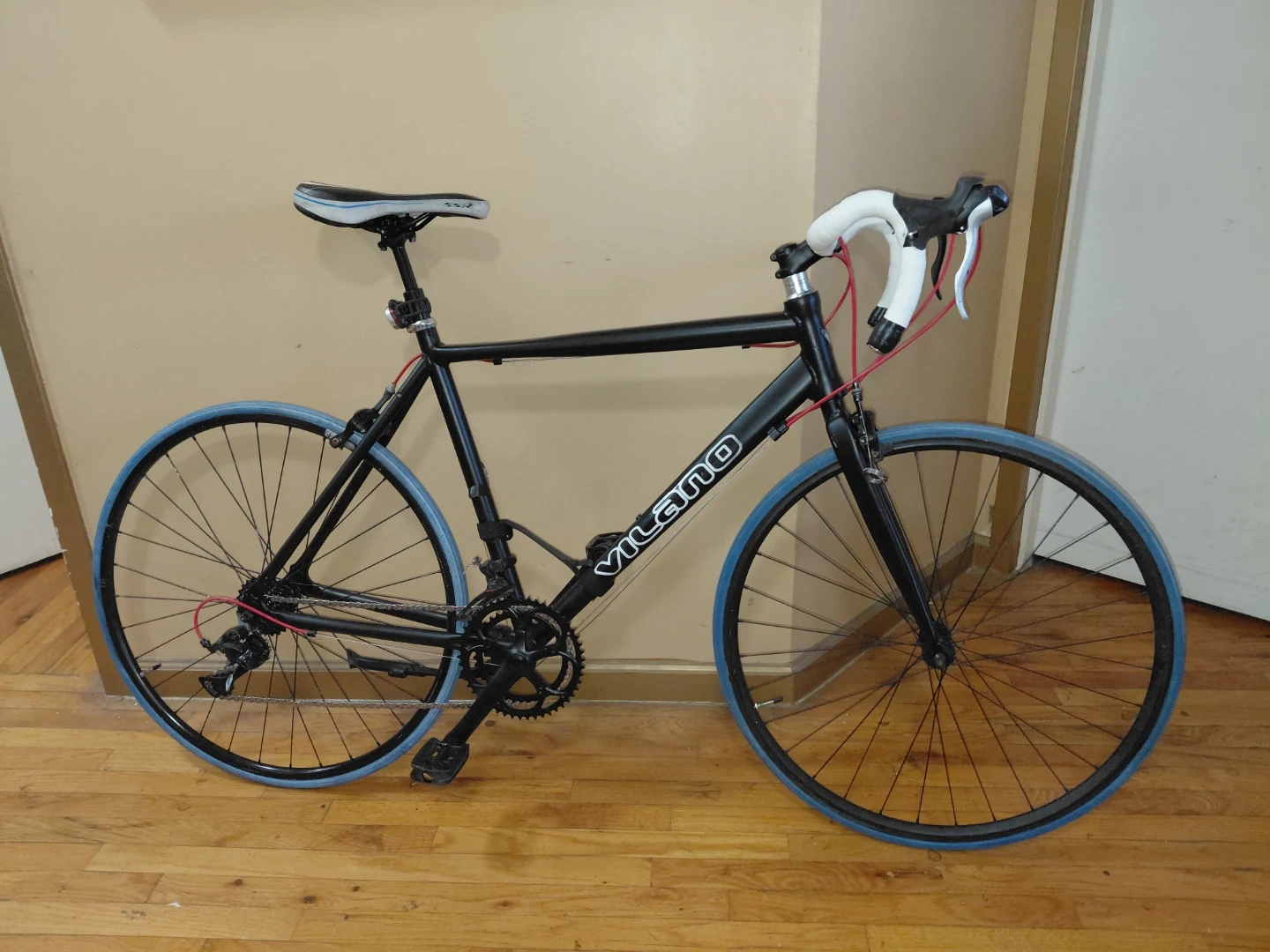 Vilano black road bike. Features blue tires and white handlebar tape. Ready for your next ride!. This is a perfect Beater for someone who wants to be a tourist in their own city or commute to work or the Park. This Bike belonged to an adult room mate who has left NYC that is the reason why I am selling it today. First with cash can take it home ASAP and have a great bike.