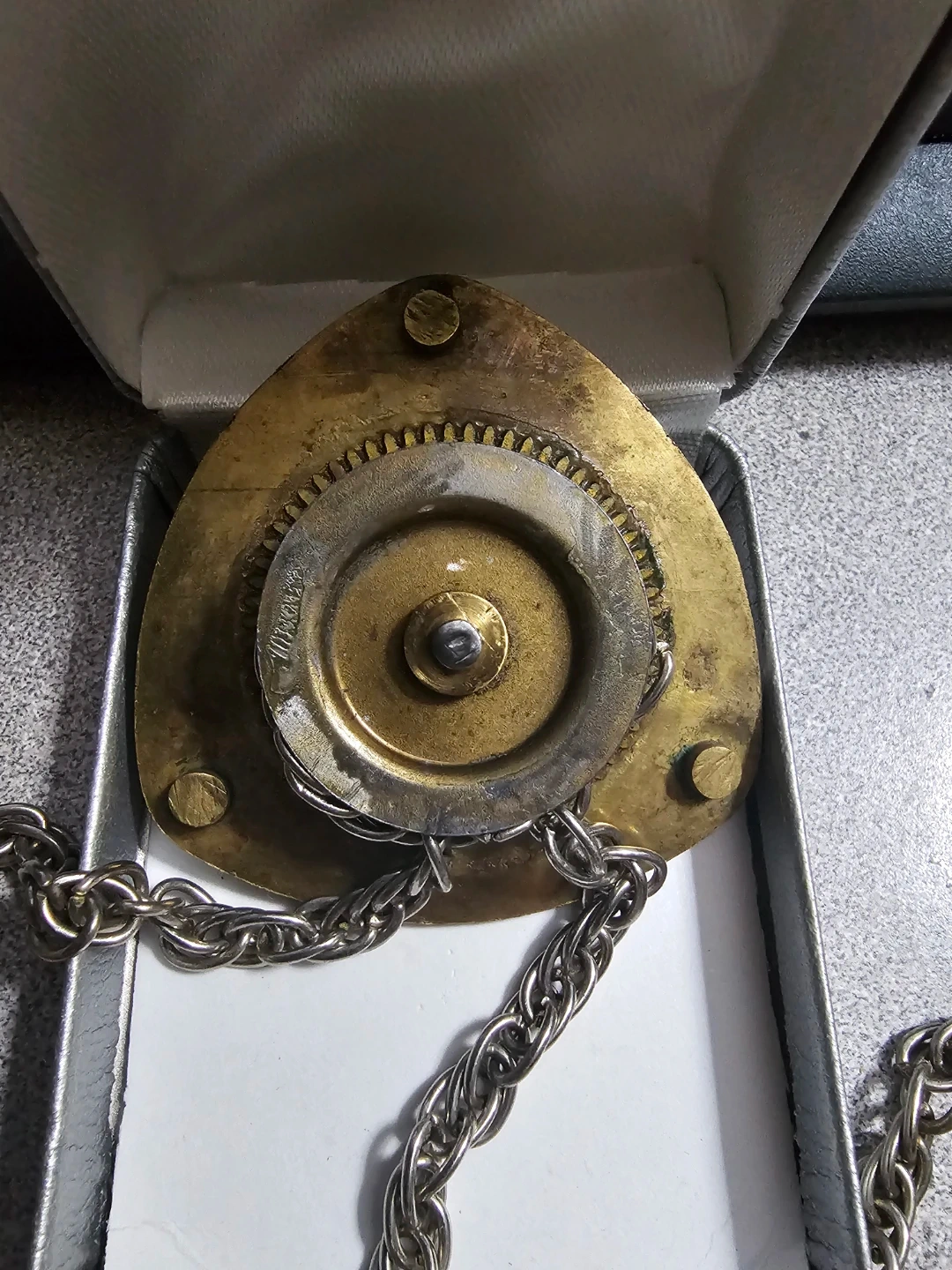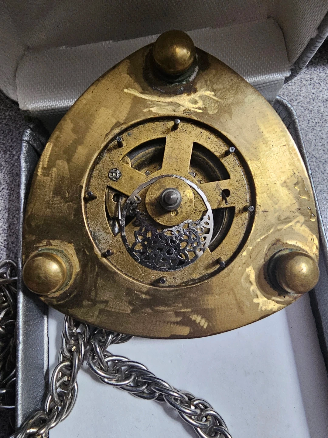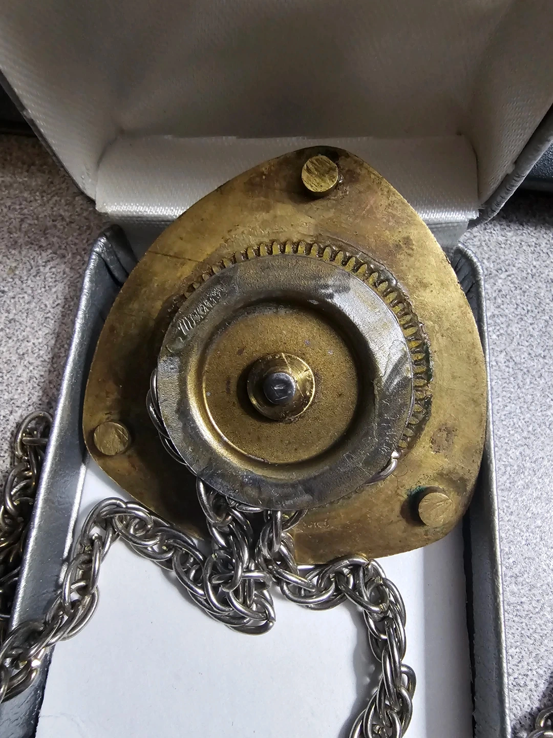 Cool vintage brass instrument. Has a unique triangular shape with exposed gears and a long metal chain. Comes with its original grey case. Great for collectors or as a decorative piece.