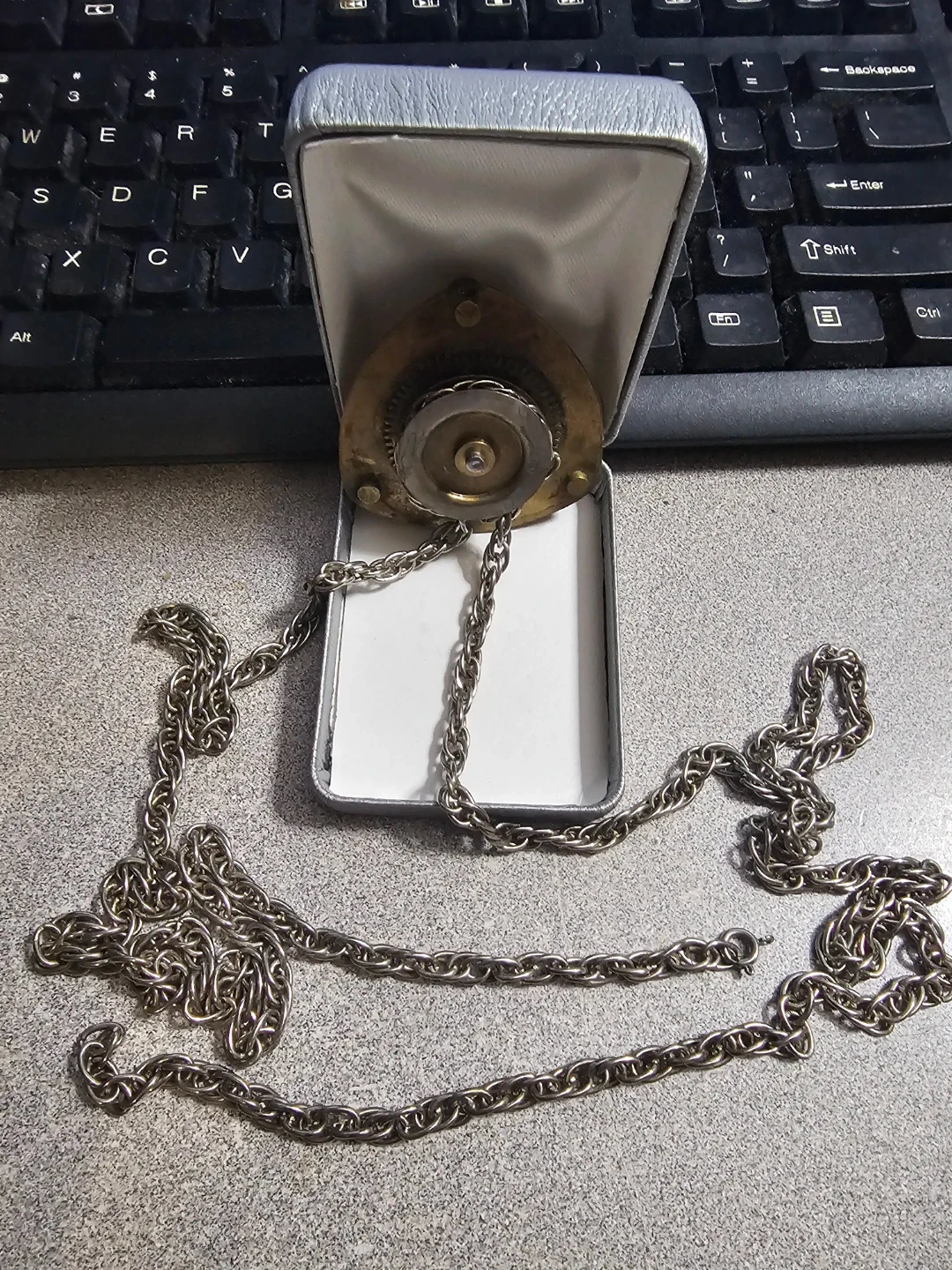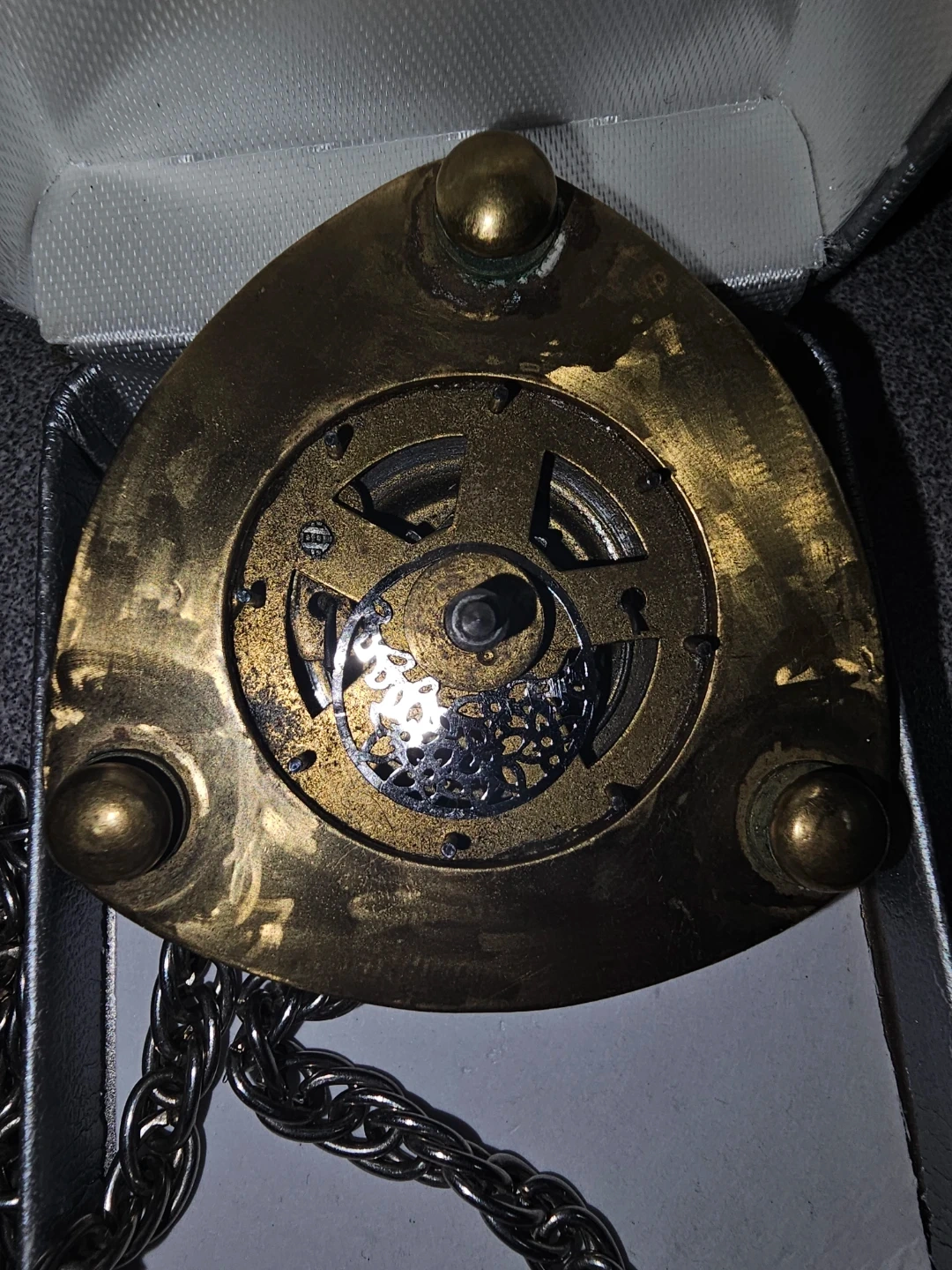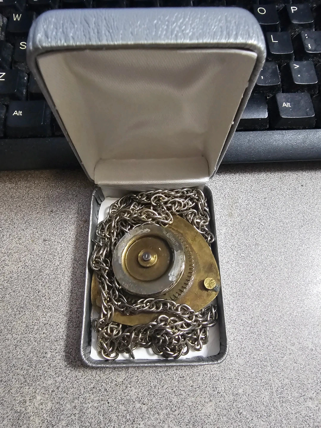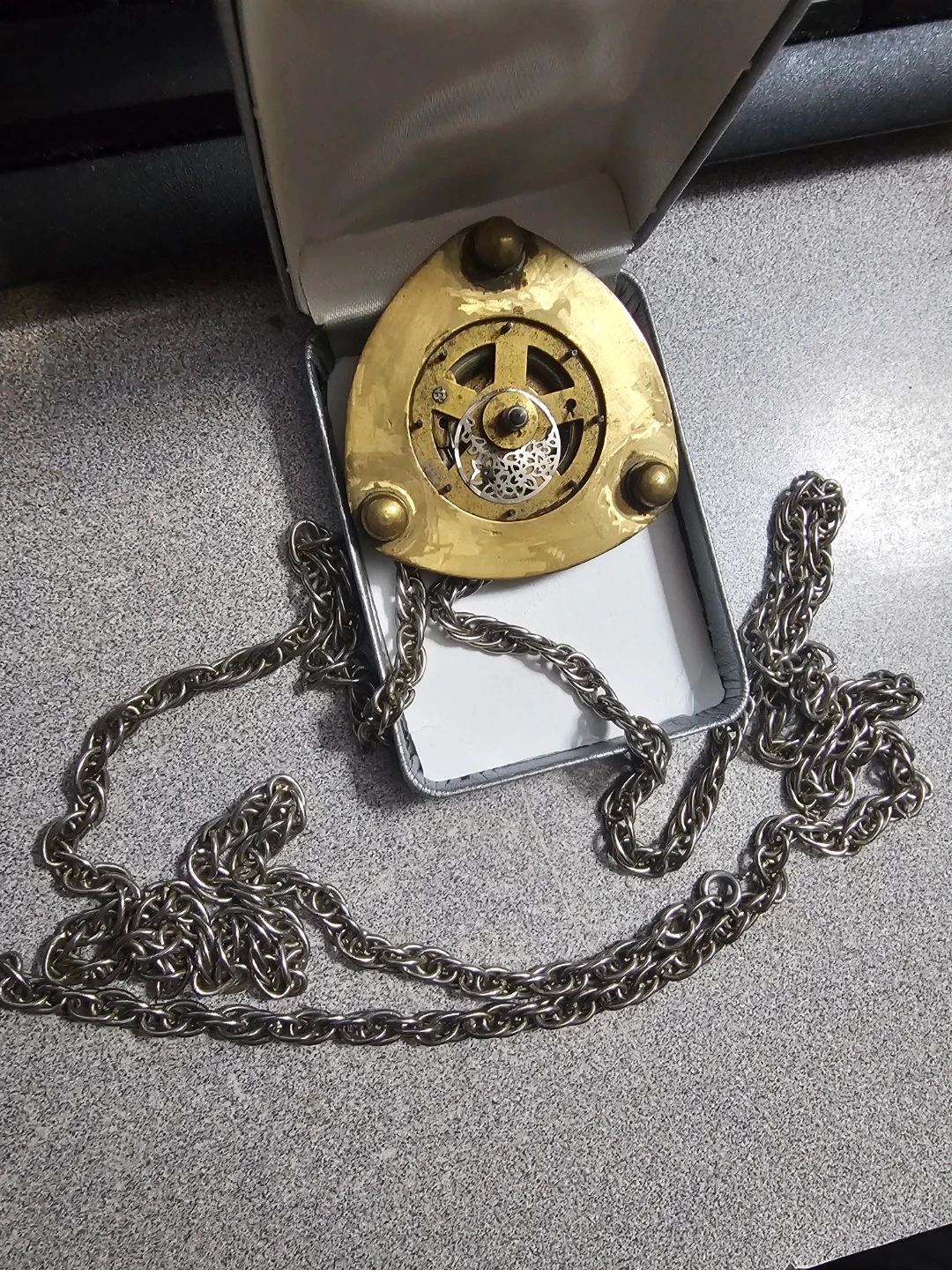 Cool vintage brass instrument. Has a unique triangular shape with exposed gears and a long metal chain. Comes with its original grey case. Great for collectors or as a decorative piece.