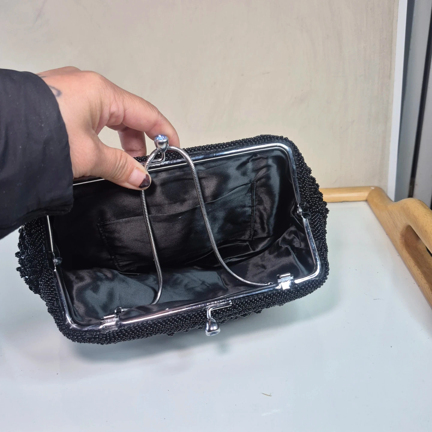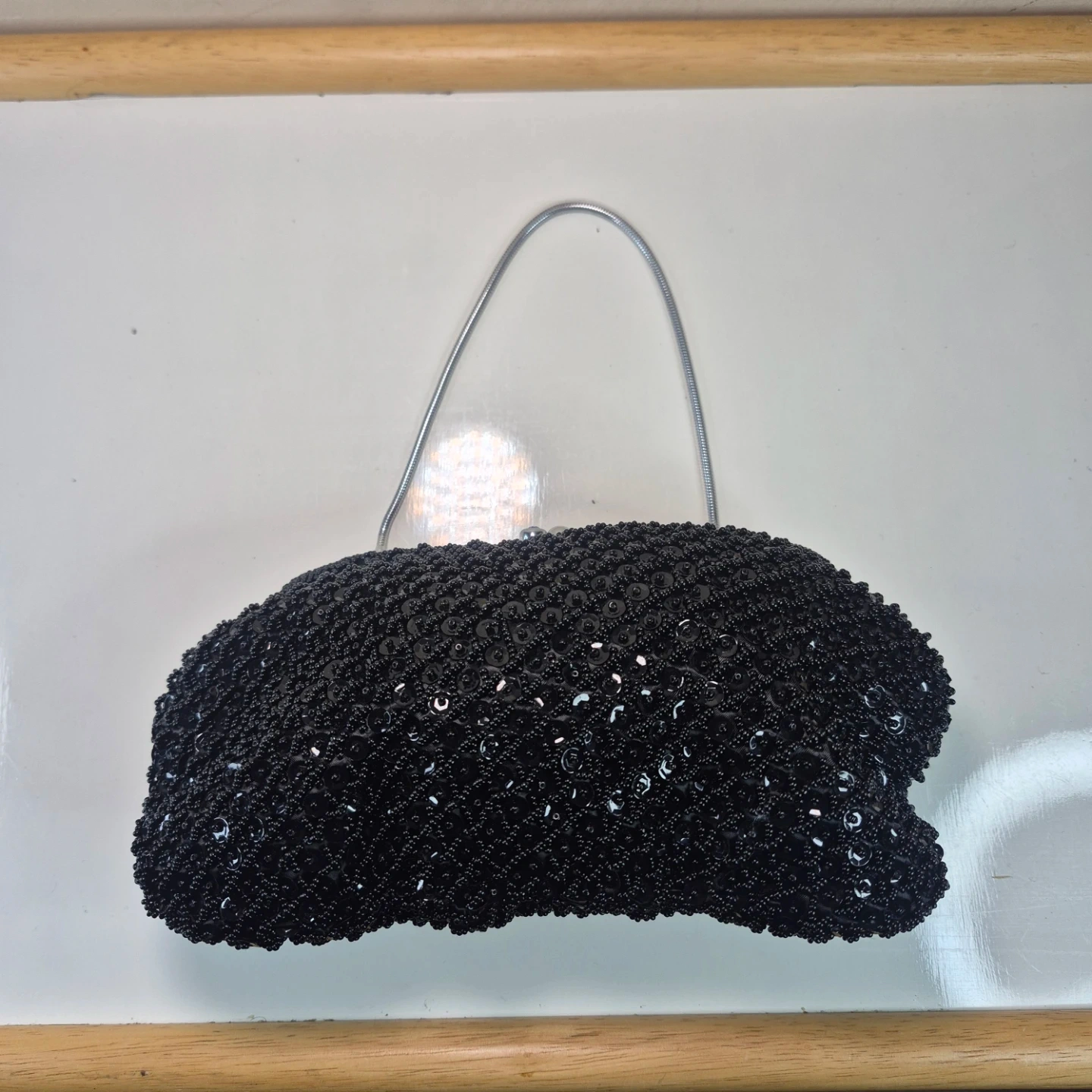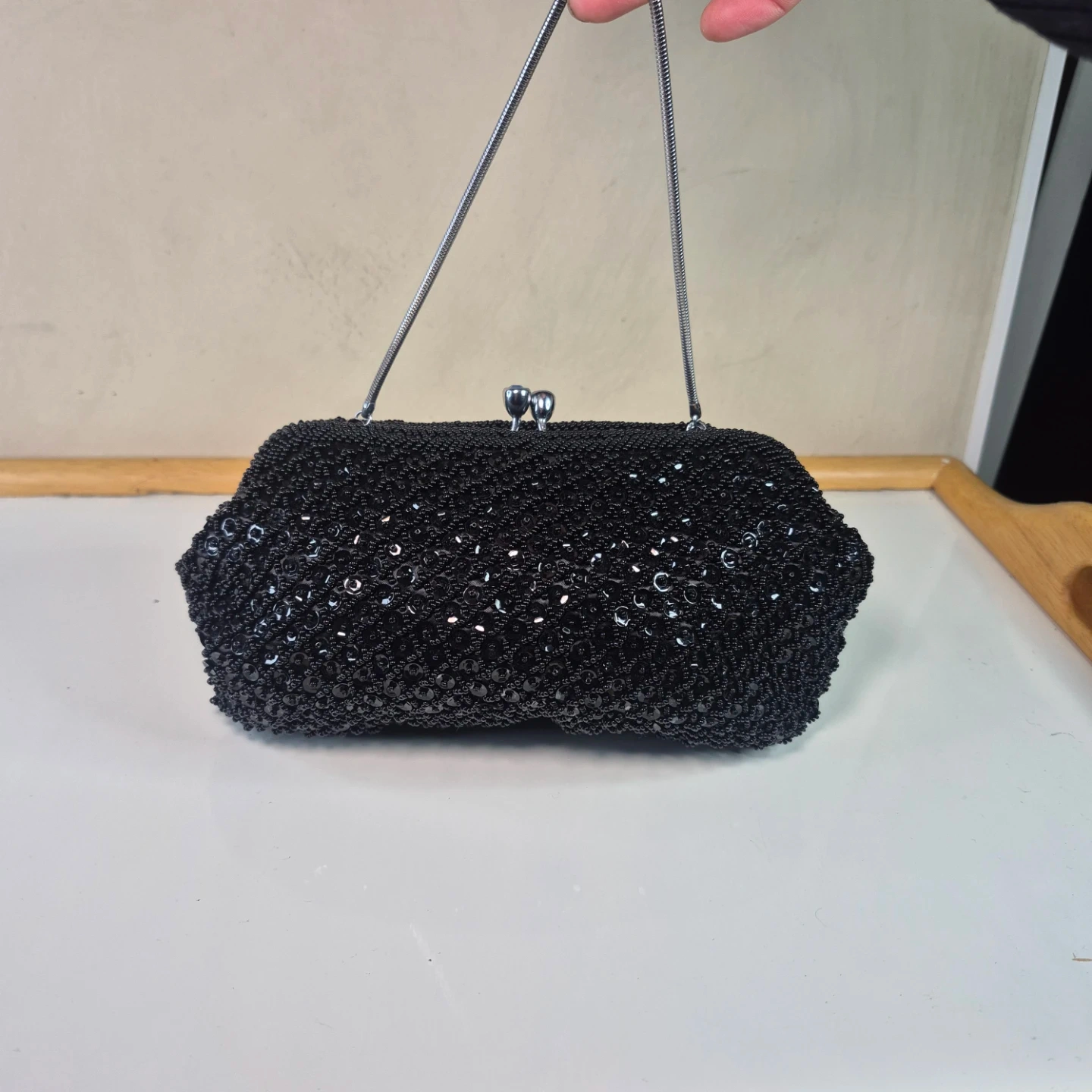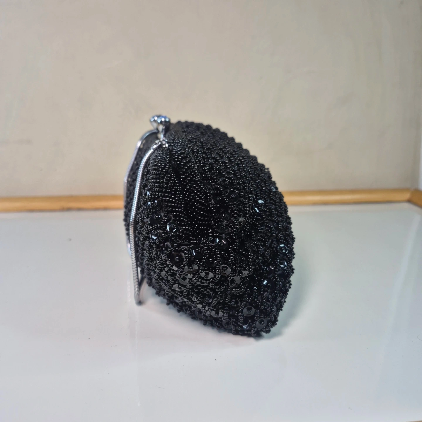 A stylish black beaded clutch bag with a silver snake chain strap. It features a secure clasp closure and a satin lining inside. This evening bag is perfect for special occasions or formal events!