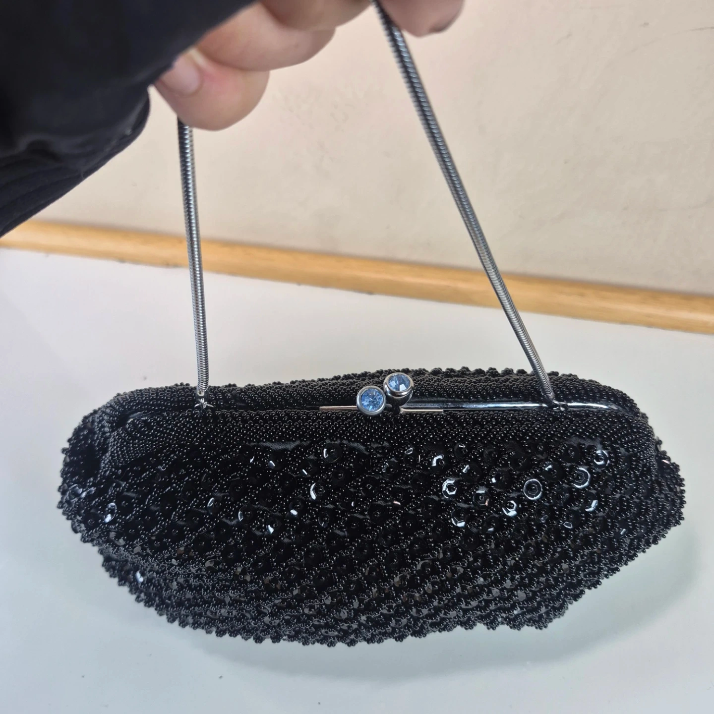 Black Beaded Clutch Evening Bag with Silver Chain