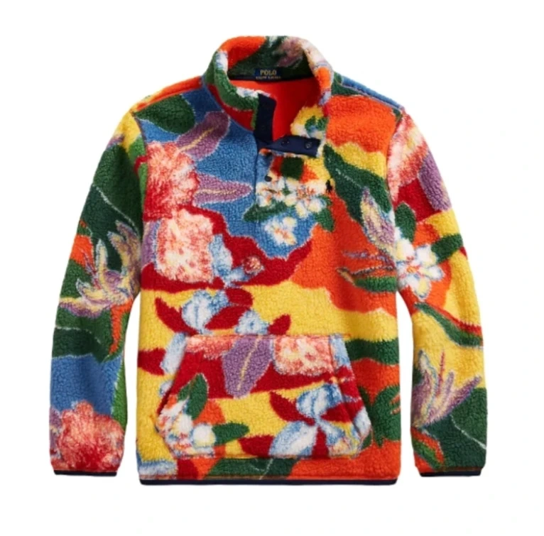 Polo Ralph Lauren colorful floral print fleece pullover. Features a snap-button placket and a front kangaroo pocket.
