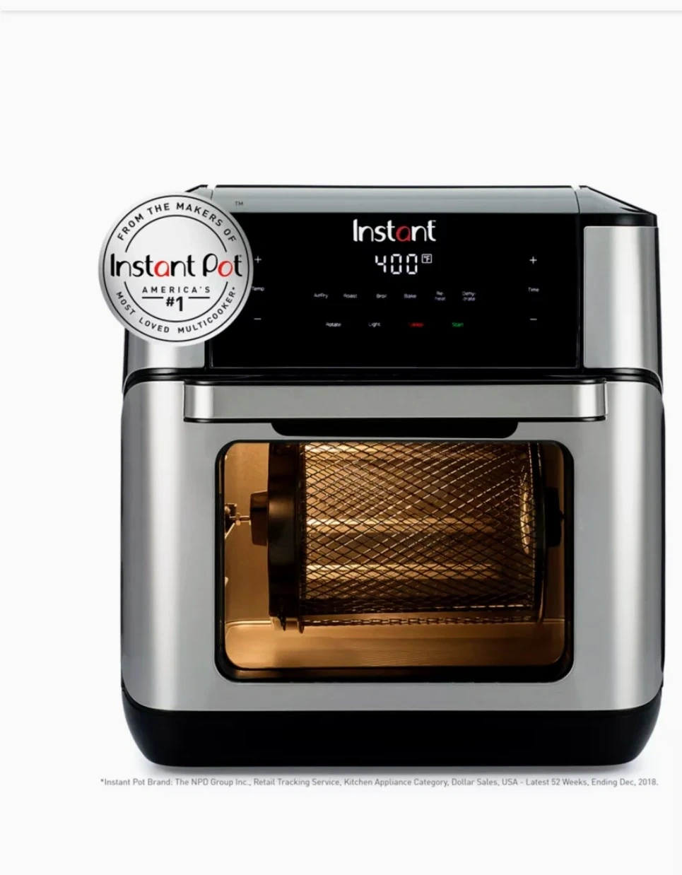 This Instant Vortex Plus air fryer oven fries, bakes, roasts, dehydrates, and more! It features multiple racks for cooking different items at once. Comes with rotisserie spit and forks for easy roasting.
