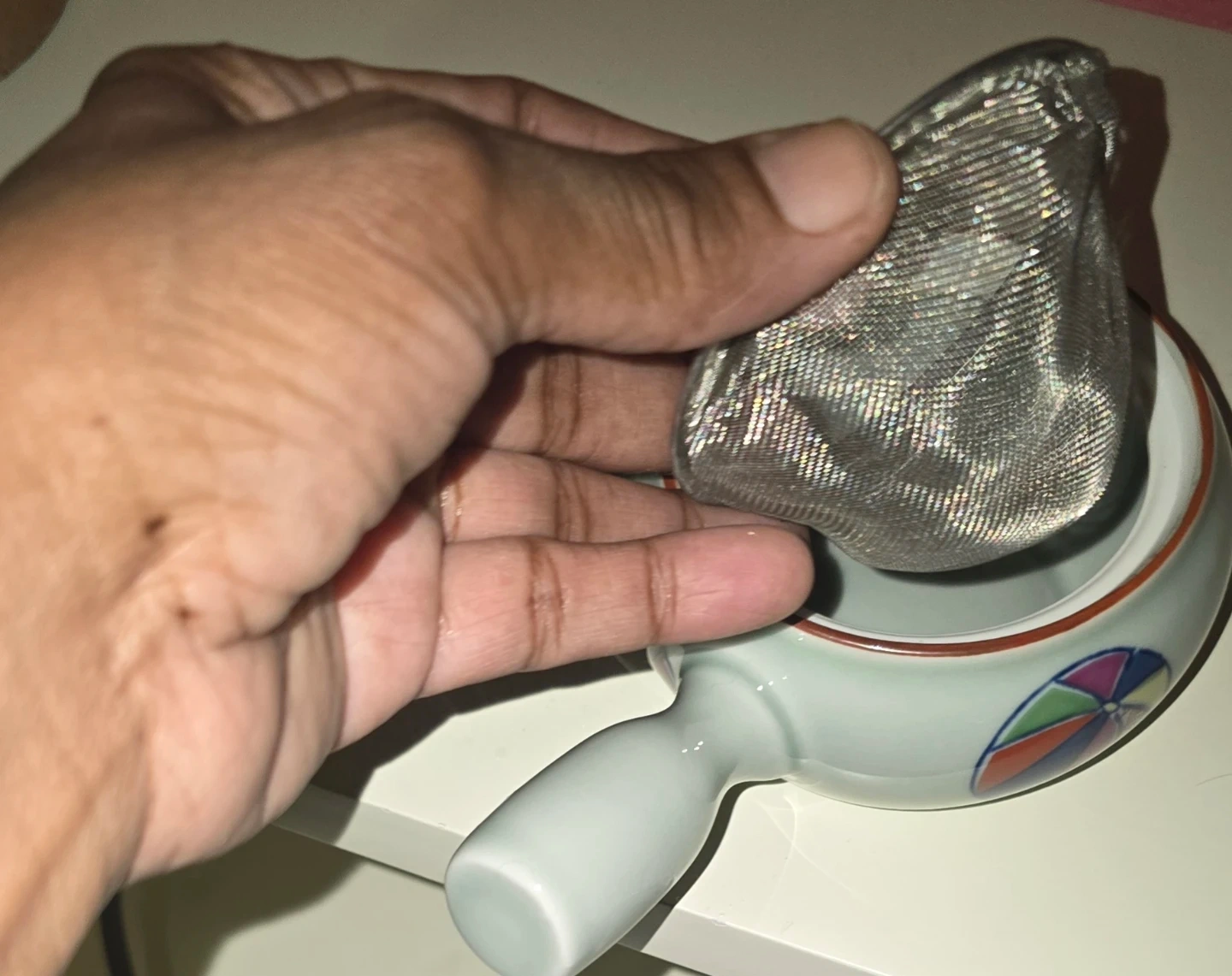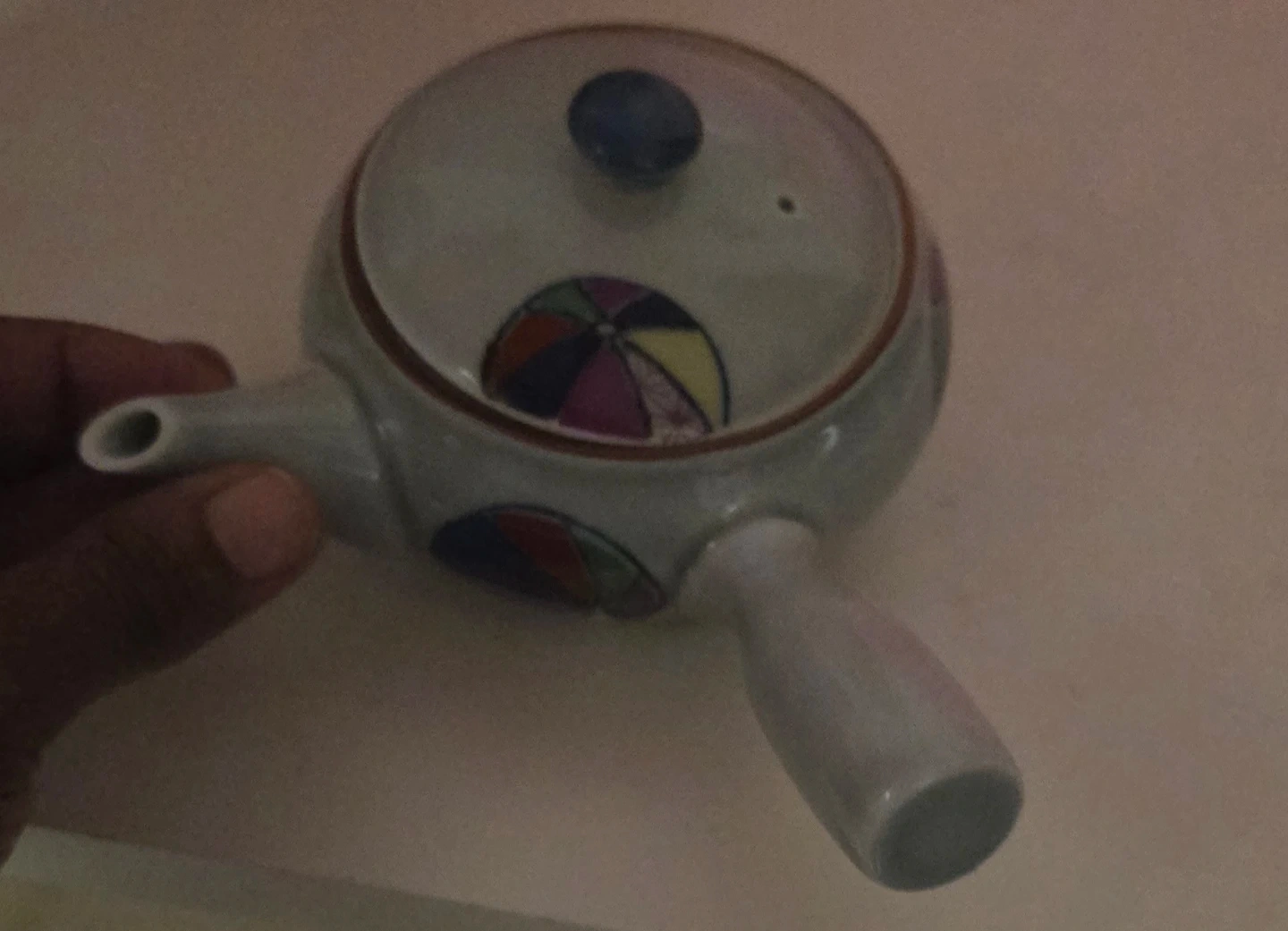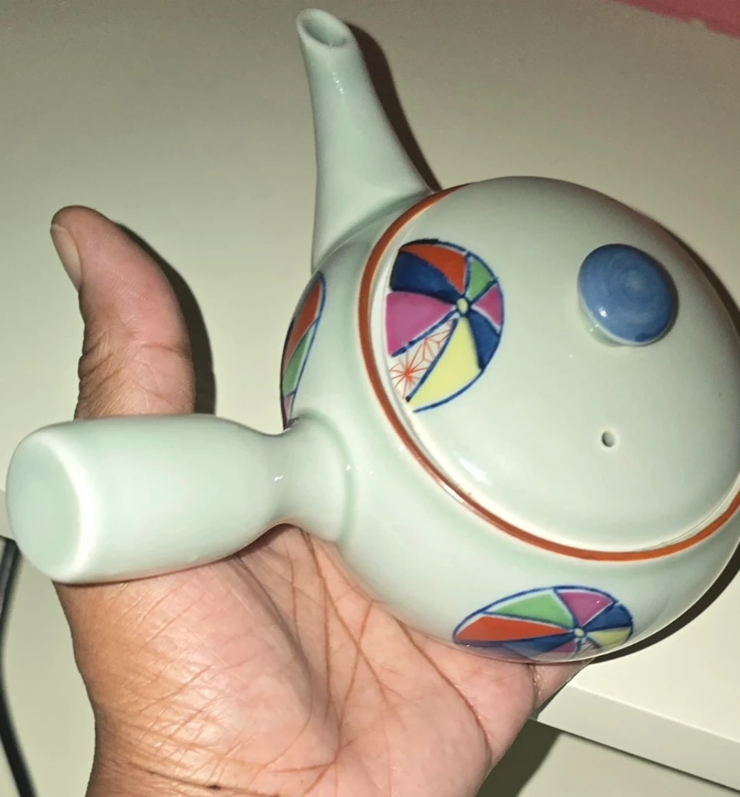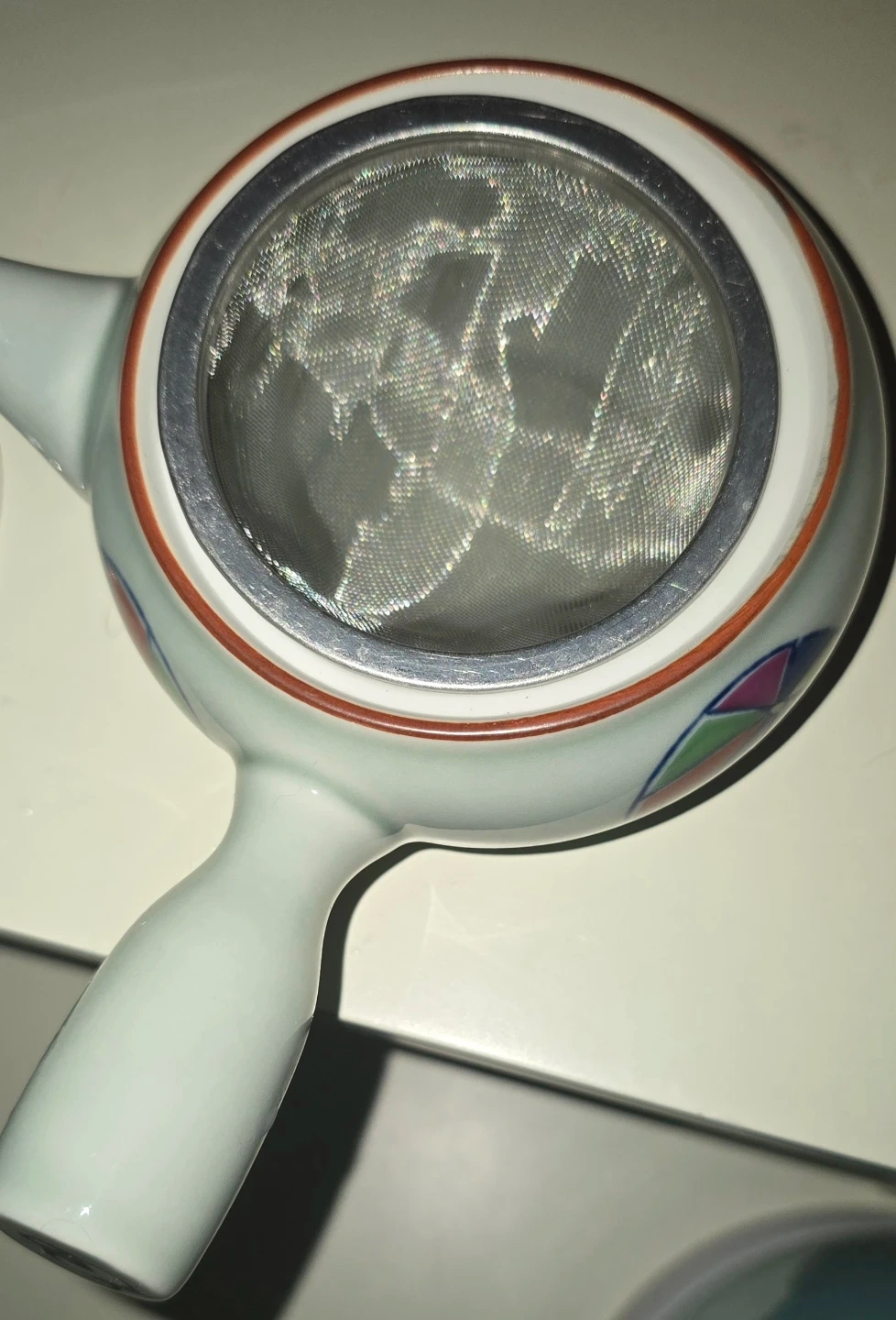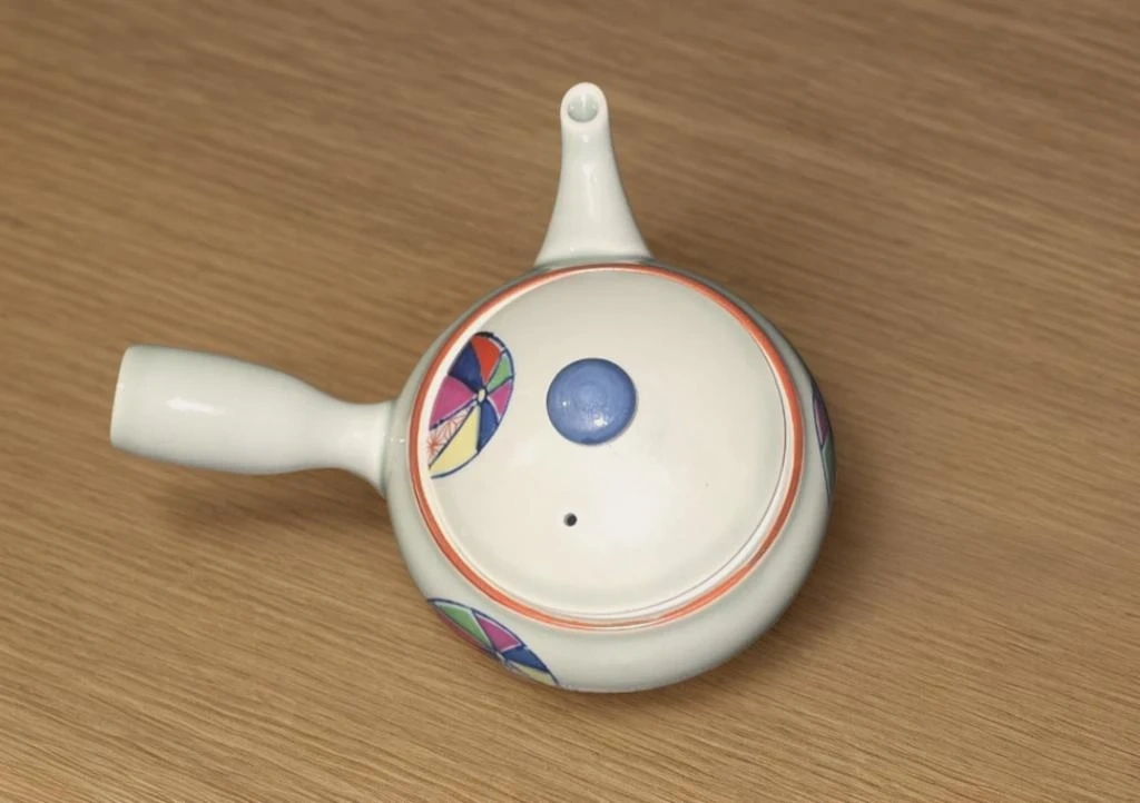 This is a small china antique ceramic teapot with a stainless steel infuser. It features a decorative pattern of colorful pinwheels. The teapot is white with an orange rim detail and a blue knob on the lid. It's perfect for brewing loose-leaf tea!