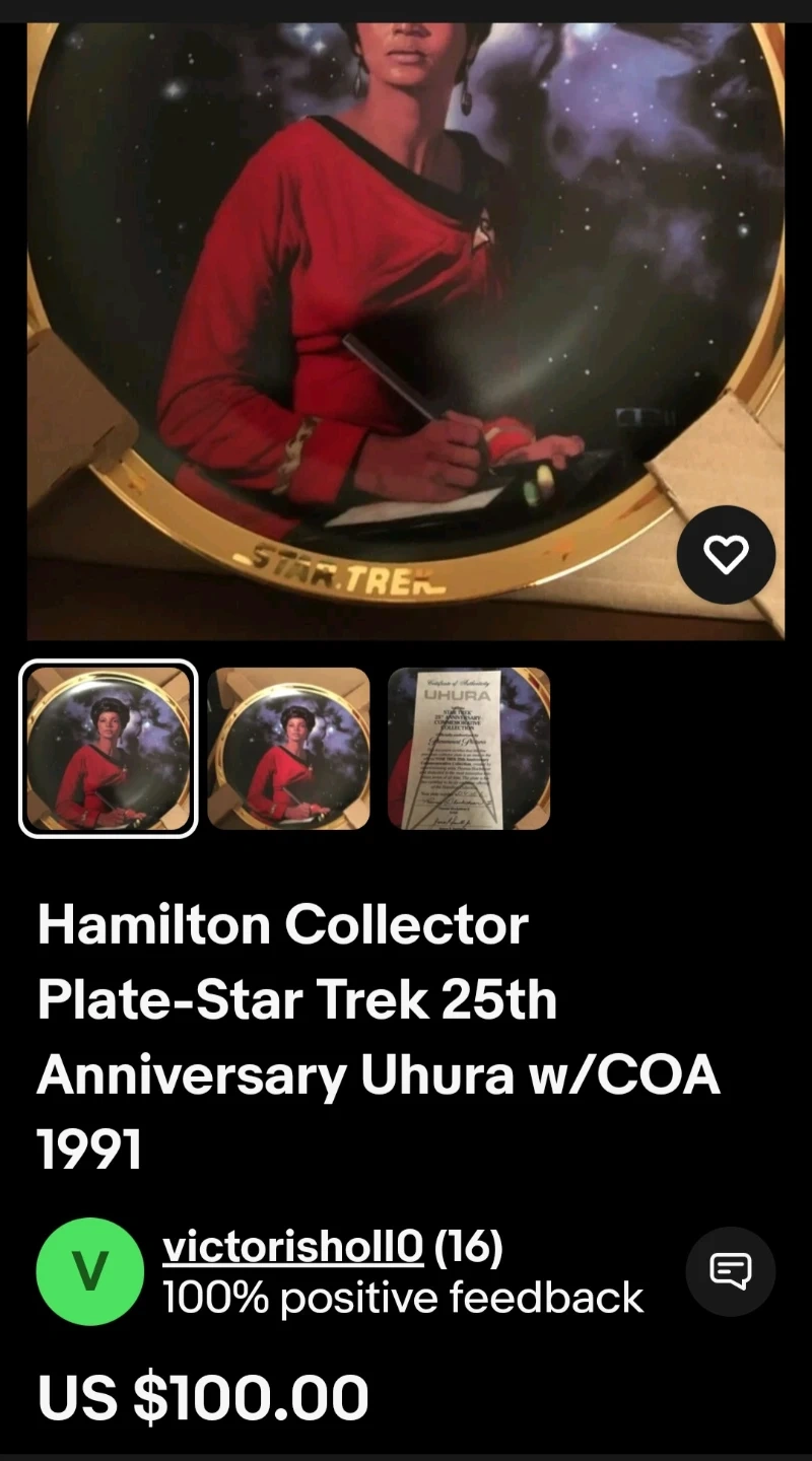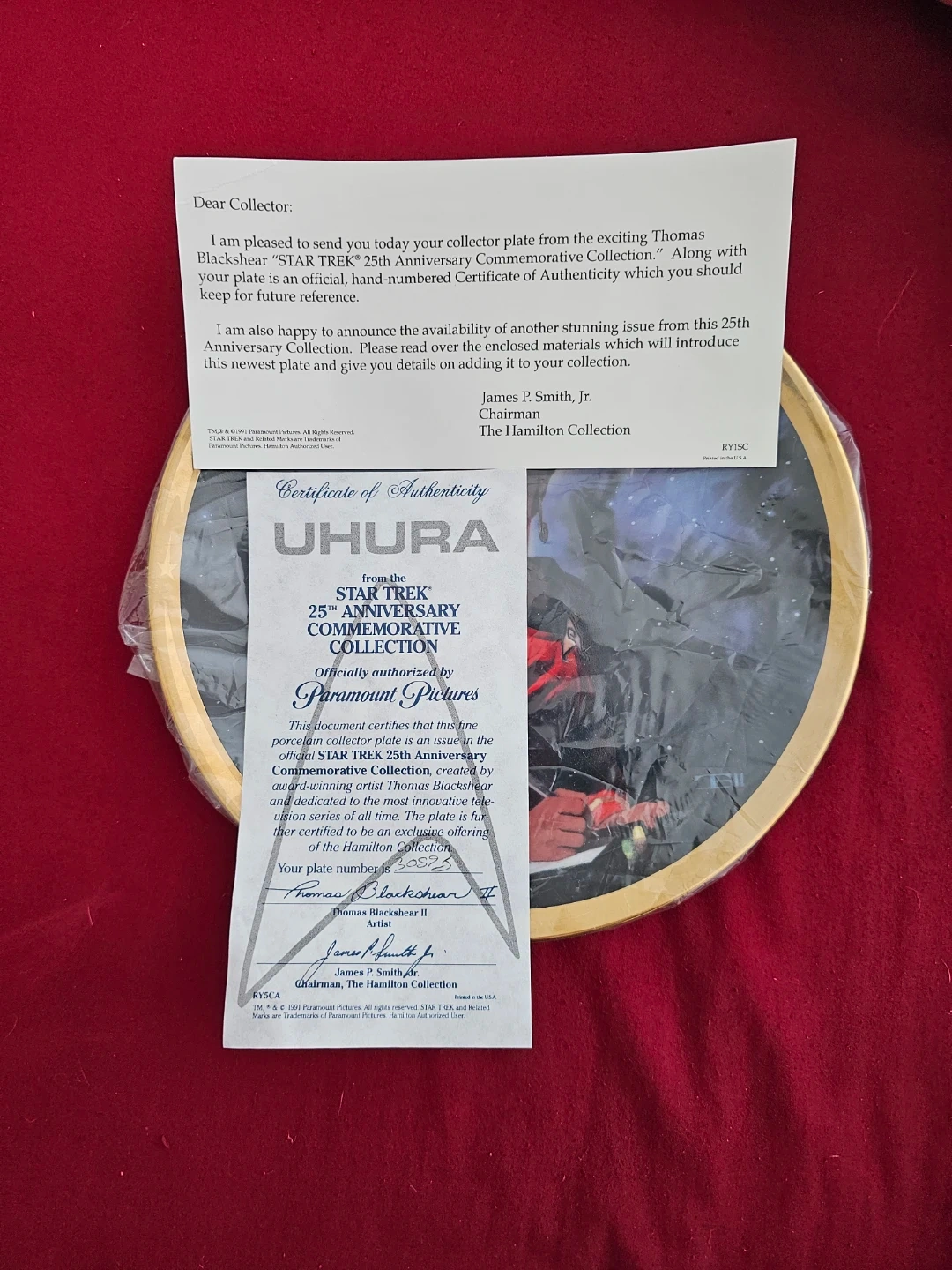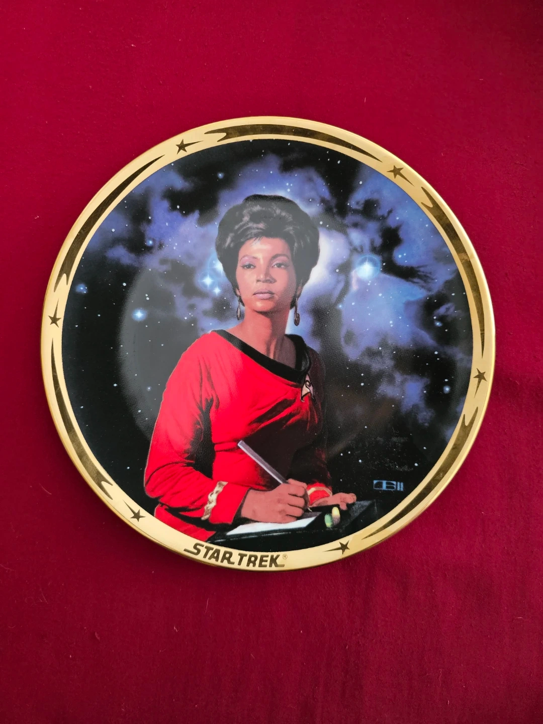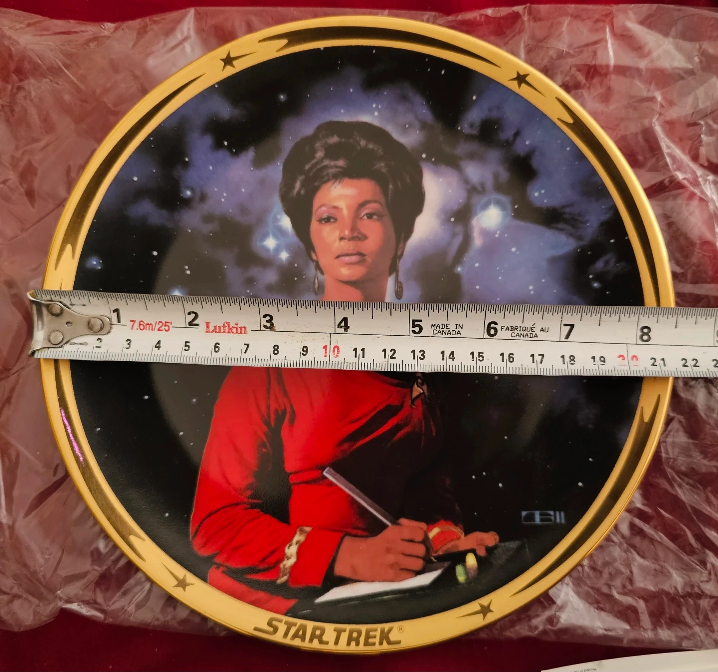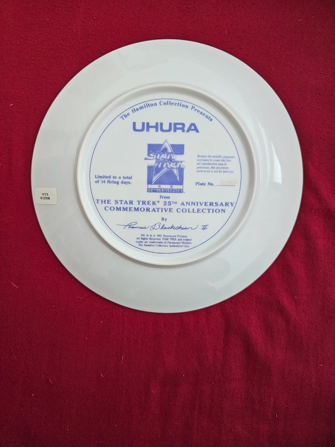 Thank you for considering this Star Trek 25th Anniversary Commemorative Collection plate featuring Nichelle Nichols' Lieutenant Nyota Uhura from Star Trek, the original series! This is a full size plate at 8½", and is from The Hamilton Collection, and is officially authorized by Paramount Pictures. It comes with a certificate of authenticity and is in MINT condition. A must-have for any Star Trek fan!