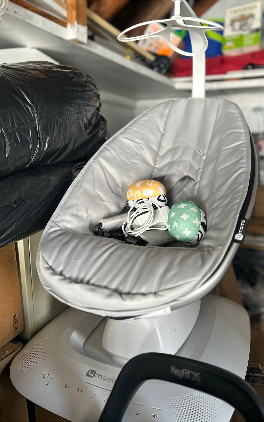This is a 4moms RockaRoo infant seat in gray. It's a gentle rocking motion seat for babies. Includes three toy balls.