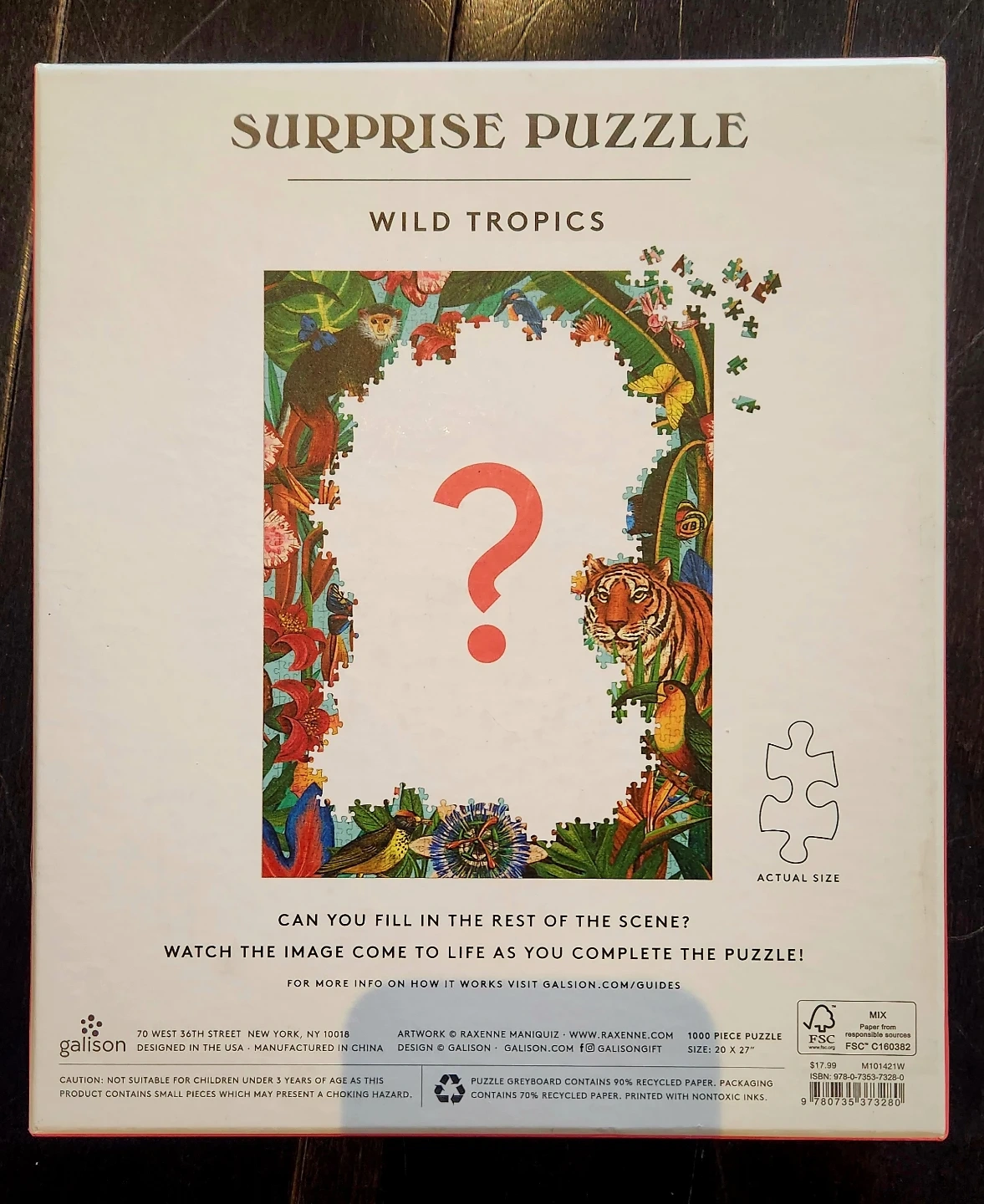 This Galison Wild Tropics Surprise Puzzle has 1000 pieces and a "Wild Tropics" theme. The scene emerges as you complete the puzzle. It's made with 70% recycled paper and printed with soy-based inks. All parts there. Never had the patience to complete it lol.