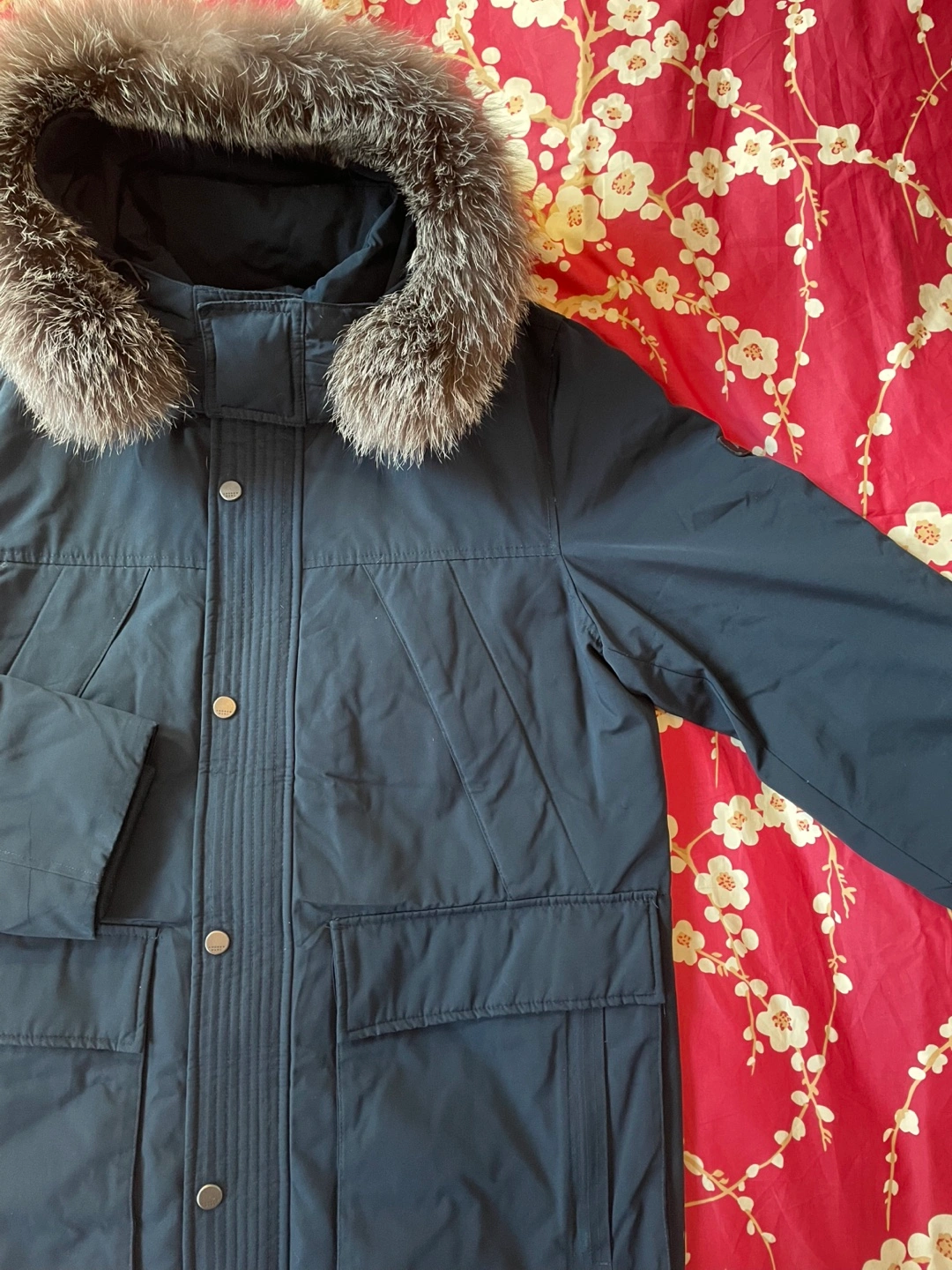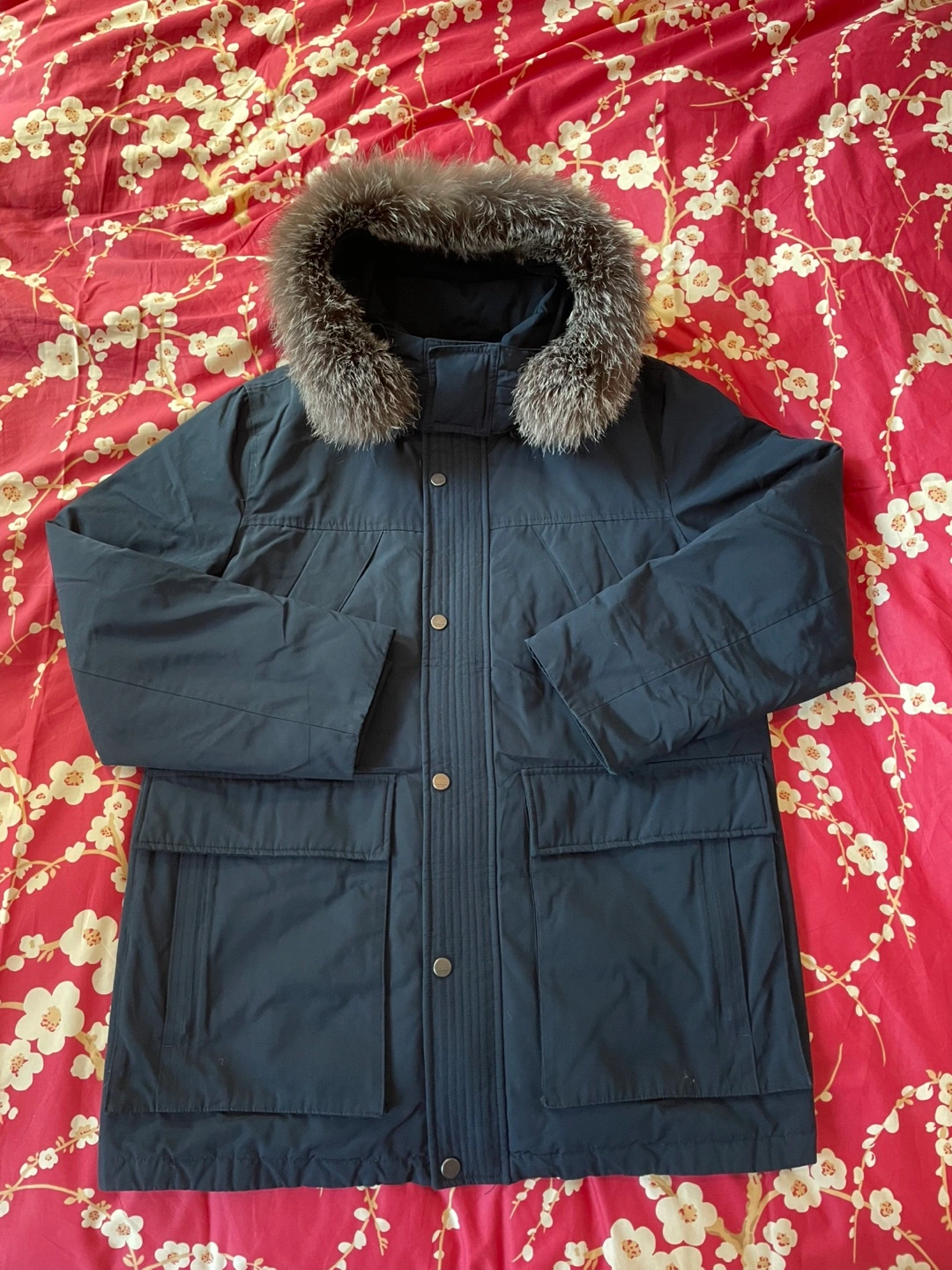 Men's Andrew Marc parka. Size Medium. Features a fur trimmed hood and multiple pockets. Down fill. Made in China. This jacket was worn in just on season. It’s dry cleaned and ready to go. I’m selling it because I was gifted a new one.