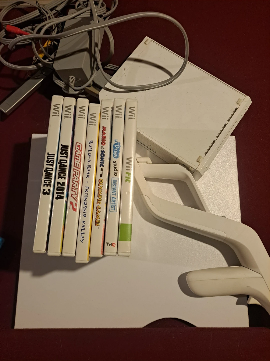 This lot includes a white Nintendo Wii console with its power adapter and AV cables. It comes with several games: Just Dance 3, Just Dance 2014, Game Party 2, Wii Fit, Wii Studio Instant Artist, Mario & Sonic at the Olympic Games, and Wii Fit Plus. A Wii Remote and Nunchuk are also included. This is a great bundle for family fun!