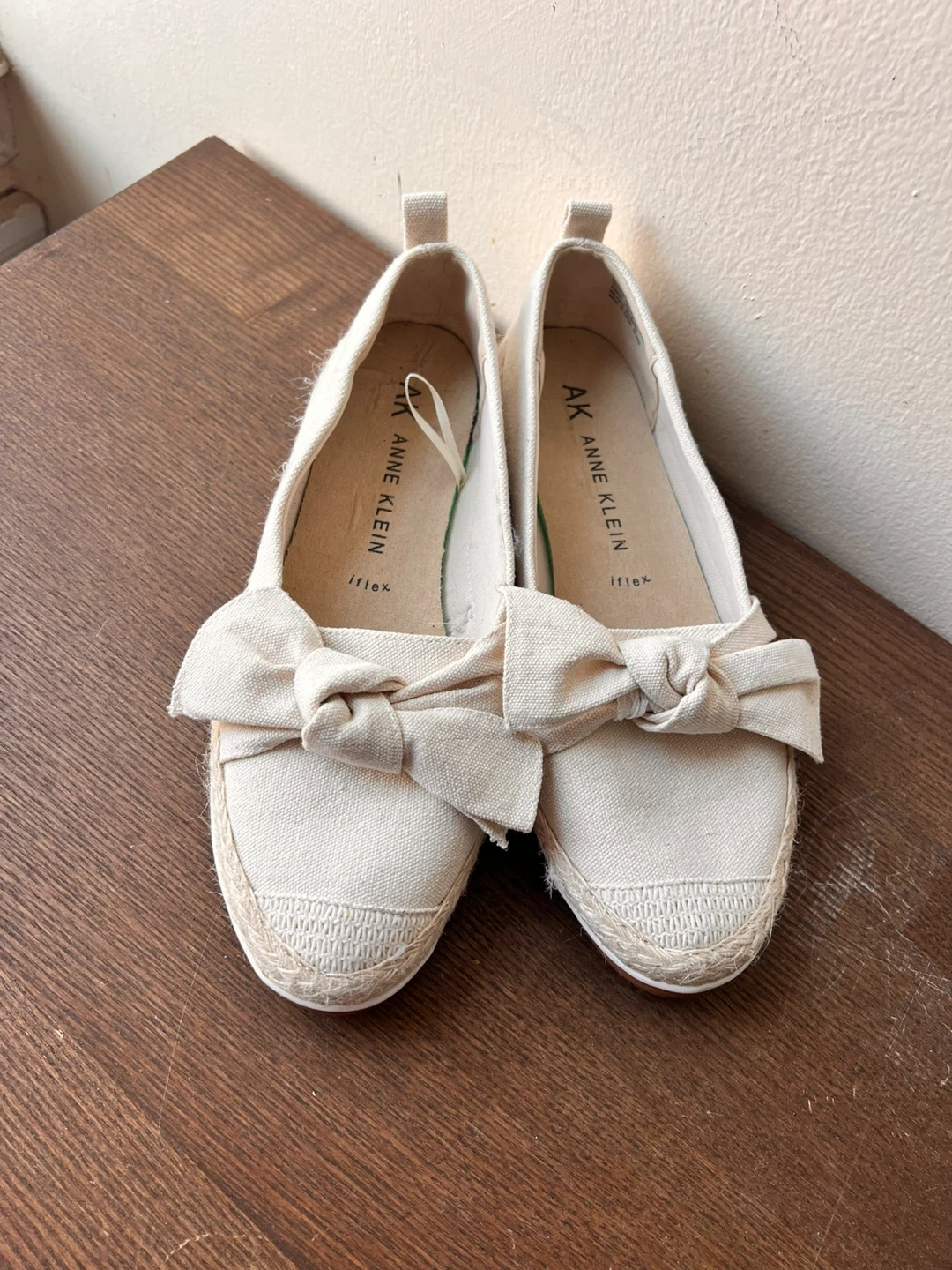These Anne Klein espadrilles are a size 8.5. They feature a cute bow detail on the toe. Casual and comfortable for everyday wear!