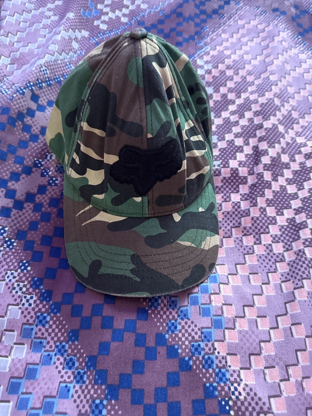 This is a Fox Racing baseball cap in a camouflage pattern. It features a black Fox logo patch on the front. The cap is made of a durable fabric blend. It's a stylish accessory for outdoor activities!