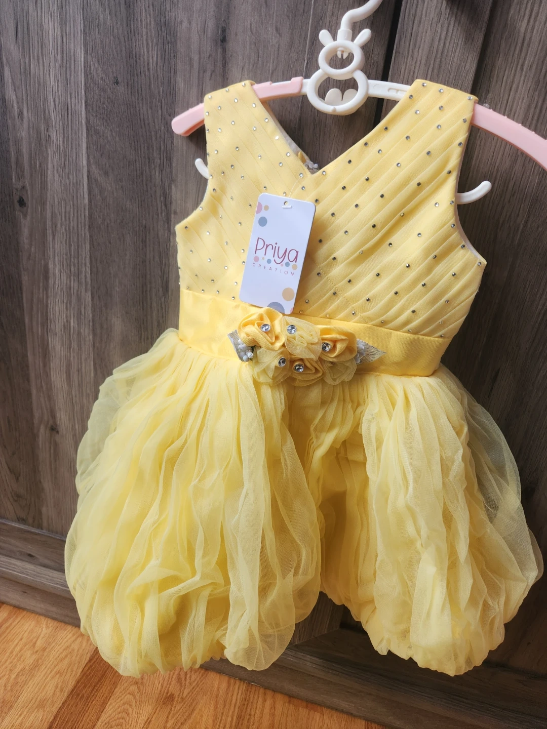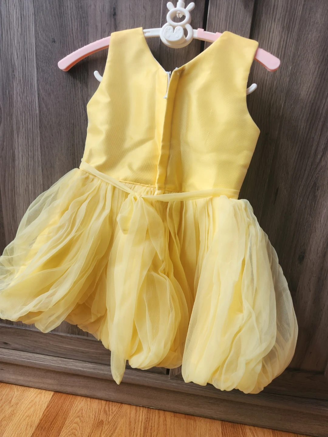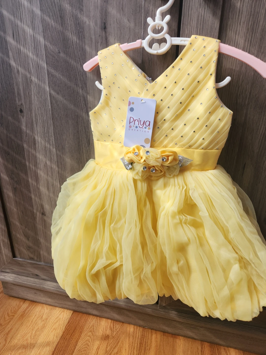 This adorable yellow dress is perfect for any little one. It features a dazzling sparkly bodice and a full tulle skirt. A beautiful floral accent at the waist adds a special touch. Suitable for parties or special occasions!
