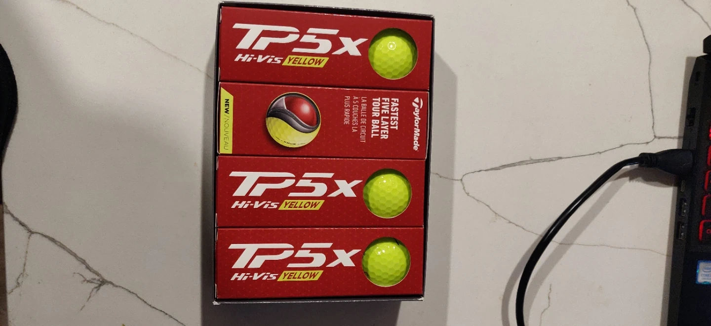 These are TaylorMade TP5x Hi-Vis Yellow 5-layer golf balls. They feature a new speed wrapped core and a four-layer urethane cover for maximum distance and control. This package includes multiple balls for your next round!