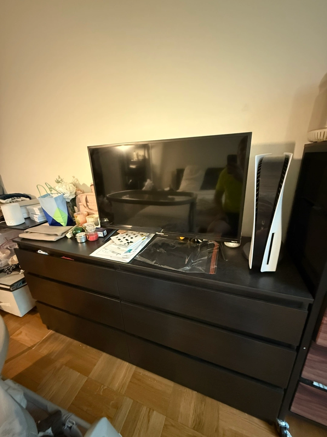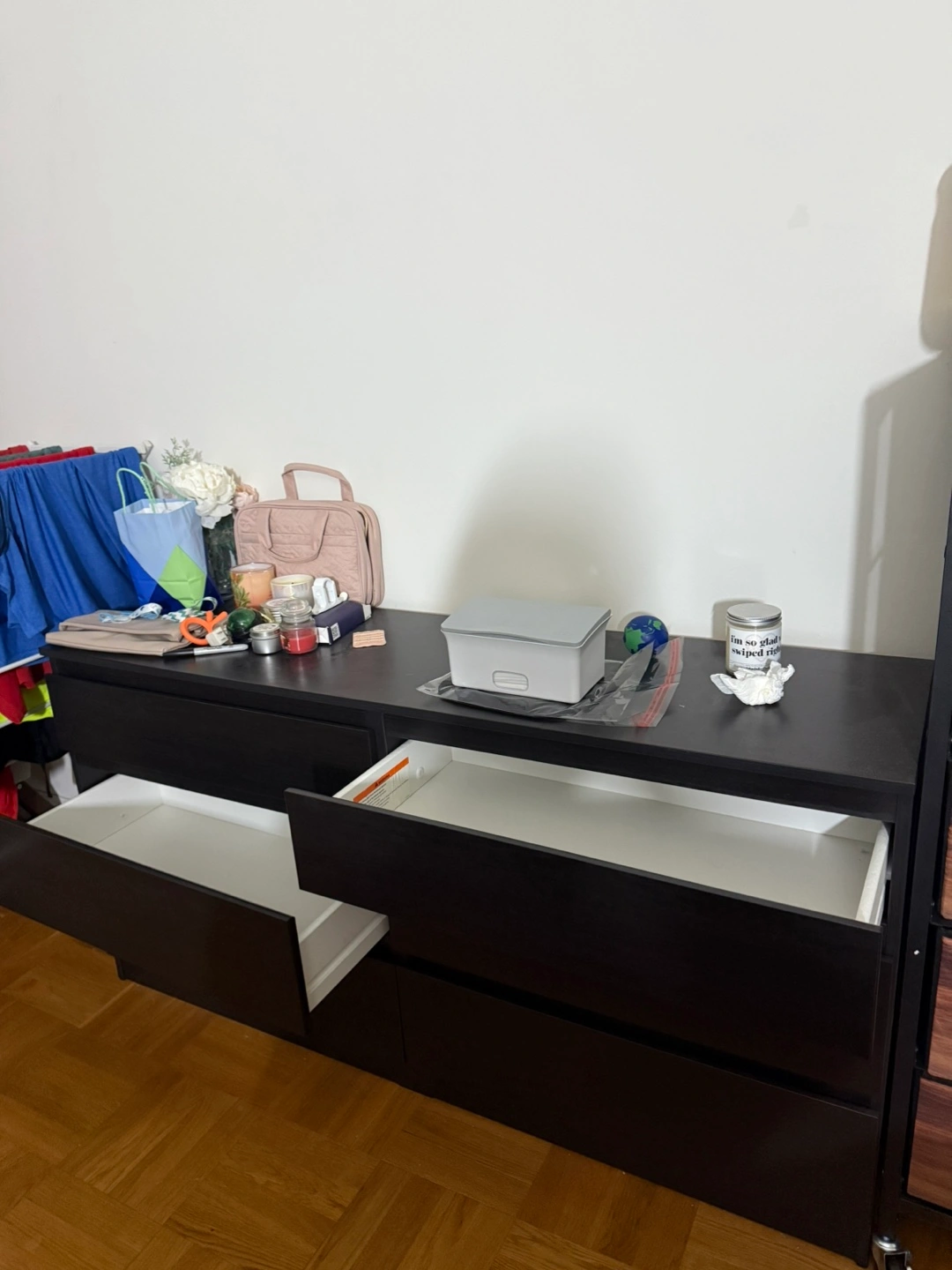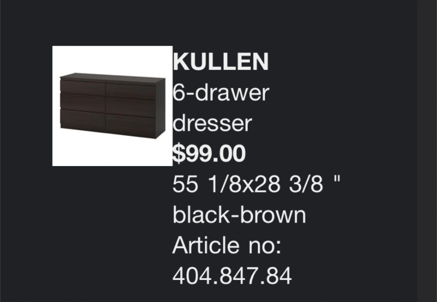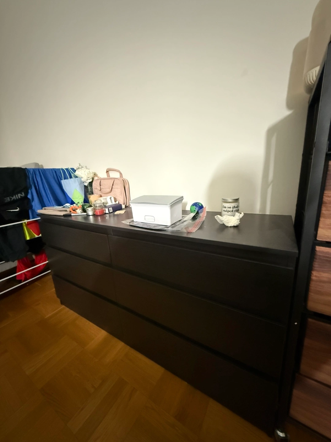 A 6-drawer dresser. Black-brown finish. The dresser is perfect for storing clothes and keeping a tidy space. It offers a lot of storage space, making it a great addition to your bedroom.